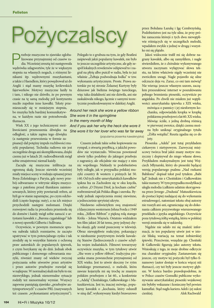Felieton przez Bohdana Łazukę i Igę Cembrzyńską. Podobieństwo jest na tyle silne, że przy próbie zanucenia którejś z tych dwu niewątpliwie różniących się w szczegółach melodii, wpadałem zwykle z jednej w drugą i wszystko mi się plątało. rzeboje muzyczne to zjawisko zgloba- Polegało to z grubsza na tym, że gdy Beatlesi Jakoś widocznie trafił mi się dobrze nalizowane przynajmniej od czasów ra- zaśpiewali jakiś popularny kawałek, nie było grany kawałek, albo się zamyśliłem, i nagle dia. Wcześniej zresztą też następowała to jeszcze szczególnie artystyczne, ale gdy ze- stwierdziłem, że z chóralnie wykonywanego wędrówka szlagwortów, tyle że w większym spół lokalnych rewelersów odśpiewał to i na- utworu zaczynam wyłapywać słowa tekstopniu na własnych nogach, z różnymi lir- grał na płytę albo puścił w radiu, była to już stu, na które właściwie nigdy wcześniej nie nikami itp. wędrownymi muzykantami, właśnie „Żełtaja podwodnaja łodka” w tzw. zwróciłem uwagi. Nagle pojawiło się silne a także z Haendlem, który powędrował aż do wykonaniu artystycznym. Proste. Prawa au- odczucie deja vu. Zaraz, co oni tam mówią? Anglii i stąd mamy muzykę królewskich torskie po tej stronie Żelaznej Kurtyny były Nie wierząc jeszcze własnym uszom, zacząfajerwerków. Motywy muzyczne łaziły tu dziurawe jak bielizna świętego tureckiego, łem przeszukiwać internet w poszukiwaniu i tam, i nikogo nie dziwiło, że po pewnym więc taka działalność ani nie dziwiła, ani nie pełnego brzmienia piosenki, oczywiście po czasie na tę samą melodię pół kontynentu zaskakiwała nikogo, łącznie z samymi teore- angielsku. Po chwili nie miałem już wątplinuciło zupełnie inne kawałki. Teksty prze- tycznie poszkodowanymi w dalekiej Anglii. wości: amerykańska śpiewka z XIX wieku, mieszczały się w mniejszym stopniu, mówiąca o pannicy i jej niesfornym kobo muzyka była bardziej komunikatyw- Around her neck she wore a yellow ribbon chanku, odpowiadała kropka w kropkę na, w każdym razie nie potrzebowała She wore it in the springtime polskiemu przebojowi z lat 60. XX wieku. In the merry month of May tłumacza. Mówiąc ściśle, z jedną drobną różnicą Wiek XX z jego technicznymi moż- And if you ask her why the heck she wore it w pierwszej zwrotce, dzięki czemu możliwościami przenoszenia dźwięku na She wore it for her lover who was far far away na było uniknąć oryginalnego tytułu odległość, a także zapisu tego dźwięku „Żółta wstążka”. Reszta zgadza się co do (a następnie przewożenia w formie zajoty. pisanej) dał potężny impuls ruchliwości muPiosenka „Adela” jest tutaj przykładem Czasem jednak takie sobie kopiowanie na zyki popularnej. Technika radiowa nie jest rympał, z otwartą przyłbicą, z jakichś powo- ciekawym i nietypowym. Zazwyczaj miejszczególnie droga ani skomplikowana, dzięki dów nie wystarczało. Wówczas powstawał scowy twórca brał jakiś znany motyw muczemu już w latach 20. radioodbiornik mógł utwór tylko podobny do jakiegoś przeboju zyczny i dopisywał do niego własne słowa. sobie zmajstrować niemal każdy. z zagranicy, ale oficjalnie nie mający z nim Przykładem maksymalnym jest tutaj WojZaczęła się muzyczna infiltracja na nic wspólnego. Niekiedy te podobieństwa ciech Młynarski, który do piosenki będącej ogromną skalę. Jeszcze niewiele wcześniej były odległe, jak w przypadku polskiej mu- wersją popularnego psalmu „Nad rzekami miały miejsce sceny w rodzaju opisanej przez zyki country & western z późnych lat 50. Babilonu” dopisał tekst pod tytułem „Babi Boya-Żeleńskiego z Paryża, gdy nowy prze- i 60. Od tych niby-amerykańskich kawałków ląd”. Jednak nie z Choińskim i Gałkowskim bój odtwarzano w witrynie sklepu muzycz- tęskna łza za Zachodem się w oku kręciła, takie numery. W tym przypadku modyfikacji nego z patefonu przed tłumkiem zaintere- a refren „O Dżymi Dżoł, ja kocham czebie” uległa melodia (całkiem udatnie skorygowasowanych, którzy póty powtarzali refren, aż rozbrzmiewał jak Polska długa i szeroka. By- na przez Jerzego „Dudusia” Matuszkiewicza byli go w stanie zapamiętac, po czym odcho- wały jednak zapożyczenia mniej niewinne, do postaci lepiej nadającej się do wykonania dzili (często kupując nuty), a na ich miejsce a jednocześnie sprytniej ukryte. estradowego), natomiast tekstu obaj autorzy przychodzili następni melomani. Dzięki Niedawno odświeżyłem swą znajomość nie ruszyli ani-ani, ograniczając się do dokorozwojowi radia ta procedura przeniosła się z klasycznym westernem Johna Forda z 1949 nania całkiem przyzwoitego wierszowanego do domów i każdy mógł sobie zanucić z ar- roku, „Yellow Ribbon” z piękną rolą starego przekładu z języka angielskiego. Oczywiście tystami kawałek z „Barona cygańskiego” lub Króla – Johna Wayne’a. Ostatnio widziałem poza tytułową żółtą wstążką, która w polskiej z nowej operetki Gilberta i Sullivana. ten film jakieś 20 lat temu, przy jedynej chy- wersji zmieniła się w sukienkę. Oczywiście, w pewnym momencie spra- ba okazji, gdy został puszczony w telewizji. Nigdzie nie udało mi się znaleźć inforwa nabrała takich rozmiarów, że zaczęto Obraz niewątpliwie reakcyjny, pokazujący macji, że ten popularny utwór jest w istoupatrywać w tym potencjalnego zysku i tak w niesłusznie pozytywnym świetle kawale- cie bliską wariacją na temat żołnierskiej zrodziły się te wszystkie historie z ochroną rię Stanów Zjednoczonych z czasów schył- śpiewki. Przeciwnie, wszędzie pp. Choiński praw autorskich do popularnych śpiewek, ku wojen indiańskich. Filmowi towarzyszy & Gałkowski figurują jako autorzy tekstu. z czym borykamy się do dziś. Jednak obok oczywiście muzyka, w tym tytułowy utwór Wnioskuję z tego, że moje drobne odkrycie publicznego i domowego odtwarzania mu- „She wo