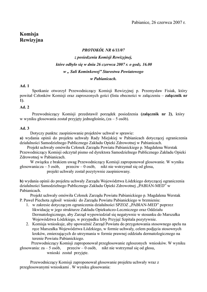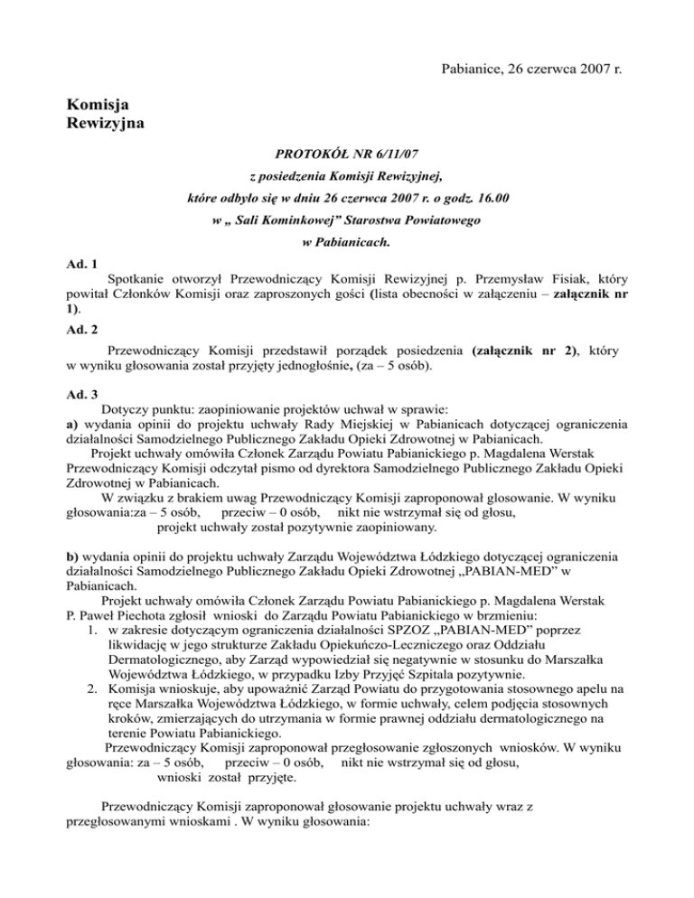 Pabianice, 26 czerwca 2007 r. Komisja Rewizyjna PROTOKÓŁ NR 6/11/07 z posiedzenia Komisji Rewizyjnej, które odbyło się w dniu 26 czerwca 2007 r. o godz. 16.00 w „ Sali Kominkowej” Starostwa Powiatowego w Pabianicach. Ad. 1 Spotkanie otworzył Przewodniczący Komisji Rewizyjnej p. Przemysław Fisiak, który powitał Członków Komisji oraz zaproszonych gości (lista obecności w załączeniu – załącznik nr 1). Ad. 2 Przewodniczący Komisji przedstawił porządek posiedzenia (załącznik nr 2), który w wyniku głosowania został przyjęty jednogłośnie, (za – 5 osób). Ad. 3 Dotyczy punktu: zaopiniowanie projektów uchwał w sprawie: a) wydania opinii do projektu uchwały Rady Miejskiej w Pabianicach dotyczącej ograniczenia działalności Samodzielnego Publicznego Zakładu Opieki Zdrowotnej w Pabianicach. Projekt uchwały omówiła Członek Zarządu Powiatu Pabianickiego p. Magdalena Werstak Przewodniczący Komisji odczytał pismo od dyrektora Samodzielnego Publicznego Zakładu Opieki Zdrowotnej w Pabianicach. W związku z brakiem uwag Przewodniczący Komisji zaproponował glosowanie. W wyniku głosowania:za – 5 osób, przeciw – 0 osób, nikt nie wstrzymał się od głosu, projekt uchwały został pozytywnie zaopiniowany. b) wydania opinii do projektu uchwały Zarządu Województwa Łódzkiego dotyczącej ograniczenia działalności Samodzielnego Publicznego Zakładu Opieki Zdrowotnej „PABIAN-MED” w Pabianicach. Projekt uchwały omówiła Członek Zarządu Powiatu Pabianickiego p. Magdalena Werstak P. Paweł Piechota zgłosił wnioski do Zarządu Powiatu Pabianickiego w brzmieniu: 1. w zakresie dotyczącym ograniczenia działalności SPZOZ „PABIAN-MED” poprzez likwidację w jego strukturze Zakładu Opiekuńczo-Leczniczego oraz Oddziału Dermatologicznego, aby Zarząd wypowiedział się negatywnie w stosunku do Marszałka Województwa Łódzkiego, w przypadku Izby Przyjęć Szpitala pozytywnie. 2. Komisja wnioskuje, aby upoważnić Zarząd Powiatu do przygotowania stosownego apelu na ręce Marszałka Województwa Łódzkiego, w formie uchwały, celem podjęcia stosownych kroków, zmierzających do utrzymania w formie prawnej oddziału dermatologicznego na terenie Powiatu Pabianickiego. Przewodniczący Komisji zaproponował przegłosowanie zgłoszonych wniosków. W wyniku głosowania: za – 5 osób, przeciw – 0 osób, nikt nie wstrzymał się od głosu, wnioski został przyjęte. Przewodniczący Komisji zaproponował głosowanie projektu uchwały wraz z przegłosowanymi wnioskami . W wyniku głosowania: za – 5 osób, przeciw – 0 osób, nikt nie wstrzymał sie od głosu projekt uchwały został pozytywnie zaopiniowany. c) zmiany Regulaminu wynagradzania nauczycieli szkół i placówek oświatowych przez Powiat pabianicki w roku 2007. Projekt uchwały omówił Członek Zarządu Powiatu Pabianickiego p. Tadeusz Rosiak W związku z brakiem uwag Przewodniczący Komisji zaproponował głosowanie. W wyniku głosowania: za - 5 osób, przeciw - 0 osób, nikt nie wstrzymał się od głosu, projekt uchwały został pozytywnie zaopiniowany. d) określenia szczegółowych zasad i trybu umarzania, odraczania lub rozkładania na raty spłat należności pieniężnych do których nie stosuje się ustawy – Ordynacja podatkowa. Projekt uchwały omówiła Skarbnik Powiatu Pabianickiego p. Elżbieta Piekielniak. W związku z brakiem uwag Przewodniczący Komisji zaproponował głosowanie. W wyniku głosowania: za - 5 osób, przeciw - 0 osób, nikt nie wstrzymał się od głosu, projekt uchwały został pozytywnie zaopiniowany. e) zmian budżetu Powiatu Pabianickiego na 2007 rok (kwota 500 000 zł) Projekt uchwały wraz z autopoprawką omówiła Skarbnik Powiatu Pabianickiego p. Elżbieta Piekielniak. W związku z brakiem uwag Przewodniczący Komisji zaproponował głosowanie. W wyniku głosowania: za - 5 osób, przeciw- 0 osób, nikt nie wstrzymał się od głosu, projekt uchwały został pozytywnie zaopiniowany. f) zmian budżetu Powiatu Pabianickiego na 2007 rok (kwota 10 000 zł). Projekt uchwały omówiła Skarbnik Powiatu Pabianickiego p. Elżbieta Piekielniak. W związku z brakiem uwag Przewodniczący Komisji zaproponował głosowanie. W wyniku głosowania: za - 4 osoby, przeciw - 0 osób, wstrzymała się – 1 osoba, projekt uchwały został pozytywnie zaopiniowany. g) zmian budżetu Powiatu Pabianickiego na 2007 rok (kwota 90 000 zł) Projekt uchwały omówiła Skarbnik Powiatu Pabianickiego p. Elżbieta Piekielniak. W związku z brakiem uwag Przewodniczący Komisji zaproponował głosowanie. W wyniku głosowania: za - 5 osób, przeciw - 0 osób, nikt nie wstrzymał się od głosu, projekt uchwały został pozytywnie zaopiniowany. h) aktualizacji Wieloletniego Programu Inwestycyjnego dla Powiatu Pabianickiego na lata 20042007 Projekt uchwały omówiła Skarbnik Powiatu Pabianickiego p. Elżbieta Piekielniak. W związku z brakiem uwag Przewodniczący Komisji zaproponował głosowanie. W wyniku głosowania: za - 5 osób, przeciw - 0 osób, nikt nie wstrzymał się od głosu, projekt uchwały został pozytywnie zaopiniowany. i) zmian budżetu Powiatu Pabianickiego na rok 2007 w związku z realizacja projektu „przebudowa ulicy Rypułtowickiej” Projekt uchwały omówiła Skarbnik Powiatu Pabianickiego p. Elżbieta Piekielniak P. Paweł Piechota zapytał, czy dodatkowe koszty są wynikiem procedury przetargowej ? P. Skarbnik odpowiedziała, iż nowy wydział ds. inwestycji i remontów oraz inżynier kontraktu orzekli, że mogą ulec zwiększeniu koszty inwestycji. W związku z brakiem dalszych uwag Przewodniczący Komisji zaproponował głosowanie. W wyniku głosowania: za - 5 osób, przeciw - 0 osób, nikt nie wstrzymał się od głosu, projekt uchwały został pozytywnie zaopiniowany. j) zmiany Uchwały Nr VII/55/07 Rady Powiatu Pabianickiego z dnia 29 marca 2007 roku w sprawie określenia zadań i wysokości środków na ich realizację w 2007 roku, otrzymanych z 