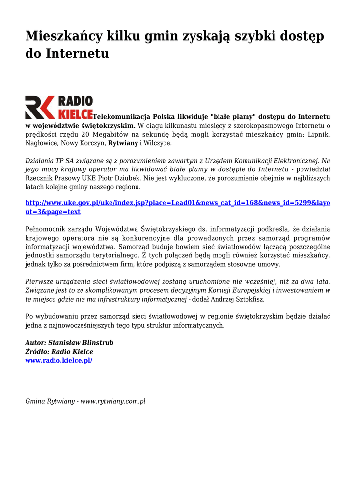 Mieszkańcy kilku gmin zyskają szybki dostęp do Internetu Telekomunikacja Polska likwiduje "białe plamy" dostępu do Internetu w województwie świętokrzyskim. W ciągu kilkunastu miesięcy z szerokopasmowego Internetu o prędkości rzędu 20 Megabitów na sekundę będą mogli korzystać mieszkańcy gmin: Lipnik, Nagłowice, Nowy Korczyn, Rytwiany i Wilczyce. Działania TP SA związane są z porozumieniem zawartym z Urzędem Komunikacji Elektronicznej. Na jego mocy krajowy operator ma likwidować białe plamy w dostępie do Internetu - powiedział Rzecznik Prasowy UKE Piotr Dziubek. Nie jest wykluczone, że porozumienie obejmie w najbliższych latach kolejne gminy naszego regionu. http://www.uke.gov.pl/uke/index.jsp?place=Lead01&news_cat_id=168&news_id=5299&layo ut=3&page=text Pełnomocnik zarządu Województwa Świętokrzyskiego ds. informatyzacji podkreśla, że działania krajowego operatora nie są konkurencyjne dla prowadzonych przez samorząd programów informatyzacji województwa. Samorząd buduje bowiem sieć światłowodów łączącą poszczególne jednostki samorządu terytorialnego. Z tych połączeń będą mogli również korzystać mieszkańcy, jednak tylko za pośrednictwem firm, które podpiszą z samorządem stosowne umowy. Pierwsze urządzenia sieci światłowodowej zostaną uruchomione nie wcześniej, niż za dwa lata. Związane jest to ze skomplikowanym procesem decyzyjnym Komisji Europejskiej i inwestowaniem w te miejsca gdzie nie ma infrastruktury informatycznej - dodał Andrzej Sztokfisz. Po wybudowaniu przez samorząd sieci światłowodowej w regionie świętokrzyskim będzie działać jedna z najnowocześniejszych tego typu struktur informatycznych. Autor: Stanisław Blinstrub Źródło: Radio Kielce www.radio.kielce.pl/ Gmina Rytwiany - www.rytwiany.com.pl