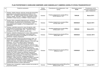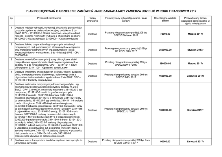 PLAN POSTĘPOWAŃ O UDZIELENIE ZAMÓWIEŃ JAKIE ZAMAWIAJACY ZAMIERZA UDZIELIĆ W ROKU FINANSOWYM 2017 Lp 1 2 3 4 5 6 Przedmiot zamówienia Rodzaj zmówienia Przewidywany tryb postępowania / znak sprawy Orientacyjna wartość brutto Przewidywany termin wszczęcia postepowania w ujęciu miesięcznym Dostawa odzieży roboczej, ochronnej, obuwia dla pracowników gospodarczych oraz bielizny dziecięcej wg dodatku nr 2 do SIWZ. CPV – 18100000-0 Odzież branżowa, specjalna odzież robocza i dodatki; 18813000-1 Obuwie z cholewkami ze skóry; 18400000-3 Odzież robocza; 33199000-1 Odzież medyczna Dostawa Przetarg nieograniczony poniżej 209 tys SPZOZ Bielizna / 2017 72000,00 Marzec 2017r Dostawa: leków, preparatów diagnostycznych, substancji recepturowych i art. pomocniczych stosowanych w recepturze oraz materiałów opatrunkowych wg asortymentów i ilości wyszczególnionych w dodatku nr. 2 do niniejszej SIWZ - CPV 33600000-6 Dostawa Przetarg nieograniczony powyżej 209tys SP ZOZ LEKI / 2017 3500000,00 Styczeń 2017r Dostawa: materiałów szewnych tj: szwy chirurgiczne, siatki przepuklinowe wg asortymentu i ilości wyszczególnionych w dodatku nr 2 do niniejszej SIWZ. CPV – 33141121-4 Szwy chirurgiczne; 33141100-1 Opatrunki, zaciski, szwy Dostawa Przetarg nieograniczony poniżej 209tys SPZOZ SZWY / 2017 190000,00 Marzec 2017r Dostawa implantów ortopedycznych tj: śruby, wkręty, gwoździe, płytki, endoprotezy stawu biodrowego, kolanowego wraz z użyczeniem instrumentarium wg dodatku nr 2 do SIWZ. CPV – 33183100-7 Implanty ortopedyczne Dostawa Przetarg nieograniczony powyżej 209 tys SPZOZ IMP / 2017 1600000,00 Czerwiec 2017r Dostawa materiałów medycznych jednorazowego użytku wg asortymentów i ilości wyszczególnionych w dodatku nr. 2 do SIWZ. CPV- 33140000-3 materiały medyczne ; 33141320-9 igły medyczne ; 33157100-6 maski do gazów medycznych; 33141200-2 cewniki ; 33141220-8 kaniula; 33141240-4 akcesoria cewnikowe; 33141310-6 strzykawki; 33141321-6 igły do znieczulania; 33141324-7 igły do dializy; 33141411-4 skalpele i noże chirurgiczne; 33141420-0 rękawice chirurgiczne; 33424300-0 rękawice jednorazowe; 33141600-6 zbiorniki i torby do gromadzenia płynów ustrojowych, dreny i zestawy; 331416154 pojemniki na mocz; 33141641-5 sondy; 33157110-9 maski tlenowe; 33171300-2 zestawy do znieczuleń miejscowych; 33181200-4 filtry do dializy; 32354110-3 klisza rentgenowska; 22993200-9 papier termoczuły; 33141640-8 dreny; 33194120-3 artykuły do infuzji; 33141625-7 zestawy diagnostyczne; 33199000-1 odzież medyczna; 33192500-7 probówki; 331413003 urządzenia do nakłuwania żył, pobierania krwi; 33141620-2 zestawy medyczne; 33141621-9 zestawy używane w przypadku nietrzymania moczu; 33141641-5 sondy; 39518200-8 prześcieradła używane na salach operacyjnych Dostawa Przetarg nieograniczony powyżej 209 tys SPZOZ JU / 2017 1350000,00 Sierpień 2017r Dostawa wraz z transportem środków czystości oraz sprzętu do utrzymania czystości Dostawa Przetarg nieograniczony poniżej 209 tys Euro SPZOZ CZYST / 2017 90000,00 Listopad 2017r Dostawa artykułów spożywczych wg dodatku nr 2 do niniejszej SIWZ. CPV – 15800000-6 Różne produkty spożywcze; 15811000-6 Pieczywo; 15510000-6 Mleko i śmietana; 152200006 Ryby mrożone, filety rybne i pozostałe mięso ryb; 15112000-6 Drób; 15131100-6 Produkty mięsno-wędliniarskie Dostawa Przetarg nieograniczony poniżej 209 tys Euro SPZOZ SPOZ / 2017 350000,00 Listopad 2017r Świadczenie usług w zakresie transportu sanitarnego pacjentów, krwi, preparatów krwiopochodnych i materiałów biologicznych dla Samodzielnego Publicznego Zakładu Opieki Zdrowotnej w Sokółce Usługa Przetarg nieograniczony poniżej 209 tys Euro SPZOZ TRANSPORT / 2017 270000,00 Listopad 2017r Dostawa: Krążków do antybiogramów ,odczynników monoklonalnych, odczynników do analizy równowagi kwasowozasadowej Corning 248, odczynników do analizatora jonoselektywnego Rapidchem 744, odczynników serologicznych, , odczynnik Giemsy , zestawów do rozdziału elektroforetycznego białek surowicy, odczynników bakteriologicznych, szczepów wzorcowych wraz z zestawem do ich przechowywania, płynne odczynniki bakteriologiczne, testów do oznaczeń boreliozay, probówek Dostawa Przetarg nieograniczony poniżej 209 tys euro SPZOZ LAB1 / 2017 220000,00 Lipiec 2017r 10 Dostawę pasków do oznaczania moczu wraz z dzierżawą analizatora /czytnika i zestawu komputerowego wraz z zainstalowaniem i przeszkoleniem personelu w zakresie obsługi w niezbędnej liczbie osób Dostawa Przetarg nieograniczony poniżej 209 tys euro SPZOZ LAB2 / 2017 23000,00 Wrzesień 2017r 11 Bezgotówkowy zakup paliw płynnych na terenie miasta Sokółka tj. oleju napędowego i etyliny Pb 95. Dostawa Przetarg nieograniczony poniżej 209 tys SPZOZ PALIWA / 2017 130000,00 Październik 2017r 12 Dostawa podłoży oraz odczynników mikrobiologicznych, wraz z dzierżawą automatycznego analizatora do identyfikacji i oznaczania lekowrażliwości drobnoustrojów z oprogramowaniem (licencja). Dostawa Przetarg nieograniczony poniżej 209 tys SPZOZ LAB3 / 2017 260000,00 Marzec 2017 Dostawa Przetarg nieograniczony poniżej 209 tys euro SPZOZ GAZ / 2017 230000,00 Luty 2017 7 8 9 13 Dostawa gazów medycznych oraz technicznych wraz z transportem i dzierżawą butli oraz dzierżawa zbiornika na tlen medyczny ciekły o pojemności 6100kg (tolerancja /-15%) Sporządził: 16.01.2017r Andrzej Dowgiert Zatwierdził: Dyrektora SPZOZ w Sokółce Jerzy Kułakowski