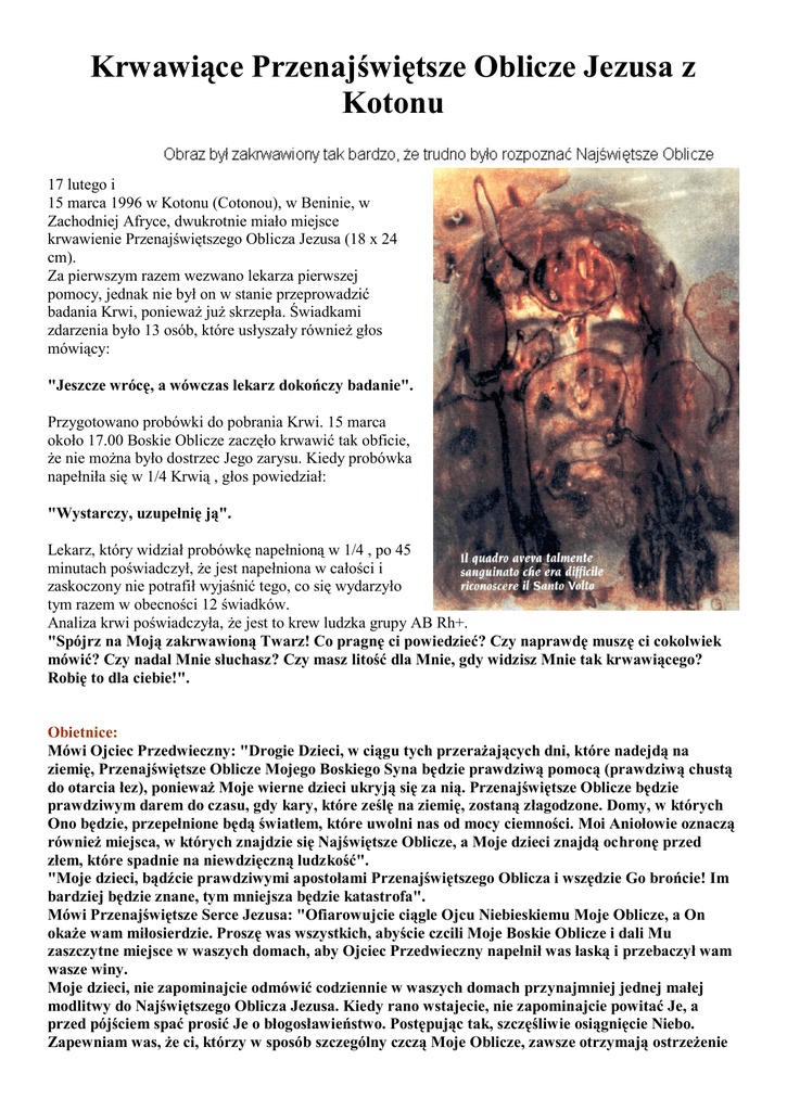 Krwawiące Przenajświętsze Oblicze Jezusa z Kotonu 17 lutego i 15 marca 1996 w Kotonu (Cotonou), w Beninie, w Zachodniej Afryce, dwukrotnie miało miejsce krwawienie Przenajświętszego Oblicza Jezusa (18 x 24 cm). Za pierwszym razem wezwano lekarza pierwszej pomocy, jednak nie był on w stanie przeprowadzić badania Krwi, ponieważ już skrzepła. Świadkami zdarzenia było 13 osób, które usłyszały również głos mówiący: "Jeszcze wrócę, a wówczas lekarz dokończy badanie". Przygotowano probówki do pobrania Krwi. 15 marca około 17.00 Boskie Oblicze zaczęło krwawić tak obficie, że nie można było dostrzec Jego zarysu. Kiedy probówka napełniła się w 1/4 Krwią , głos powiedział: "Wystarczy, uzupełnię ją". Lekarz, który widział probówkę napełnioną w 1/4 , po 45 minutach poświadczył, że jest napełniona w całości i zaskoczony nie potrafił wyjaśnić tego, co się wydarzyło tym razem w obecności 12 świadków. Analiza krwi poświadczyła, że jest to krew ludzka grupy AB Rh+. "Spójrz na Moją zakrwawioną Twarz! Co pragnę ci powiedzieć? Czy naprawdę muszę ci cokolwiek mówić? Czy nadal Mnie słuchasz? Czy masz litość dla Mnie, gdy widzisz Mnie tak krwawiącego? Robię to dla ciebie!". Obietnice: Mówi Ojciec Przedwieczny: "Drogie Dzieci, w ciągu tych przerażających dni, które nadejdą na ziemię, Przenajświętsze Oblicze Mojego Boskiego Syna będzie prawdziwą pomocą (prawdziwą chustą do otarcia łez), ponieważ Moje wierne dzieci ukryją się za nią. Przenajświętsze Oblicze będzie prawdziwym darem do czasu, gdy kary, które ześlę na ziemię, zostaną złagodzone. Domy, w których Ono będzie, przepełnione będą światłem, które uwolni nas od mocy ciemności. Moi Aniołowie oznaczą również miejsca, w których znajdzie się Najświętsze Oblicze, a Moje dzieci znajdą ochronę przed złem, które spadnie na niewdzięczną ludzkość". "Moje dzieci, bądźcie prawdziwymi apostołami Przenajświętszego Oblicza i wszędzie Go brońcie! Im bardziej będzie znane, tym mniejsza będzie katastrofa". Mówi Przenajświętsze Serce Jezusa: "Ofiarowujcie ciągle Ojcu Niebieskiemu Moje Oblicze, a On okaże wam miłosierdzie. Proszę was wszystkich, abyście czcili Moje Boskie Oblicze i dali Mu zaszczytne miejsce w waszych domach, aby Ojciec Przedwieczny napełnił was łaską i przebaczył wam wasze winy. Moje dzieci, nie zapominajcie odmówić codziennie w waszych domach przynajmniej jednej małej modlitwy do Najświętszego Oblicza Jezusa. Kiedy rano wstajecie, nie zapominajcie powitać Je, a przed pójściem spać prosić Je o błogosławieństwo. Postępując tak, szczęśliwie osiągnięcie Niebo. Zapewniam was, że ci, którzy w sposób szczególny czczą Moje Oblicze, zawsze otrzymają ostrzeżenie przed niebezpieczeństwem i katastrofami! Uroczyście obiecuję, że ci, którzy szerzą kult Mojego Najświętszego Oblicza, nie doznają kary, która spadnie na ludzkość. Otrzymają oni również światło w dniach strasznego zamętu, który zbliża się do Kościoła. Jeżeli umrą w czasie kary, to umrą jako męczennicy i zostaną świętymi. Zaprawdę, zaprawdę powiadam wam: Ci, którzy szerzą kult Mojego Przenajświętszego Oblicza, dostąpią tej łaski, że żaden z członków ich rodziny nie zostanie potępiony, a ci, którzy są w Czyśćcu, zostaną z niego uwolnieni. Wszyscy jednak przychodźcie do Mnie przez wstawiennictwo Mojej Najświętszej Matki!". Wszyscy, którzy poświęcili się Mojemu Przenajświętszemu Obliczu otrzymają wielkie światło zrozumienia dni ostatecznych. W Niebie będą bardzo blisko Zbawiciela. Wszystkie te łaski otrzymają za swoje poświęcenie Najświętszemu Obliczu. Nie traćcie tych łask, bo łatwo jest je stracić! Marzec 1999 - Nasza kochana Matka Boża prosi żarliwie, aby to Najświętsze Oblicze doznało jak najszybszej czci we wszystkich domach przez modlitwę i kontemplację, aby Ona mogła jeszcze ocalić nas od większej części surowej kary, która nas czeka. Źródło: 1) http://feastofdivinemercy.com/page/g-il-volto-sanguinante-di-gesu.asp 2) http://www.entraevedi.org/Il%20Volto%20Santo.htm 3) http://web246m.dynamickunden.ch/maria/rosa.mystica.html#Das%20blutende%20Heilige%20Antlitz%20von%20Cotonou Komentarz: Krew grupy Ab Rh+ która cudownie pokazała się na Obliczu Jezusa z Kotonu jest identyczna z tą na Obliczu Jezusa z całunu turyńskiego, co świadczy na korzyść autentyczności cudu. Oblicze Jezusa z Kotonu jest malarską reprodukcją Oblicza Jezusa z całunu turyńskiego który przykrywał Jezusa, można to poznać chociażby po kształcie plamy krwi na czole. Cechą wspólną tych obrazów jest nabrzmiała prawa część twarzy (patrząc oczami Jezusa), co bardziej uwydatnia powyższy obraz, również Oblicze Jezusa na chuście z Manopello, która przykrywała twarz Jezusa (rewers-odbicie lustrzane) wykazuje taką cechę. Nabrzmienie prawej części twarzy powstało w wyniku biczowania co potwierdza Jezus w objawieniu „Prawdziwe Życie w Bogu” - Orędzie 7.08.87: Vassula: – Jezu? Jezus: – Jestem. Vassula: Jezus przedstawiał mi obrazy ze Swego Biczowania, nabrzmiałą prawą stronę Swej Twarzy. Znowu poczułam się załamana. Jezus: – Vassulo, tak was kocham wszystkich! Fragmenty objawienia „Prawdziwe Życie w Bogu”, w których Jezus potwierdza również autentyczność Swojego Oblicza z całunu turyńskiego: http://www.duchprawdy.com/calunturynski.htm • Patrz też szczegółową analizę wizerunku • Modlitwy do Najświętszego Oblicza Jezusa Chrystusa Chwała, cześć i dziękczynienie Najświętszemu Obliczu Jezusa, które jest źródłem nadziei i zwycięstwa na ziemi oraz wiecznej chwały w niebie. Ps 105:3-5 ...niech się weseli serce szukających Pana! Rozmyślajcie o Panu i Jego potędze, szukajcie zawsze Jego oblicza! Pamiętajcie o cudach, które On zdziałał, o Jego znakach i sądach ust Jego, (BT) Źródło: http://www.duchpra