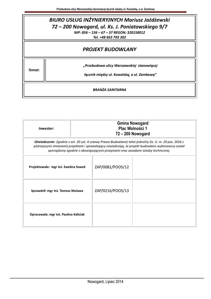 Przebudowa ulicy Warszawskiej stanowiącej łącznik między ul. Kowalską, a ul. Zamkową BIURO USŁUG INŻYNIERYJNYCH Mariusz Jażdżewski 72 – 200 Nowogard, ul. Ks. J. Poniatowskiego 9/7 NIP: 856 – 156 – 67 – 37 REGON: 320158012 Tel. +48 663 792 302 PROJEKT BUDOWLANY „Przebudowa ulicy Warszawskiej stanowiącej Temat: łącznik między ul. Kowalską, a ul. Zamkową” BRANŻA SANITARNA Inwestor: Gmina Nowogard Plac Wolności 1 72 – 200 Nowogard Oświadczenie: Zgodnie z art. 20 ust. 4 ustawy Prawo Budowlane( tekst jednolity Dz. U. nr. 20 poz. 2016 z późniejszymi zmianami) projektant i sprawdzający oświadczają, że projekt budowlano wykonawczy został sporządzony zgodnie z obowiązującymi przepisami oraz zasadami wiedzy technicznej. Projektowała: mgr inż. Ewelina Szwed ZAP/0081/POOS/12 Sprawdził: mgr inż. Tomasz Mulawa ZAP/0216/POOS/13 Opracowała: mgr inż. Paulina Kaliciak Nowogard, Lipiec 2014 Przebudowa ulicy Warszawskiej stanowiącej łącznik między ul. Kowalską, a ul. Zamkową BIURO USŁUG INŻYNIERYJNYCH Mariusz Jażdżewski 72 – 200 Nowogard, ul. Ks. J. Poniatowskiego 9/7 NIP: 856 – 156 – 67 – 37 REGON: 320158012 Tel. +48 663 792 302 INFORMACJA BIOZ „Przebudowa ulicy Warszawskiej stanowiącej Temat: łącznik między ul. Kowalską, a ul. Zamkową” BRANŻA SANITARNA Inwestor: Opracował: mgr inż. Ewelina Szwed Gmina Nowogard Plac Wolności 1 72 – 200 Nowogard ZAP/0081/POOS/12 Nowogard, Lipiec 2014 Przebudowa ulicy Warszawskiej stanowiącej łącznik między ul. Kowalską, a ul. Zamkową ZAWARTOŚĆ OPRACOWANIA Opis techniczny 1. Podstawa opracowania 2. Zakres i cel opracowania 3. Opis rozwiązań projektowych 4. Technologia i warunki techniczne wykonania robót 5. Badanie szczelności Informacja BIOZ Zawartość formalno - prawna 1. Kopia uprawnień i zaświadczeń z Izby 2. Warunki techniczne – kanalizacja deszczowa znak GKMiOŚ.7021.35.2014.AW Spis rysunków Rys. 1 - Plan sytuacyjny – kanalizacja deszczowa Rys. 2 –Profil podłużny kanalizacji deszczowej, schemat studzienki kanalizacyjnej inspekcyjnej PRO600 oraz szczegół wpustu deszczowego Rys. 3 –Szczegół studni betonowej DN1200 mm Nowogard, Lipiec 2014 Przebudowa ulicy Warszawskiej stanowiącej łącznik między ul. Kowalską, a ul. Zamkową OPIS TECHNICZNY „Przebudowa ulicy Warszawskiej stanowiącej łącznik między ul. Kowalską, a ul. Zamkową” 1. Podstawa opracowania Umowa z Inwestorem , Mapa do celów projektowych w skali 1:500 opracowana przez Usługi Geodezyjne "PLAN" Paweł Szarek w Nowogardzie; Uzgodnienia z Zamawiającym, Wizja lokalna w terenie wykonana przez wykonawcę umowy, Biuro Usług Inżynieryjnych Mariusz Jażdżewski 2. Zakres i cel opracowania Planowane przedsięwzięcie stanowi inwestycję drogową pn.: „Przebudowa ulicy Warszawskiej stanowiącej łącznik między ul. Kowalską, a ul. Zamkową”. Inwestorem zadania jestGmina Nowogard. Teren objęty zakresem opracowania zlokalizowany jest na działkach geodezyjnych nr237/2, 235/4, 239 obręb geodezyjny Nowogard – 3.Właścicielem działki jest Gmina Nowogard. Realizacja inwestycji ma na celu: remont i przebudowa istniejącej nawierzchni jezdni, chodników oraz miejsc postojowych. Przebudowę ist. wpustów deszczowych kanalizacji deszczowej i lamp oświetleniowych Roboty nawierzchniowe w obrębie pasa jezdni mają na celu poprawę nośności oraz jakości nawierzchni. Pozwoli to na zwiększenie komfortu poruszających się po drodze pojazdów co wpłynie wydatnie na poprawę bezpieczeństwa użytkowników ruchu drogowego. Inwestycja zakłada ponadto odwodnienie parkingów i jezdni. 3. Opis rozwiązań projektowych Układ wysokościowy projektowanych kanałów został dostosowany do niwelety remontowanej i przebudowywanej drogi, przebudowywanych wpustów Trasę projektowanej sieci i przykanalików kanalizacji deszczowej pokazano na planie sytuacyjnym w skali 1:500 – rys. 1. Odwodnienie drogi będzie następowało poprzez wpusty deszczowe a następnie do istniejącej kanalizacji deszczowej na terenie planowanej inwestycji. Kanały deszczowe: Sieć i przykanaliki kanalizacji deszczowej zaprojektowano z rur i kształtek PVC-U klasy S o sztywności obwodowej nominalnej 8 KN/m2 SDR 34 o złączach kielichowych na uszczelkę gumową (EPDM, TPE) i wydłużonych kielichach, lite, o powierzchni zewnętrznej gładkiej. Nowogard, Sierpień 2014 Przebudowa ulicy Warszawskiej stanowiącej łącznik między ul. Kowalską, a ul. Zamkową • Ø200 mm L = 43,0 m (kanał główny i przykanaliki). Projektowane zagłębienie dna kanałów wynosi od 1,20 do 3,06 m p.p.t. Spadki podłużne wahają się od 15,0 do 215,0 ‰. Studnie rewizyjne betonowe: Łącznie na kanałach deszczowych zaprojektowano 2,0 szt. betonowych studzienek rewizyjnych kanalizacyjnych w tym jedna o średnicy DN1000 mm i DN1200 mm. Studzienki kanalizacyjne betonowe składają się z włazu kanałowego typu ciężkiego zwypełnieniem betonowym oraz prefabrykowanych elementów to jest: − − − − kręgi przejściowe betonowe, płyta nastudzienna lub zwężka, fundamenty z wykonanymi fabrycznie kinetami i przejściami szczelnymi dla rur PVC, pierścień dystansowy pod zwieńczenie studni. Styki kręgów łączonych na uszczelkę gumową muszą być zatarte na gładko z obu stron zaprawą szybkowiążącą wysokiej marki. Prefabrykowane elementy betonowe i żelbetowe wykonane muszą być z betonu B45, wodoszczelnego (W8), mało nasiąkliwego nw≤4%. Kręgi i fundamenty studni muszą być wyposażone fabrycznie w stopnie złazowe wg PN-64/H-74086. Elementy denne studni posiadać winny fabrycznie wyprofilowaną kinetę o wysokości hK = 0.8 Dn kanału. Po zamontowaniu kręgów betonowych studni, należy zagęścić grunt wokół studni (piasekśredni) warstwami co 30 cm. Studzienki na kanałach zaprojektowano z żeliwnymi włazami kanałowymi z pokrywą wypełnioną betonem. Klasa włazu D400. Głębokość osadzania pokrywy włazu w korpusi
