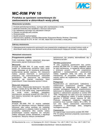 MC-RIM PW 10 Powłoka ze spoiwem cementowym do zastosowania w zbiornikach wody pitnej Właściwości produktu • • • • • • • Produkt jednokomponentowy, wymaga tylko wymieszania z wodą Materiał mineralny bez dodatków z tworzyw sztucznych Do nakładania ręcznego lub natryskiem mokrym Otwarty na dyfuzję pary wodnej Wodoszczelny Szybki przyrost wytrzymałości Dopuszczony zgodnie z DVGW (Niemieckie Zrzeszenie Branży Wodnej i Gazowej), arkusze robocze W 270, W 347 i W 300. Atest PZH na kontakt z wodą pitną Zakresy stosowania • Zabezpieczenie powierzchni pionowych oraz powierzchni znajdujących się ponad lustrem wody w zbiornikach wody pitnej oraz elementów konstrukcji betonowych mających kontakt z wodą pitną Wskazówki stosowania Przygotowanie podłoża Patrz instrukcja „Ogólne wskazówki dotyczące stosowania zapraw drobnoziarnistych“. Mieszanie Produkt MC-RIM PW 10 (cały worek) należ dodać do odmierzonej uprzednio ilości wody ciągle mieszając aż do uzyskania jednorodnej, pozba-wionej grudek zaprawy. Do mieszania należy używać betoniarki o wymuszonym mieszaniu lub wolnoobrotowych mieszadeł podwójnych. Nie dopuszcza się mieszania ręcznego, jak również mieszania ilości częściowych. Czas mieszania wynosi 5 minut. Stosunek mieszania Patrz tabela „Właściwości techniczne“. Na jeden worek o wadze 25 kg MC-RIM PW 10 potrzeba ok. 3,25 do 3,50 litrów wody. Zapotrzebowanie na wodę może podlegać niewielkim odchyleniom, ponieważ produkt MC-RIM PW 10 jest wiązany cementem ale zgodnie z podanym zakresem. Nakładanie Produkt MC-RIM PW 10 można nakładać ręcznie lub natryskiem mokrym. Materiał można stosować jako jedną warstwę lub nakładać wielowarstwowo w układzie mokre na mokre. W przypadku nakładania kilku warstw należy przestrzegać czasów wiązania. Do natrysku należy stosować pompy ślimakowe z regulacja wydajności. Służymy naszym doradztwem technicznym lub prosimy skonsultować się z dostawcą sprzętu. Obróbka powierzchni W celu uzyskania powierzchni bez porów, produkt MC-RIM PW 10 należy zagładzić pacą ze stali nierdzewnej , a następnie zetrzeć gąbką z drobnymi porami. W celu zwiększenia gładkości i wodoszczelności powierzchnię należy wygładzić raklą lub pacą ze stali nierdzewnej. W przypadku nakładania kilku warstw zaleca się wygładzanie również warstw pośrednich. Pielęgnacja Bezpośrednio po zakończeniu nakładania i wykańczania powierzchni powłoki należy rozpocząć jej pielęgnację. Ze względu na wysokie wymagania stawiane powierzchniom betonowym w obiektach wodnych należy działać zgodnie z zaleceniami zawartym w normie DIN 1045. Pielęgnacja nie tylko musi być wykonana ale czas pielęgnacji należy 3 krotnie wydłużyć zgodnie z DVGW, arkusz roboczy W 300. Podczas pielęgnacji względna wilgotność powietrza musi wynosić między 85 a 95%. W tym celu należy zastosować odpowiednie urządzenia i technologię żeby osiąganą wymagane warunki. . Czyszczenie Do regularnego czyszczenia powłoki MC-RIM PW 10 należy stosować preparaty czyszczące o neutralnym pH. 1 MC-Bauchemie Sp. z o.o. • ul. Wyścigowa 39 • 53-011 Wrocław • Tel. +48 71 339 77 44 • Fax: +48 71 339 77 44 [email protected] • www.mc-bauchemie.pl Właściwości techniczne produktu MC-RIM PW 10 Cecha Jednostka Wartość* Uwagi maksymalne uziarnienie mm Gęstość świeżej zaprawy 1 - 3 2,18 - 2 2,8/11,8 4,3/22,4 6,3/37,9 7,9/49,4 8,5/55,4 9,2/60,5 przy + 10 °C po 2 dniach przy + 20 °C po 2 dniach przy + 10 °C po 7 dniach przy + 20 °C po 7 dniach przy + 10 °C po 28 dniach przy + 20 °C po 28 dniach po 28 dniach kg/dm Wytrzymałość na rozciąganie przy N/mm zginaniu/wytrzymałość na ściskanie Dynamiczny moduł E N/mm2 23500 Stosunek wodnocementowy w/c < 0,5 Zawartość porów w świeżej zaprawie Vol.% < 5,0 Ogólna objętość porów Vol.% 4,2 2 po 28 dniach Zużycie (suchej zaprawy) kg/m /mm 1,91 Czas obróbki minuty 60 60 45 przy + 5 °C przy + 10 °C przy + 20 °C Grubości warstw mm 8 15 15 minimalna grubość warstwy maksymalna grubość warstwy maksymalna całkowita grubość warstwy Odstępy przy nakładaniu warst godziny ≤3 1. warstwa / 2. warstwa ≤3 2. warstwa / 3. warstwa dotyczy powietrza i podłoża Warunki do aplikacji - temperatura °C ≥ 5 - ≤ 30 Stosunek mieszania (wagowo) GT 100 : 13 - 14 MC-RIM PW 10 : woda Właściwości produktu MC-RIM PW 10 Kolor kremowo-biały Forma dostawy Worki po 25 kg Składowanie W zamkniętych, oryginalnych opakowaniach do 12 miesięcy. Składować w warunkach chłodnych i suchych. Utylizacja opakowań Należy dokładnie opróżniać opakowania. Szczegółowe informacje można uzyskać u naszych przedstawicieli Wszystkie wartości odnoszą się do temperatury + 10 °C oraz względnej wilgotności powietrza 80 %. Uwaga: Dane zamieszczone w niniejszej informacji bazują na naszych doświadczeniach i najlepszej wiedzy, nie są one jednakże wiążące. Należy zawsze dostosować je do danego obiektu budowlanego, rodzaju zastosowania i specyficznych dla danego miejsca wymagań. Nasze informacje odnoszą się do ogólnie uznanych zasad technicznych, których należy przestrzegać w trakcie obróbki materiału. W ramach tych założeń ponosimy odpowiedzialność za prawidłowość powyższych informacji w ramach naszych Ogólnych Warunków Sprzedaży i Dostawy. Zalecenia podane przez naszych pracowników różniące się od danych zawartych w karcie są dla nas wiążące o tyle, o ile są one potwierdzone na piśmie. W każdym przypadku należy przestrzegać ogólnych zasad techniki i sztuki budowlanej. Wydanie 01/2009. Niniejszy druk został aktualizowany pod względem technicznym. Unieważnia się dotychczasowe wydania i nie wolno ich stosować. W przypadku wydania nowej karty, zaktualizowanej pod względem technicznym, wydanie niniejsze traci ważność. MC-Bauchemie Sp. z o.o. • ul. Wyścigowa 39 • 53-011 Wrocław • Tel. +48 71 339 77