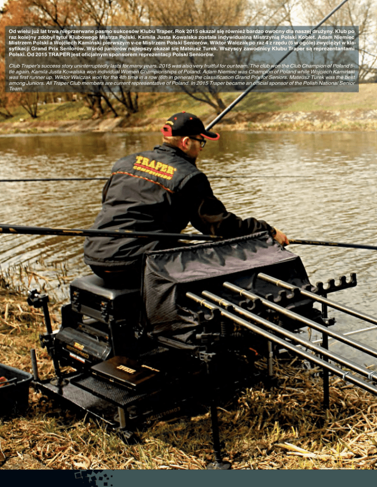 Od wielu już lat trwa nieprzerwane pasmo sukcesów Klubu Traper. Rok 2015 okazał się również bardzo owocny dla naszej drużyny. Klub po raz kolejny zdobył tytuł Klubowego Mistrza Polski. Kamila Justa Kowalska została indywidualną Mistrzynią Polski Kobiet. Adam Niemiec Mistrzem Polski a Wojciech Kamiński pierwszym v-ce Mistrzem Polski Seniorów. Wiktor Walczak po raz 4 z rzędu (6 w ogóle) zwyciężył w klasyfikacji Grand Prix Seniorów. Wśród juniorów najlepszy okazał się Mateusz Turek. Wszyscy zawodnicy Klubu Traper są reprezentantami Polski. Od 2015 TRAPER jest oficjalnym sponsorem reprezentacji Polski Seniorów. Club Traper's success story uninterruptedly lasts for many years. 2015 was also very fruitful for our team. The club won the Club Champion of Poland title again. Kamila Justa Kowalska won individual Women Championships of Poland. Adam Niemiec was Champion of Poland while Wojciech Kamiński was first runner up. Wiktor Walczak won for the 4th time in a row (6th in general) the classification Grand Prix for Seniors. Mateusz Turek was the best among Juniors. All Traper Club members are current representative of Poland. In 2015 Traper became an official sponsor of the Polish National Senior Team. ZANĘTY WĘDKARSKIE GOLD SERIES 1 kg GROUNDBAIT GOLD SERIES 1 kg Nazwa Name Gold Series to bardzo znany i ugruntowany sukcesami produkt na rynku wędkarskim. Zanęty Gold Series przyczyniły się do wielu znaczących sukcesów Klubu Wędkarskiego Traper oraz Reprezentacji Polski. Były i są stosowane na wielu zawodach krajowych i mistrzostwach europy i świata. Dzięki sukcesom osiągniętym na arenach zawodów spławikowych zanęty Gold Series cieszą się ogromną popularnością wśród wędkarzy, łowiących na kanałach, rzekach, zbiornikach i wielkich jeziorach. The Gold Series groundbait is a line of products based on success. Gold Series Groundbaits helped Traper Club and Polish National Team to win important competitions. The groundbaits are used on many national and international events. Thanks to successes gained on competitions Gold Series groundbaits is very popular among anglers fishing on canals, rivers, ponds and lakes. Active Active Black Champion Champion Red Competition Competition Black Concours Concours Red Concours Black Expert Expert Red Expert Black Explosive Explosive Red Explosive Yellow Grand Prix Grand Prix Black Grand Prix Red Magic Magic Black Magic Red Select Select Red Select Yellow Ryby Fish p³oæ, leszcz (roach, bream) leszcz, kr¹p, p³oæ, jaŸ, kleñ (bream, skimmer, roach, ide, chub) p³oæ, leszcz (roach, bream) Waga Weight 1 kg 1 kg 1 kg p³oæ, leszcz, jaŸ (roach, bream, ide) 1 kg leszcz (bream) 1 kg ukleja (bleak) 1 kg leszcz, kr¹p, p³oæ (bream, skimmer, roach) 1 kg p³oæ (roach) 1 kg leszcz, karp, amur (bream, carp, grass carp) 1 kg Kod Code 00129 00130 00001 00002 00003 00098 00015 00107 00108 00004 00005 00103 00011 00012 00013 00006 00007 00104 00008 00009 00010 00014 00106 00105 ACTIVE Zanęta przeznaczona do połowu płoci i leszczy. Do wędkowania w rzekach, doskonale komponuje się z zanętą Champion. Na wody stojące i kanały z zanętami Grand Prix i Competition The groundbait purposed for roach and bream fishing. When using on rivers can be mixed with Champion. On still waters and canals it is combining with Grand Prix or Competition. CHAMPION Zawodnicza zanęta rzeczna na leszcze, krąpie, płocie, jazie i klenie. Doskonale komponuje się z zanętą Expert lub Competition. Competitive river groundbait for bream, skimmers, roach,ide and chub. Makes excellent blend with Expert or Competition. COMPETITION Zawodnicza zanęta, przeznaczona do połowu płoci i leszczy we wszystkich łowiskach. Doskonała do komponowania z zanętą Expert lub Magic. Groundbait for roach and bream on all kind of venues. It is well composed with Expert and Magic groundbaits. CONCOURS Zawodnicza zanęta na płocie, leszcze i jazie. Przeznaczona do połowu w kanałach i wodach stojących. Idealnie komponuje się z zanętą Magic i Expert. Competitive groundbait for roach, bream and ide. To be used on canals and still waters. Ideally composes with groundbaits such as Magic and Expert. EXPERT Zawodnicza zanęta na leszcze. Doskonała do komponowania z zanętą Champion na wody płynące lub Grand Prix na wody stojące. Competitive groundbait for bream. Excellent for composition with Champion for running waters or Grand Prix for still waters. EXPLOSIVE Zawodnicza zanęta powierzchniowa do połowu uklei. Można barwić na kolor czarny, czerwony, żółty lub brązowy, w zależności od łowiska. Competitive surface groundbait for bleak. Can be coloured with black, red, yellow or brown dyes, depending on venue. GRAND PRIX Zawodnicza zanęta na wody stojące i kanały, przeznaczona do połowu leszczy, krąpi i płoci. Idealnie komponuje się z zanętą Expert lub Magic. Competitive groundbait for still waters and canals, dediceted to fishing for bream, skimmers and roach. Ideally composes with Expert and Magic. MAGIC Zawodnicza zanęta na płocie, przeznaczona na wody stojące i kanały. Zanętę Magic można komponować z zanętą Grand Prix i Competition. Competitive groundbait for roach on still waters and canals. Magic groundbait can be mixed with Grand Prix and Competition. SELECT Zawodnicza zanęta na duże leszcze, karpie i amury. Doskonale komponuje się z zanętami Champion i Competition. Competitive groundbait for big bream, carp and grass carp. Excellent for blending with Champion and Competition. [ 39 ] AKTYWATORY ZAPACHOWE 300 g ACTIVATOR 300 g Nazwa Name Champion Waga Weight Kod Code 300 g 01033 Competition Leszcz, P³oæ (Bream, Roach) 300 g 01034 Concours P³oæ, Leszcz, JaŸ (Roach, Bream, Ide) 300 g 01035 Expert Leszcz (Bream) 300 g 01036 Grand Prix 300 g 01037 Magic P³oæ (Roach) 300 g 01038 Select 300 g 01039 Vanilla Extra 300 g 01040 Leszcz, Kr¹p, P³oæ, JaŸ, Kleñ (Bream, Skimmer, Roach, Ide, Chub) Leszcz, Kr¹p, P³o