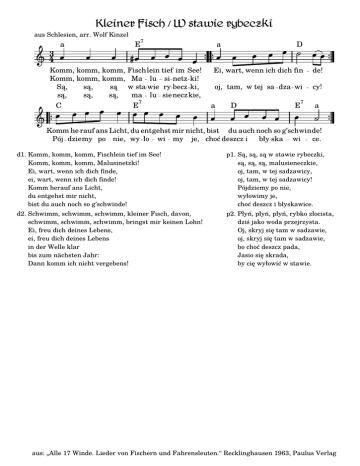Kleiner Fisch / W stawie rybeczki aus Schlesien, arr. Wolf Kinzel 43 a Komm, komm, komm, Komm, komm, komm, Są, są, są są, są, są, ÿÿ C 7 E Fisch lein tief im See! Ma lu si netz ki! w sta wie ry becz ki, ma lu sie necz kie, 7 E ÿÿ ÿÿ a ÿÿ D Ei, wart, wenn ich dich fin de! oj, tam, w tej sa dza wi cy! a D 7 E ÿÿ a Komm he rauf ans Licht, du ent gehst mir nicht, bist du auch noch so g’schwin de! Pój dzie my po nie, wy ło wi my je, choć deszcz i bły ska wi ce. d1. Komm, komm, komm, Fischlein tief im See! Komm, komm, komm, Malusinetzki! Ei, wart, wenn ich dich finde, ei, wart, wenn ich dich finde! Komm herauf ans Licht, du entgehst mir nicht, bist du auch noch so g’schwinde! p1. Są, są, są w stawie rybeczki, są, są, są, malusieneczkie, oj, tam, w tej sadzawicy, oj, tam, w tej sadzawicy! Pójdziemy po nie, wyłowimy je, choć deszcz i błyskawice. d2. Schwimm, schwimm, schwimm, kleiner Fisch, davon, schwimm, schwimm, schwimm, bringst mir keinen Lohn! Ei, freu dich deines Lebens, ei, freu dich deines Lebens in der Welle klar bis zum nächsten Jahr: Dann komm ich nicht vergebens! p2. Płyń, płyń, płyń, rybko złocista, dziś jako woda przejrzysta. Oj, skryj się tam w sadzawie, oj, skryj się tam w sadzawie, bo choć deszcz pada, Jasio się skrada, by cię wyłowić w stawie. aus: „Alle 17 Winde. Lieder von Fischern und Fahrensleuten.“ Recklinghausen 1963, Paulus Verlag