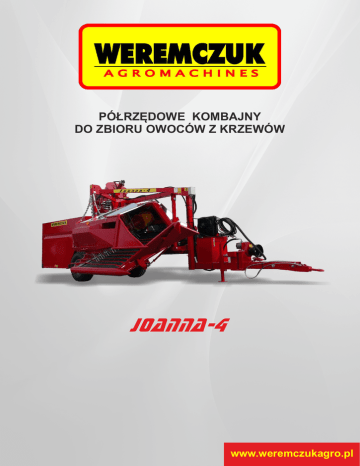 PÓŁRZĘDOWE KOMBAJNY DO ZBIORU OWOCÓW Z KRZEWÓW JOANNA-4 www.weremczukagro.pl JOANNA-4 Model JOANNA-4 to najnowszy kombajn z serii kombajnów półrzędowych „JOANNA”. Jest to maszyna nowoczesna, wydajna i niezawodna. Powstał na bazie ponad 30-letnich doświadczeń w produkcji kombajnów do zbioru owoców jagodowych i preferencji Klientów, poszukujących maszyn prostych w obsłudze, trwałych a przy tym w korzystnej cenie. Przeznaczony jest do zbioru porzeczek czarnych i czerwonych, aronii, agrestu, dzikiej róży oraz innych krzewów jagodowych. Kombajn JOANNA-4 zapewnia wysokowydajny, intensywny zbiór o najlepszych parametrach jakościowych, przy zminimalizowanej ilości czynności obsługowych. Dzięki nowemu systemowi osłon i uszczelnień eliminuje straty owoców oraz zwiększa wydajność modułu oczyszczania owoców. JOANNA-4 jest maszyną wykonaną solidnie i profesjonalnie, z użyciem wysokiej jakości materiałów i osprzętu, gwarantujący bezawaryjną wieloletnią eksploatację. www.weremczukagro.pl DANE TECHNICZNE źKombajn półrzędowy, zaczepiany do ciągnika źSystem otrząsania z jednym otrząsaczem źWydajność: 0,15-0,25 ha/godz. źNiezależny system hydrauliczny do napędów zespołów roboczych z chłodnica oleju i termostatem źZbiór owoców do skrzynek I skrzyniopalet źŁadowność pomostu roboczego: 650 kg (w opcji 1150 kg) źMasa 1500 kg źWspółpraca z ciągnikiem: min. 22 kW (30KM) WEREMCZUK FMR SP. Z O.O. (Ltd) UL. BEŁŻYCKA 73, 24-220 NIEDRZWICA DUŻA, POLAND TEL. +48 81 517 15 66, +48 81 517 15 77, FAX +48 81 517 15 60 [email protected], [email protected] www.weremczukagro.pl