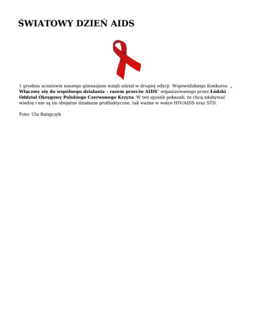 ŚWIATOWY DZIEŃ AIDS 1 grudnia uczniowie naszego gimnazjum wzięli udział w drugiej edycji Wojewódzkiego Konkursu „ Włączmy się do wspólnego działania – razem przeciw AIDS” organizowanego przez Łódzki Oddział Okręgowy Polskiego Czerwonego Krzyża. W ten sposób pokazali, że chcą zdobywać wiedzę i nie są im obojętne działania profilaktyczne, tak ważne w walce HIV/AIDS oraz STD. Foto: Ula Ratajczyk