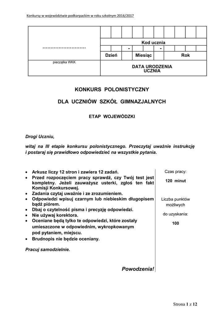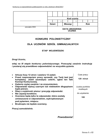 Konkursy w województwie podkarpackim w roku szkolnym 2016/2017 Kod ucznia ……………………… - - Dzień Miesiąc Rok pieczątka WKK DATA URODZENIA UCZNIA KONKURS POLONISTYCZNY DLA UCZNIÓW SZKÓŁ GIMNAZJALNYCH ETAP WOJEWÓDZKI Drogi Uczniu, witaj na III etapie konkursu polonistycznego. Przeczytaj uważnie instrukcję i postaraj się prawidłowo odpowiedzieć na wszystkie pytania. Arkusz liczy 12 stron i zawiera 12 zadań. Przed rozpoczęciem pracy sprawdź, czy Twój test jest kompletny. Jeżeli zauważysz usterki, zgłoś ten fakt Komisji Konkursowej. Zadania czytaj uważnie i ze zrozumieniem. Odpowiedzi wpisuj czarnym lub niebieskim długopisem bądź piórem. Dbaj o czytelność pisma i precyzję odpowiedzi. Nie używaj korektora. Oceniane będą tylko te odpowiedzi, które zostały umieszczone w odpowiednim, wykropkowanym pod pytaniem, miejscu. Brudnopis nie będzie oceniany. Czas pracy: 120 minut Liczba punktów możliwych do uzyskania: 100 Pracuj samodzielnie. Powodzenia! Strona 1 z 12 Konkursy w województwie podkarpackim w roku szkolnym 2016/2017 Motyw przewodni: Z rzeczy świata tego zostaną tylko dwie, Dwie tylko: poezja i dobroć... i więcej nic... Cyprian Norwid Nie daj się zwyciężyć złu, ale zło dobrem zwyciężaj! św. Paweł (Rz. 12,21) Zadanie 1. (0-2) Święty Paweł w Liście do Rzymian zaleca miłość nieprzyjaciół. Jedno ze zdań: „Tak bowiem czyniąc, węgle żarzące zgromadzisz na jego głowę” - odsyła nas do powtarzającego się często w Biblii motywu oznaczającego… a) bałwochwalczą, bezbożną modlitwę niepokornego człowieka, wywyższającego swoje postępowanie; b) żar ognia, węgle ogniste, czyli wywołanie zawstydzenia i rozpoczęcie tradycyjnych 50 dni postu; c) oczyszczającą obecność Boga, czyli unicestwienie zła i wyzwolenie dobra z jego powiązań ze złem. Zadanie 2. (0-8) Scharakteryzuj narratora opowiadania Kornela Filipowicza pt. Zazdrość, czyli o nadmiarze i doskonałości środków. Wykorzystaj wiedzę dotyczącą zarówno formy utworu, jak i jego treści (jaka jest forma osobowa narracji?, z czym wiążą się dwie konsekwencje wyboru takiej formy?, jakie są dwie charakterystyczne/dominujące cechy narracji?) (0-4). ………………………………………………………………………………………………… ………………………………………………………………………………………………… ………………………………………………………………………………………………… ………………………………………………………………………………………………… Czy o narratorze opowiadania można wygłosić następujący sąd: „dręczy się cudzym dobrem”? Odpowiedź uzasadnij przy pomocy dwóch zdań złożonych (0-4). ………………………………………………………………………………………………… ………………………………………………………………………………………………… ………………………………………………………………………………………………… ………………………………………………………………………………………………... Strona 2 z 12 Konkursy w województwie podkarpackim w roku szkolnym 2016/2017 Zadanie 3. (0-8) Odwołując się do znajomości treści opowiadania Kornela Filipowicza Zazdrość, czyli o nadmiarze i doskonałości środków, odpowiedz na pytanie: czy zazdrość może być pożyteczna? Uzasadnij swoją tezę przy pomocy trzech argumentów (potwierdzających, negujących bądź wyrażających stosunek ambiwalentny). Teza………………………………………… Argument I …………………………………………………………………………………………………... …………………………………………………………………………………………………... ....................................................................................................................................................... Argument II ………………………………………………………………………………………………… ………………………………………………………………………………………………… ………………………………………………………………………………………………… Argument III ………………………………………………………………………………………………… ………………………………………………………………………………………………… ………………………………………………………………………………………………… Zadanie 4. (0-4) Wyjaśnij znaczenie tytułu reporterskiej książki Baśnie udokumentowane Krzysztofa Kąkolewskiego. Uwzględnij treść reportażu oraz konteksty: biograficzny i historyczny. ………………………………………………………………………………………………… ………………………………………………………………………………………………… ………………………………………………………………………………………………… ………………………………………………………………………………………………… ………………………………………………………………………………………………… Strona 3 z 12 Konkursy w województwie podkarpackim w roku szkolnym 2016/2017 Zadanie 5. (0-2) Na podstawie znajomości treści reportażu Jak umierają nieśmiertelni. Baśnie udokumentowane odpowiedz, kto jest autorem następujących puent: „Trudno to wszystko do końca zrozumieć. Ale jesteście połączeni, przykuci do siebie, bliźniacy świętości.” a) Gajowniczek b) Wajd