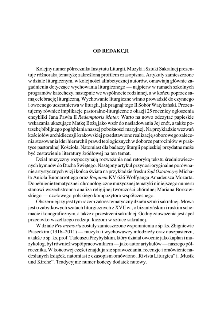 OD REDAKCJI Kolejny numer półrocznika Instytutu Liturgii, Muzyki i Sztuki Sakralnej prezentuje różnoraką tematykę zakreśloną profilem czasopisma. Artykuły zamieszczone w dziale liturgicznym, w kolejności alfabetycznej autorów, omawiają głównie zagadnienia dotyczące wychowania liturgicznego — najpierw w ramach szkolnych programów katechezy, następnie we wspólnocie rodzinnej, a w końcu poprzez samą celebrację liturgiczną. Wychowanie liturgiczne winno prowadzić do czynnego i owocnego uczestnictwa w liturgii, jak pragnął tego II Sobór Watykański. Prezentujemy również implikacje pastoralno-liturgiczne z okazji 25 rocznicy ogłoszenia encykliki Jana Pawła II Redemptoris Mater. Warto na nowo odczytać papieskie wskazania ukazujące Matkę Bożą jako wzór do naśladowania Jej cnót, a także potrzebę biblijnego pogłębiania naszej pobożności maryjnej. Na przykładzie wezwań kościołów archidiecezji krakowskiej przedstawiono realizację soborowego zalecenia stosowania idei hierarchii prawd teologicznych w doborze patrociniów w praktyce pastoralnej Kościoła. Natomiast dla badaczy liturgii papieskiej przydatne może być zestawienie literatury źródłowej na ten temat. Dział muzyczny rozpoczynają rozważania nad retoryką tekstu średniowiecznych hymnów do Ducha Świętego. Następny artykuł przynosi oryginalne porównanie artystycznych wizji końca świata na przykładzie fresku Sąd Ostateczny Michała Anioła Buonarrotiego oraz Requiem KV 626 Wolfganga Amadeusza Mozarta. Dopełnienie tematyczne i chronologiczne muzycznej tematyki niniejszego numeru stanowi wszechstronna analiza religijnej twórczości chóralnej Mariana Borkowskiego — czołowego polskiego kompozytora współczesnego. Obszerniejszy jest tym razem zakres tematyczny działu sztuki sakralnej. Mowa jest o zabytkowych szatach liturgicznych z XVII w., o bizantyńskim i ruskim schemacie ikonograficznym, a także o przestrzeni sakralnej. Godny zauważenia jest apel przeciwko wszelkiego rodzaju kiczom w sztuce sakralnej. W dziale Pro memoria zostały zamieszczone wspomnienia o śp. ks. Zbigniewie Piaseckim (1916–2011) — muzyku i wychowawcy młodzieży oraz duszpasterzu, a także o śp. ks. prof. Tadeuszu Przybylskim, który działał owocnie jako kapłan i muzykolog, był również współpracownikiem — jako autor artykułów — naszego półrocznika. W końcowej części znajdują się sprawozdania, recenzje i omówienie nadesłanych książek, natomiast z czasopism omówiono „Rivista Liturgica” i „Musik und Kirche”. Tradycyjnie numer kończy dodatek nutowy.