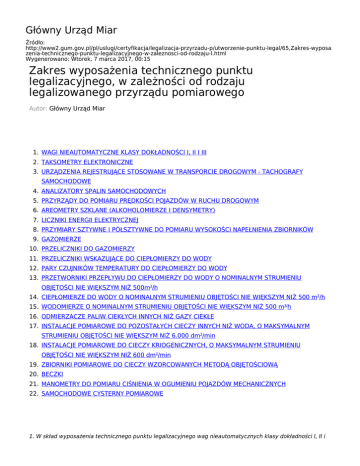 Główny Urząd Miar Źródło: http://www2.gum.gov.pl/pl/uslugi/certyfikacja/legalizacja-przyrzadu-p/utworzenie-punktu-legal/65,Zakres-wyposa zenia-technicznego-punktu-legalizacyjnego-w-zaleznosci-od-rodzaju-l.html Wygenerowano: Wtorek, 7 marca 2017, 00:15 Zakres wyposażenia technicznego punktu legalizacyjnego, w zależności od rodzaju legalizowanego przyrządu pomiarowego Autor: Główny Urząd Miar 1. WAGI NIEAUTOMATYCZNE KLASY DOKŁADNOŚCI I, II I III 2. TAKSOMETRY ELEKTRONICZNE 3. URZĄDZENIA REJESTRUJĄCE STOSOWANE W TRANSPORCIE DROGOWYM - TACHOGRAFY SAMOCHODOWE 4. ANALIZATORY SPALIN SAMOCHODOWYCH 5. PRZYRZĄDY DO POMIARU PRĘDKOŚCI POJAZDÓW W RUCHU DROGOWYM 6. AREOMETRY SZKLANE (ALKOHOLOMIERZE I DENSYMETRY) 7. LICZNIKI ENERGII ELEKTRYCZNEJ 8. PRZYMIARY SZTYWNE I PÓŁSZTYWNE DO POMIARU WYSOKOŚCI NAPEŁNIENIA ZBIORNIKÓW 9. GAZOMIERZE 10. PRZELICZNIKI DO GAZOMIERZY 11. PRZELICZNIKI WSKAZUJĄCE DO CIEPŁOMIERZY DO WODY 12. PARY CZUJNIKÓW TEMPERATURY DO CIEPŁOMIERZY DO WODY 13. PRZETWORNIKI PRZEPŁYWU DO CIEPŁOMIERZY DO WODY O NOMINALNYM STRUMIENIU OBJĘTOŚCI NIE WIĘKSZYM NIŻ 500m3/h 14. CIEPŁOMIERZE DO WODY O NOMINALNYM STRUMIENIU OBJĘTOŚCI NIE WIĘKSZYM NIŻ 500 m3/h 15. WODOMIERZE O NOMINALNYM STRUMIENIU OBJĘTOŚCI NIE WIĘKSZYM NIŻ 500 m3/h 16. ODMIERZACZE PALIW CIEKŁYCH INNYCH NIŻ GAZY CIEKŁE 17. INSTALACJE POMIAROWE DO POZOSTAŁYCH CIECZY INNYCH NIŻ WODA, O MAKSYMALNYM STRUMIENIU OBJĘTOŚCI NIE WIĘKSZYM NIŻ 6.000 dm3/min 18. INSTALACJE POMIAROWE DO CIECZY KRIOGENICZNYCH, O MAKSYMALNYM STRUMIENIU OBJĘTOŚCI NIE WIĘKSZYM NIŻ 600 dm3/min 19. ZBIORNIKI POMIAROWE DO CIECZY WZORCOWANYCH METODĄ OBJĘTOŚCIOWĄ 20. BECZKI 21. MANOMETRY DO POMIARU CIŚNIENIA W OGUMIENIU POJAZDÓW MECHANICZNYCH 22. SAMOCHODOWE CYSTERNY POMIAROWE 1. W skład wyposażenia technicznego punktu legalizacyjnego wag nieautomatycznych klasy dokładności I, II i III wchodzą: 1. wzorce masy klasy dokładności E2, F1 F2 lub M1 (I, II, III lub IV rzędu) o błędach granicznych dopuszczalnych nieprzekraczających 1/3 błędów granicznych dopuszczalnych sprawdzanej wagi przy danym obciążeniu, przy czym niepewność wyznaczenia masy tych wzorców nie powinna przekraczać 1/3 wartości bezwzględnej ich błędów granicznych dopuszczalnych; 2. wzorce masy dokładkowe o masie 1/10 wartości działki elementarnej sprawdzanej wagi. 2. W skład wyposażenia technicznego punktu legalizacyjnego taksometrów elektronicznych wchodzą: 1. stanowisko pomiarowe lub przyrząd pomiarowy (przyrządy pomiarowe) umożliwiające sprawdzenie dokładności wskazań zespołu drogi, zespołu czasu oraz liczników kilometrów ogólnych i płatnych przewidzianych dla taksometru niezainstalowanego w taksówce o błędach wskazań nieprzekraczających wartości: a) ±1 m dla długości drogi, b) ±2 s dla przedziału czasu równego 1 h; 2. odcinek pomiarowy (baza drogowa) o długości co najmniej 1.000 m wyznaczony z błędem nieprzekraczającym ±0,05 % długości lub inne równorzędne stanowisko pomiarowe lub przyrząd pomiarowy umożliwiające wyznaczenie błędów wskazań długości pierwszego odcinka drogi oraz następnych odcinków drogi przewidzianych dla taksometru zainstalowanego w taksówce; 3. manometr do pomiaru ciśnienia w ogumieniu pojazdów mechanicznych o błędach wskazań nieprzekraczających ±0,16 bara. W przypadku wykonywania w punkcie legalizacyjnym wyłącznie legalizacji pierwotnej taksometrów elektronicznych wystarczające jest posiadanie wyposażenia wymienionego w pkt 1. 3. W skład wyposażenia technicznego punktu legalizacyjnego urządzeń rejestrujących stosowanych w transporcie drogowym - tachografów samochodowych, zwanych dalej "urządzeniami rejestrującymi", wchodzą: 1. urządzenie do wyznaczania wartości poprawnych prędkości i długości drogi na stanowisku pomiarowym, w skład którego wchodzą: a) urządzenie przeznaczone do napędzania urządzenia rejestrującego - z bezstopniową regulacją prędkości w całym zakresie pomiarowym sprawdzanego urządzenia rejestrującego i stabilnością napędu nieprzekraczającą ±0,5 % ustawionej wartości prędkości przez 5 minut, b) przyrząd do pomiaru prędkości liniowej o zakresie pomiarowym nie mniejszym niż od 10 km/h do 180 km/h i wartości działki elementarnej nie większej niż 1 km/h, przy czym błędy wskazań prędkości nie powinny przekraczać wartości ±1 km/h, c) licznik obrotów o zakresie pomiarowym nie mniejszym niż od 0 do 9.999 obrotów i wartości działki elementarnej nie większej niż 1 obrót, przy czym błędy wskazań licznika nie powinny przekraczać ±1 obrotu, lub d) licznik impulsów o zakresie pomiarowym nie mniejszym niż od 0 impulsów do 99.999 impulsów i wartości działki elementarnej nie większej niż 1 impuls, przy czym błędy wskazań licznika nie powinny przekraczać wartości ±1 impulsu. lub e) urządzenie wyposażone w funkcje impulsowej symulacji prędkości liniowej i długości drogi umożliwiające przeprowadzenie sprawdzania urządzenia rejestrującego z dokładnością, o której mowa w lit. a-c, umożliwiające wyznaczanie stałej elektronicznego urządzenia rejestrującego oraz sprawdzenie poprawności działania przetwornika prędkości i długości drogi; 2. źródło prądu stałego o możliwości ustawienia napięcia 12 V lub 24 V z dopuszczalnym prądem obciążenia nie mniejszym niż 1 A; 3. chronokomparator cyfrowy przystosowany do sprawdzania urządzeń rejestrujących (względny przyrost błędu nieprzekraczający ±10 s na dobę) lub zegar kontrolny; 4. termometr do pomiaru temperatury otoczenia - wzorcowany w zakresie od 0 °C do +40 °C; 5. urządzenie do odczytu wartości zarejestrowanych na wykresówce. 4. W skład wyposażenia technicznego punktu legalizacyjnego analizatorów spalin samochodowych wchodzą: 1. wzorcowe mieszaniny gazowe o wartościach ułamków objętościowych składników badanych podanych ze względną niepewnością rozszerzoną