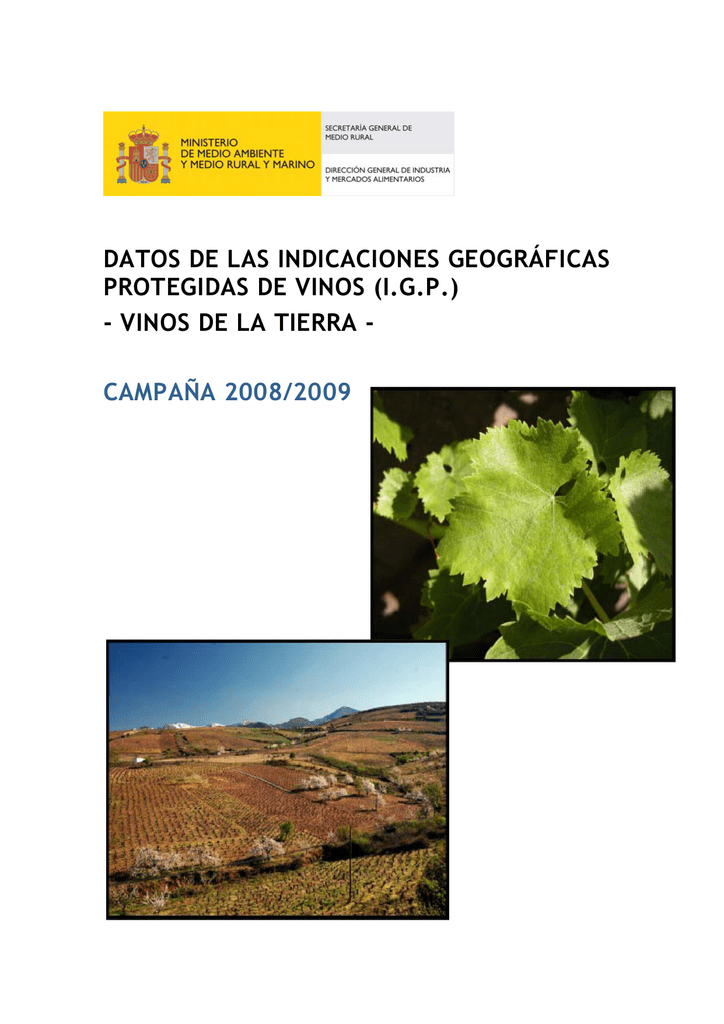 DATOS DE LAS INDICACIONES GEOGRÁFICAS PROTEGIDAS DE VINOS (I.G.P.) - VINOS DE LA TIERRA CAMPAÑA 2008/2009 DATOS DE LOS VINOS CON INDICACIONES GEOGRÁFICAS PROTEGIDAS (I.G.P.) - VINOS DE LA TIERRA CAMPAÑA 2008/2009 (1) Sólo se contemplan en esta publicación las I.G.P. cuyo reconocimiento se hubiera publicado en el Boletín Oficial del Estado antes del inicio de la campaña 2008/2009 (2) Nota: El tratamiento de los datos se ha realizado sobre la información recibida de las C.C.A.A Fuente: Comunidades Autónomas Elaboración: Subdirección General de Calidad Diferenciada y Agricultura Ecológica Datos de los Vinos con Indicaciones Geográficas Protegidas (I.G.P.) –Vinos de la TierraCampaña 2008/2009 ÍNDICE LOCALIZACIÓN GEOGRÁFICA........................................................................ 1 PRESENTACIÓN DE DATOS........................................................................... 5 1. Datos más relevantes de la campaña 2008/09 .......................................... 6 CAMPAÑA VITIVINÍCOLA 2008/2009............................................................... 9 1. 2. 3. 4. 5. 6. 7. 8. 9. 10. Superficie apta y número de viticultores ................................................ 10 Bodegas ........................................................................................ 12 Producción obtenida (hl) ................................................................... 14 Comercio total................................................................................ 16 Comercio total por tipos de vino (hl) ..................................................... 18 Comercio interior por tipos de vino (hl).................................................. 20 Comercio exterior por tipo de vino (hl) .................................................. 22 Comercio exterior con países de la Unión Europea (hl)................................ 24 Comercio exterior con países terceros (hl) .............................................. 25 Valor económico (€) ......................................................................... 26 Datos de los Vinos con Indicaciones Geográficas Protegidas (I.G.P.) –Vinos de la TierraCampaña 2008/2009 LOCALIZACIÓN GEOGRÁFICA Pág. 1 de 26 Datos de los Vinos con Indicaciones Geográficas Protegidas (I.G.P.) –Vinos de la TierraCampaña 2008/2009 ANDALUCÍA ARAGÓN BALEARES IGP Altiplano de Sierra Nevada IGP Bailén IGP Cádiz IGP Córdoba IGP Cumbres del Guadalfeo IGP Desierto de Almería IGP Laderas de Genil IGP Laujar-Alpujarra IGP Los Palacios IGP Norte de Almería IGP Ribera de Andarax IGP Sierra Norte de Sevilla IGP Sierra Sur de Jaén IGP Sierras de las Estancias y los Filabres IGP Torreperogil IGP Villaviciosa de Córdoba IGP Bajo Aragón IGP Ribera del Gállego-Cinco Villas IGP Ribera del Jiloca IGP Valdejalón IGP Valle del Cinca IGP Ibiza IGP Formentera IGP Illes Balears IGP Mallorca IGP Isla de Menorca IGP Serra de Tramuntana-Costa Nord Pág. 2 de 26 Datos de los Vinos con Indicaciones Geográficas Protegidas (I.G.P.) –Vinos de la TierraCampaña 2008/2009 IGP Costa de Cantabria IGP Liébana IGP Castilla y León IGP Castilla COMUNIDAD IGP El Terrerazo VALENCIANA IGP Castelló EXTREMADURA IGP Extremadura IGP Barbanza e Iria IGP Betanzos IGP Valle do Miño-Ourense IGP Valles de Sadacia IGP Abanilla IGP Campo de Cartagena IGP Murcia NAVARRA IGP 3 Riberas SUPRA AUTONÓMICAS IGP Ribera del Queiles IGP Viñedos de España CANTABRIA CASTILLA Y LEÓN CASTILLALA MANCHA GALICIA LA RIOJA MURCIA Pág. 3 de 26 Datos de los Vinos con Indicaciones Geográficas Protegidas (I.G.P.) –Vinos de la TierraCampaña 2008/2009 Pág. 4 de 26 Datos de los Vinos con Indicaciones Geográficas Protegidas (I.G.P.) –Vinos de la TierraCampaña 2008/2009 PRESENTACIÓN DE DATOS Pág. 5 de 26 Datos de los Vinos con Indicaciones Geográficas Protegidas (I.G.P.) –Vinos de la TierraCampaña 2008/2009 1. Datos más relevantes de la campaña 2008/09 En este documento se presentan los datos estadísticos de la campaña 2008/2009 correspondientes a los vinos con Indicación Geográfica Protegida – Vinos de la Tierra- conforme a la información suministrada por las Comunidades Autónomas. Estos no son los definitivos ya que no se han recibido todos los datos. En relación a los datos correspondientes a la campaña 2008/2009 se destaca: - Comercio total de las I.G.P.: El comercio interior (54,1%) representa algo más de la mitad del volumen de vino total comercializado. Entre las distintas I.G.P. destaca Vinos de la Tierra de Castilla, que constituye el 64,8% de la comercialización total, seguida por Vinos de la Tierra de Extremadura, con el 24,5%. - Comercialización total por tipos de vino: Destaca el vino tinto (76,3%), el cual representa las tres cuartas partes del volumen de vino total comercializado. En segundo lugar se sitúa el vino blanco (19,6%) y, por último, el vino rosado (4,2%). • Comercio interior por tipos de vino: El vino tinto representa el 75,8% del volumen del comercio interior, siendo el vino blanco el segundo en volumen con el 21,8%, por encima del vino rosado, con el 2,5% del comercio interior. • Comercio exterior por tipos de vino: Destaca el vino tinto (76,9%), seguido del vino blanco (17,1%) y en tercer lugar se sitúa el vino rosado (6,1%). - Comercialización exterior por zonas económicas: la Unión Europea constituye el destino principal del comercio exterior, con el 72,9%, muy por encima del resto de Europa no Unión Europea (4,7%) y Japón, con el 8,8%. Pág. 6 de 26 Datos de los Vinos con Indicaciones Geográficas Protegidas (I.G.P.) –Vinos de la TierraCampaña 2008/2009 El resumen de la información más relevante se expone a continuación: I. Datos registrales (al 31-07-2009) 59.569 Número total de viticultores 438 Bodegas embotelladoras 92 Bodegas no embotelladoras II. Superficie apta (al 31-07-2009) 606.651,59 ha IV. Producción obtenida (al 31-07-2009) 2.151.524 hl V.1. Volumen del comercio to