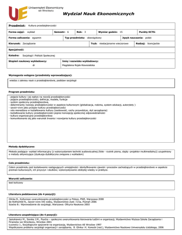 Wydział Nauk Ekonomicznych Przedmiot: Forma zajęć: Kultura przedsiębiorczości wykład Semestr: 6 Forma zaliczenia: egzamin Rok: 3 Wymiar godzin: 15 Typ przedmiotu: obowiązkowy Kierunek: Zarządzanie Punkty ECTS: Język nauczania: polski Tryb: niestacjonarne wieczorowe Rodzaj: licencjackie Specjalność: Katedra: Socjologii i Polityki Społecznej Stopień naukowy wykładowcy: dr Imię i nazwisko wykładowcy: Magdalena Rojek-Nowosielska Wymagania wstępne (przedmioty wprowadzające): wiedza z zakresu nauk o przedsiębiorstwie, podstaw socjologii Program przedmiotu: - pojęcie kultury i jej wpływ na rozwój przedsiębiorczości pojęcie przedsiębiorczości, definicje, modele, funkcje system społeczny przedsiębiorstwa, determinanty rozwoju predsiębiorczości w aspekcie kulturowym (globalizacja, rodzina, system edukacji, autorytety ) savoir-vivre jako przejaw kultury przedsiębiorczości rola menedŜera w kształtowaniu kultury (osobowość, cechy przywódcze, styl zarządzania) kształtowanie kultury przedsięboirczości poprez koncepcję społecznej odpowiedzialności kultura organizacyjna przedsiębiorstwa komunikowanie się jako warunek trwania i rozwijania kultury przedsiębiorczości Metody dydaktyczne: Metoda podająca- wykład informacyjny (z wykorzystaniem techniki audiowizualnej (folie - rzutnik pisma, slajdy -projektor multimedialny)) uzupełniony o metody aktywizujące (dyskusja dydaktyczna związana z wykładem) Cele przedmiotu: Celem przedmiotu jest kształowanie następujących umiejętności: identyfikowanie zjawisk i procesów zachodzących w przedsiębiorstwie w aspekcie premian kulturowych, ich przyczyn i skutków; wykorzystywanie zdobytej wiedzy w praktyce. Warunki zaliczenia: test końcowy Literatura podstawowa (do 4 pozycji): Glinka B., Kulturowe uwarunkowania przedsiębiorczości w Polsce, PWE, Warszawa 2008 de Rothschild N., Savoir-vivre XXI wieku, Wydawnictwo Zysk i S-ka, Poznań 2006 Szacka B.: Wprowadzenie do socjologii, Warszawa: Oficyna Naukowa 2003 Literatura uzupełniająca (do 4 pozycji): Jasiukiewicz M., Soroka J.M., Psycho – społeczne uwarunkowania kierowania ludźmi w organizacji, Wydawnictwo WyŜsza Szkoła Zarządzania i Finansów we Wrocławiu, Wrocław 2001 Łucewicz J., Socjologiczne spojrzenie na organizację, Wydawnictwo AE Wrocław 1997 Współczesne problemy socjologii organizacji i zarządzania, B. Glinka i K. Konecki (red.), Wydawnictwo Naukowe Uniwersytetu Łódzkiego, 2006