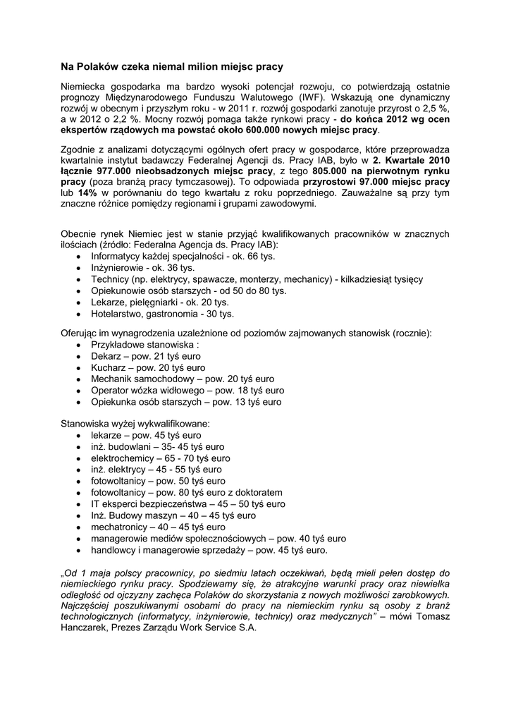 Na Polaków czeka niemal milion miejsc pracy Niemiecka gospodarka ma bardzo wysoki potencjał rozwoju, co potwierdzają ostatnie prognozy Międzynarodowego Funduszu Walutowego (IWF). Wskazują one dynamiczny rozwój w obecnym i przyszłym roku - w 2011 r. rozwój gospodarki zanotuje przyrost o 2,5 %, a w 2012 o 2,2 %. Mocny rozwój pomaga także rynkowi pracy - do końca 2012 wg ocen ekspertów rządowych ma powstać około 600.000 nowych miejsc pracy. Zgodnie z analizami dotyczącymi ogólnych ofert pracy w gospodarce, które przeprowadza kwartalnie instytut badawczy Federalnej Agencji ds. Pracy IAB, było w 2. Kwartale 2010 łącznie 977.000 nieobsadzonych miejsc pracy, z tego 805.000 na pierwotnym rynku pracy (poza branżą pracy tymczasowej). To odpowiada przyrostowi 97.000 miejsc pracy lub 14% w porównaniu do tego kwartału z roku poprzedniego. Zauważalne są przy tym znaczne różnice pomiędzy regionami i grupami zawodowymi. Obecnie rynek Niemiec jest w stanie przyjąć kwalifikowanych pracowników w znacznych ilościach (źródło: Federalna Agencja ds. Pracy IAB): Informatycy każdej specjalności - ok. 66 tys. Inżynierowie - ok. 36 tys. Technicy (np. elektrycy, spawacze, monterzy, mechanicy) - kilkadziesiąt tysięcy Opiekunowie osób starszych - od 50 do 80 tys. Lekarze, pielęgniarki - ok. 20 tys. Hotelarstwo, gastronomia - 30 tys. Oferując im wynagrodzenia uzależnione od poziomów zajmowanych stanowisk (rocznie): Przykładowe stanowiska : Dekarz – pow. 21 tyś euro Kucharz – pow. 20 tyś euro Mechanik samochodowy – pow. 20 tyś euro Operator wózka widłowego – pow. 18 tyś euro Opiekunka osób starszych – pow. 13 tyś euro Stanowiska wyżej wykwalifikowane: lekarze – pow. 45 tyś euro inż. budowlani – 35- 45 tyś euro elektrochemicy – 65 - 70 tyś euro inż. elektrycy – 45 - 55 tyś euro fotowoltanicy – pow. 50 tyś euro fotowoltanicy – pow. 80 tyś euro z doktoratem IT eksperci bezpieczeństwa – 45 – 50 tyś euro Inż. Budowy maszyn – 40 – 45 tyś euro mechatronicy – 40 – 45 tyś euro managerowie mediów społecznościowych – pow. 40 tyś euro handlowcy i managerowie sprzedaży – pow. 45 tyś euro. „Od 1 maja polscy pracownicy, po siedmiu latach oczekiwań, będą mieli pełen dostęp do niemieckiego rynku pracy. Spodziewamy się, że atrakcyjne warunki pracy oraz niewielka odległość od ojczyzny zachęca Polaków do skorzystania z nowych możliwości zarobkowych. Najczęściej poszukiwanymi osobami do pracy na niemieckim rynku są osoby z branż technologicznych (informatycy, inżynierowie, technicy) oraz medycznych” – mówi Tomasz Hanczarek, Prezes Zarządu Work Service S.A. Tak duża luka fachowców na niemieckim rynku pracy, wynika ze splotu różnych czynników, np. znaczne zmiany okresów czasowych wakatów zgłoszonych miejsc pracy, ilość starszych pracowników (poprzez przechodzenie na emerytury powstanie potrzeba zastąpienia), relacje zgłoszonych bezrobotnych do zgłoszonych miejsc pracy i comiesięczne zapytania wśród agencji odnośnie podaży i popytu dla określonych grup zawodowych. Obecna sytuacja jest spowodowana sytuacją koniunkturalną – ale także niezależnie od wpływu koniunktury sytuacja dostępu do fachowych pracowników w perspektywie średniej i dłuższej ulegnie zaostrzeniu. Według scenariusza demograficznego instytutu IAB tzw. potencjał personelu produkcyjnego w Niemczech (EPP) bez emigrantów i przy stałej stopie personelu produkcyjnego spadnie z obecnych 45 milionów osób do 27 milionów osób w 2050 r. „Otwarcie niemieckiego rynku pracy daje olbrzymie możliwości przed polskimi pracownikami. Należy jednak pamiętać, że jest to wymagający rynek, który stawia wysokie wymagania jakościowe. Bardzo ważne są kwestie weryfikacji kompetencji oraz kompleksowości obsługi procesów pozyskania pracowników z Polski” – dodaje Krzysztof Inglot, Rzecznik Prasowy Work Service S.A. Ze względu na potrzebę obsłużenia tak gigantycznego potencjału niemieckiego rynku pracy, Work Service S.A. przy współpracy z niemieckimi partnerami tworzy portal wiedzy na temat nowo dostępnego rynku pracy. W ramach tego społeczno - internetowego przedsięwzięcia ma powstać baza ponad 1 mln aplikacji polskich pracowników, co pozwoli zachować gwarancję bezpiecznego zatrudnienia pracodawcom zza zachodniej granicy i ułatwi Polakom znalezienie zatrudnienia. Nowy portal zostanie oficjalnie zaprezentowany na Europejskim Kongresie Gospodarczym, który odbędzie się w dniach 16-18 maja.