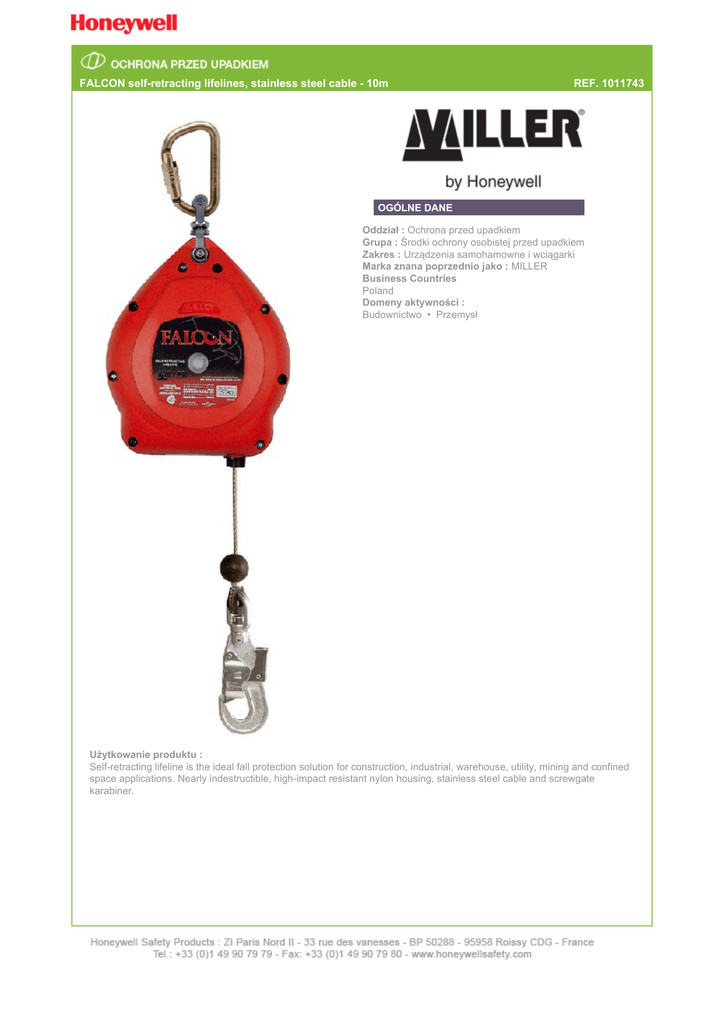 FALCON self-retracting lifelines, stainless steel cable - 10m REF. 1011743 OGÓLNE DANE Oddział : Ochrona przed upadkiem Grupa : Środki ochrony osobistej przed upadkiem Zakres : Urządzenia samohamowne i wciągarki Marka znana poprzednio jako : MILLER Business Countries Poland Domeny aktywności : Budownictwo • Przemysł Użytkowanie produktu : Self-retracting lifeline is the ideal fall protection solution for construction, industrial, warehouse, utility, mining and confined space applications. Nearly indestructible, high-impact resistant nylon housing, stainless steel cable and screwgate karabiner. ZALETY PRODUKTÓW Właściwości : Enhanced safety: The quick-activating braking mechanism stops a fall within centimeters Fall indicator Greater comfort of use : Lightweight No annual factory re-cetification required : Reduced down time, mower cost of ownership and increased productivity Zaleta : Self-retracting lifeline is the ideal fall protection solution for construction, industrial, warehouse, utility, mining and confined space applications. Nearly indestructible, high-impact resistant nylon housing, stainless steel cable and screwgate karabiner. OPIS TECHNICZNY Zewnętrzna Obudowa : high-impact resistant nylon Piasta : Heat-treated aluminium Kabel : Ø4.5mm stainless steel Złącza : karabiner: raw material: zinc plated steel opening: 17mm breaking strength: >2500daN EN 362 Snap hook: raw material: galvanized steel opening: 20mm breaking strength: >2000daN EN 362 Wymiary Długość : 255mm Szerokość : 213mm Grubość : 101mm Otwór : 17mm Jakość pracy Pojemność robocza (m) : 10m Długość zatrzymania : <2m Maksymalny wysiłek : <600daN Siła łamiąca : >1200daN Waga (kg) : 5kg Temperatura robocza : -30°C to +50°C Dane dodatkowe : Braking system Bronze and stainless steel Standard EN360 INFORMACJE DODATKOWE Numer instrukcji użytkownika : 90004211 Kod EAN : 3660681030535 CERTYFIKATY I ZGODNOŚĆ Dyrektywy Unii Europejskiej : 89/686/EEC Kategoria UE Środki ochrony osobistej* : Klasa 3 Normy : EN360 Zapewnienie jakości : ISO 9001 / 2000 Numer certyfikatu UE : 333 AFAQ Numer atestu UE : 040216 Laboratorium : SGS *PPE : Środki ochrony osobistej (ŚOO) DEKLARACJA ZGODNOŚCI UE Producent lub jego prawny przedstawiciel/dostawca z siedzibą na terenie Unii Europejskiej: Miller by Sperian Stwierdza, że opisane tutaj środki ochrony osobistej są zgodne z postaniowieniami Dyrektywy 89/686/CEE Rady Europy: Designation: FALCON self-retracting lifelines, stainless steel cable - 10m Reference: 1011743 Standard(s): EN360 ŚOO podlega powyższemu typowi atestu UE: 040216 Delivered by: SGS SGS House Portland Road, East Grinstead RH19 4 WEST SUSSEX United Kingdom Sporządzono w Vierzon, na 07/25/2006 przez: Yves Depin Oddział: Ochrona przed upadkiem CE COMPLIANCE CERTIFICATE We, undersinged : BACOU DALLOZ VIERZON 35/37 rue de la Bidauderie 18100 VIERZON Declare that the next PPE described hereafter : Reference 1011743 FALCON SRL MP 10M SS TDC brand: MILLER EN360 Have been tested and declared conform to the standard Is in conformity with the provisions of Council Directive 89/686/ECC and is the subject of the above EC type examination certificate delivered by : SGS Portland Road East Grinstead RH194ET WEST SUSSEX Fait à Vierzon le, 27/04/2007 Par : T.Juillet Fonction: Plant Manager Signature: