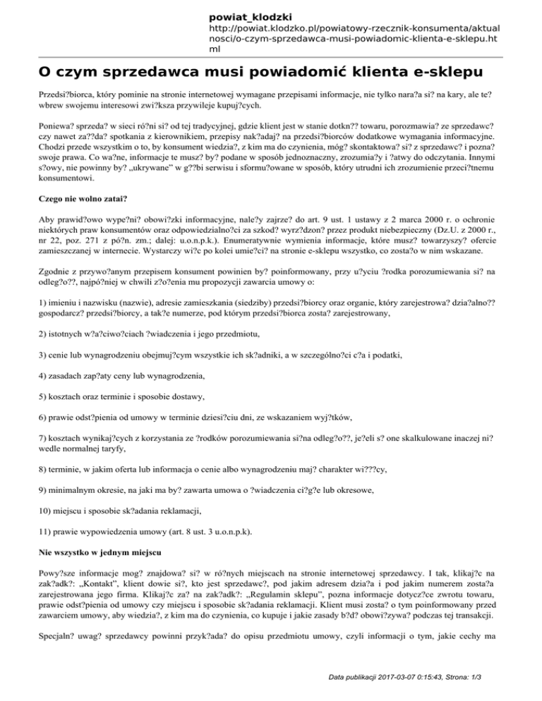 powiat_klodzki http://powiat.klodzko.pl/powiatowy-rzecznik-konsumenta/aktual nosci/o-czym-sprzedawca-musi-powiadomic-klienta-e-sklepu.ht ml O czym sprzedawca musi powiadomić klienta e-sklepu Przedsi?biorca, który pominie na stronie internetowej wymagane przepisami informacje, nie tylko nara?a si? na kary, ale te? wbrew swojemu interesowi zwi?ksza przywileje kupuj?cych. Poniewa? sprzeda? w sieci ró?ni si? od tej tradycyjnej, gdzie klient jest w stanie dotkn?? towaru, porozmawia? ze sprzedawc? czy nawet za??da? spotkania z kierownikiem, przepisy nak?adaj? na przedsi?biorców dodatkowe wymagania informacyjne. Chodzi przede wszystkim o to, by konsument wiedzia?, z kim ma do czynienia, móg? skontaktowa? si? z sprzedawc? i pozna? swoje prawa. Co wa?ne, informacje te musz? by? podane w sposób jednoznaczny, zrozumia?y i ?atwy do odczytania. Innymi s?owy, nie powinny by? „ukrywane” w g??bi serwisu i sformu?owane w sposób, który utrudni ich zrozumienie przeci?tnemu konsumentowi. Czego nie wolno zatai? Aby prawid?owo wype?ni? obowi?zki informacyjne, nale?y zajrze? do art. 9 ust. 1 ustawy z 2 marca 2000 r. o ochronie niektórych praw konsumentów oraz odpowiedzialno?ci za szkod? wyrz?dzon? przez produkt niebezpieczny (Dz.U. z 2000 r., nr 22, poz. 271 z pó?n. zm.; dalej: u.o.n.p.k.). Enumeratywnie wymienia informacje, które musz? towarzyszy? ofercie zamieszczanej w internecie. Wystarczy wi?c po kolei umie?ci? na stronie e-sklepu wszystko, co zosta?o w nim wskazane. Zgodnie z przywo?anym przepisem konsument powinien by? poinformowany, przy u?yciu ?rodka porozumiewania si? na odleg?o??, najpó?niej w chwili z?o?enia mu propozycji zawarcia umowy o: 1) imieniu i nazwisku (nazwie), adresie zamieszkania (siedziby) przedsi?biorcy oraz organie, który zarejestrowa? dzia?alno?? gospodarcz? przedsi?biorcy, a tak?e numerze, pod którym przedsi?biorca zosta? zarejestrowany, 2) istotnych w?a?ciwo?ciach ?wiadczenia i jego przedmiotu, 3) cenie lub wynagrodzeniu obejmuj?cym wszystkie ich sk?adniki, a w szczególno?ci c?a i podatki, 4) zasadach zap?aty ceny lub wynagrodzenia, 5) kosztach oraz terminie i sposobie dostawy, 6) prawie odst?pienia od umowy w terminie dziesi?ciu dni, ze wskazaniem wyj?tków, 7) kosztach wynikaj?cych z korzystania ze ?rodków porozumiewania si?na odleg?o??, je?eli s? one skalkulowane inaczej ni? wedle normalnej taryfy, 8) terminie, w jakim oferta lub informacja o cenie albo wynagrodzeniu maj? charakter wi???cy, 9) minimalnym okresie, na jaki ma by? zawarta umowa o ?wiadczenia ci?g?e lub okresowe, 10) miejscu i sposobie sk?adania reklamacji, 11) prawie wypowiedzenia umowy (art. 8 ust. 3 u.o.n.p.k). Nie wszystko w jednym miejscu Powy?sze informacje mog? znajdowa? si? w ró?nych miejscach na stronie internetowej sprzedawcy. I tak, klikaj?c na zak?adk?: „Kontakt”, klient dowie si?, kto jest sprzedawc?, pod jakim adresem dzia?a i pod jakim numerem zosta?a zarejestrowana jego firma. Klikaj?c za? na zak?adk?: „Regulamin sklepu”, pozna informacje dotycz?ce zwrotu towaru, prawie odst?pienia od umowy czy miejscu i sposobie sk?adania reklamacji. Klient musi zosta? o tym poinformowany przed zawarciem umowy, aby wiedzia?, z kim ma do czynienia, co kupuje i jakie zasady b?d? obowi?zywa? podczas tej transakcji. Specjaln? uwag? sprzedawcy powinni przyk?ada? do opisu przedmiotu umowy, czyli informacji o tym, jakie cechy ma Data publikacji 2017-03-07 0:15:43, Strona: 1/3 powiat_klodzki http://powiat.klodzko.pl/powiatowy-rzecznik-konsumenta/aktual nosci/o-czym-sprzedawca-musi-powiadomic-klienta-e-sklepu.ht ml sprzedawany przez nich produkt. Je?li oferuje w swym sklepie czajnik elektryczny, to powinien poda? nie tylko dane dotycz?ce jego koloru, ale te? pobór energii, pojemno?? itp. (art. 9 ust. 1 pkt 2 u.o.n.p.k). Zdj?cia zamieszczone w e-sklepie stanowi? cz??? oferty. Je?li wi?c sprzedawca publikuje je przy ofercie sprzeda?y towaru, nie mo?e pó?niej wys?a? czego?, co wygl?da inaczej. Sytuacja zmienia si?, gdy wyra?nie zaznacza, ?e oferowany produkt mo?e ró?ni? si? od tego, co przedstawia zdj?cie. Co nale?y uwzgl?dni? w cenie Jedn? z kluczowych informacji, jakie musi pozna? kupuj?cy, jest cena. Musi ona obejmowa? wszystkie sk?adniki. W przepisie mówi si? o c?ach i podatkach, ale chodzi nie tylko o nie. Mówi?c wprost, cena ma obejmowa? ca?? kwot?, jak? przyjdzie zap?aci? klientowi. Nie mo?na wi?c dolicza? np. za przed?u?enie okresu gwarancji, je?li wyra?nie nie zosta?o to wskazane w ofercie. Oprócz ceny sprzedawca musi te? jasno wskaza? koszty dostawy. Te równie? musz? uwzgl?dnia? wszystkie wydatki. Przedsi?biorca nie mo?e wi?c wskazywa?, ?e koszty dostawy to przyk?adowo 10 z?, po czym do rachunku dolicza? dodatkowe 5 z? z tytu?u ubezpieczenia przesy?ki. Dodatkowo trzeba poinformowa? klientów o sposobach p?atno?ci. Czytaj?c przepisy wprost, mo?na nabra? przekonania, ?e p?acenie kart? czy te? przelewem jest niedozwolone. Art. 11 ust. 1 u.o.n.p.k mówi bowiem, ?e w umowie nie wolno nak?ada? na konsumenta obowi?zku zap?aty ceny lub wynagrodzenia przed otrzymaniem ?wiadczenia. Trudno by?oby wymaga?, aby przedsi?biorcy wysy?ali towar jedynie za pobraniem. Dlatego te? przepis jest interpretowany w sposób bardziej dostosowany do dzisiejszych realiów. Zdaniem UOKiK nale?y stosowa? wyk?adni? celowo?ciow?. Cel za? tego przepisu by? taki, by przedsi?biorcy nie zmuszali klientów do p?acenia przed przekazaniem im towaru. Je?li wi?c osoba handluj?ca w internecie dopuszcza kilka rozwi?za?, w tym równie? wys?anie zakupów za pobraniem, to nie ?amie prawa. Bez w?tpienia natomiast za niezgodn? z przepisami nale?y uzna? sprzeda? wy??cznie z opcj? przedp?aty. Wówczas bowiem konsument nie ma ?adnego wyboru. Bez papieru si? nie ob?dzie Szczególnym uprawnieniem klientów e-sklepów jest mo?liwo?? zwrotu towaru bez podawania przyczyn. Ka?dy ma na to 10 dni od momentu otrzymania przesy?ki (art. 7 ust. 1 u.o.n.p.k). Z oczywistych wzgl?dów sprzedawcy nie s? zainteresowani, by szczególnie si? tym chwa