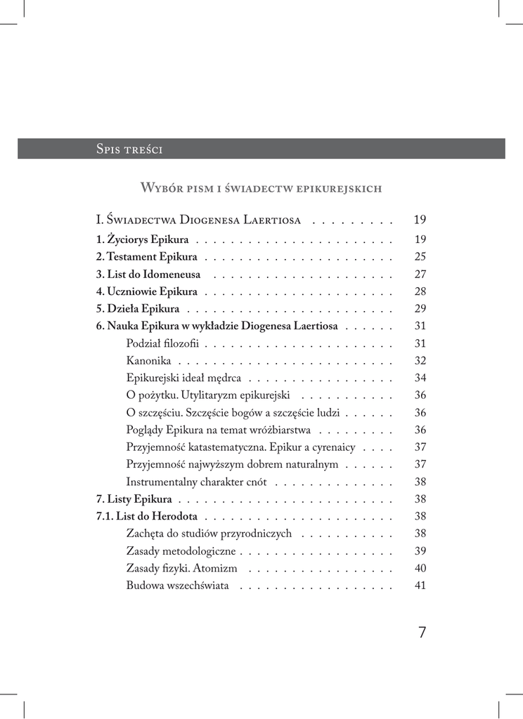 Spis treści Wybór pism i świadectw epikurejskich I. Świadectwa Diogenesa Laertiosa . . . . . . . . . .19 1. Życiorys Epikura . . . . . . . . . . . . . . . . . . . . . . . 19 2. Testament Epikura . . . . . . . . . . . . . . . . . . . . . . 25 3. List do Idomeneusa . . . . . . . . . . . . . . . . . . . . . . 27 4. Uczniowie Epikura . . . . . . . . . . . . . . . . . . . . . . 28 5. Dzieła Epikura . . . . . . . . . . . . . . . . . . . . . . . . 29 6. Nauka Epikura w wykładzie Diogenesa Laertiosa . . . . . . 31 Podział filozofii . . . . . . . . . . . . . . . . . . . . . . 31 Kanonika . . . . . . . . . . . . . . . . . . . . . . . . . . 32 Epikurejski ideał mędrca . . . . . . . . . . . . . . . . . . 34 O pożytku. Utylitaryzm epikurejski . . . . . . . . . . . . 36 O szczęściu. Szczęście bogów a szczęście ludzi . . . . . . 36 Poglądy Epikura na temat wróżbiarstwa . . . . . . . . . . 36 Przyjemność katastematyczna. Epikur a cyrenaicy . . . . . 37 Przyjemność najwyższym dobrem naturalnym . . . . . . . 37 Instrumentalny charakter cnót . . . . . . . . . . . . . . . 38 7. Listy Epikura . . . . . . . . . . . . . . . . . . . . . . . . . 38 7.1. List do Herodota . . . . . . . . . . . . . . . . . . . . . . . 38 Zachęta do studiów przyrodniczych . . . . . . . . . . . . 38 Zasady metodologiczne . . . . . . . . . . . . . . . . . . 39 Zasady fizyki. Atomizm . . . . . . . . . . . . . . . . . . 40 Budowa wszechświata . . . . . . . . . . . . . . . . . . . 41 7 Cząstki elementarne . . . . . . . . . . . . . . . . . . . . 41 Nieskończoność wszechświata . . . . . . . . . . . . . . . 42 Własności atomów . . . . . . . . . . . . . . . . . . . . . 42 Wielość światów . . . . . . . . . . . . . . . . . . . . . . 43 Odbitki i widzenie . . . . . . . . . . . . . . . . . . . . . 44 Słyszenie . . . . . . . . . . . . . . . . . . . . . . . . . . 47 Powonienie . . . . . . . . . . . . . . . . . . . . . . . . . 47 Atomy i ich własności . . . . . . . . . . . . . . . . . . . 48 Dusza i jej natura . . . . . . . . . . . . . . . . . . . . . 51 O własnościach ciał . . . . . . . . . . . . . . . . . . . . 53 O światach cd. . . . . . . . . . . . . . . . . . . . . . . . 55 Realizm poznawczy Epikura. O języku . . . . . . . . . . 56 Badanie ciał niebieskich . . . . . . . . . . . . . . . . . . 57 O przyczynach niepokoju duszy . . . . . . . . . . . . . . 59 Zachęta do studiów przyrodniczych . . . . . . . . . . . . 60 7.2. List do Pytoklesa . . . . . . . . . . . . . . . . . . . . . . . 61 Metoda i cel badań zjawisk niebieskich . . . . . . . . . . 61 Wielość światów . . . . . . . . . . . . . . . . . . . . . . 63 Narodziny świata . . . . . . . . . . . . . . . . . . . . . . 63 Wschody i zachody słońca . . . . . . . . . . . . . . . . . 64 Obroty słońca i księżyca . . . . . . . . . . . . . . . . . . 65 Fazy księżyca . . . . . . . . . . . . . . . . . . . . . . . . 65 Zaćmienie słońca i księżyca . . . . . . . . . . . . . . . . 66 Naturalne przyczyny zjawisk niebieskich . . . . . . . . . 67 Chmury, deszcz, grzmoty i błyskawice . . . . . . . . . . . 68 Cyklony, trzęsienia ziemi i wiatry . . . . . . . . . . . . . 70 Grad, śnieg i rosa . . . . . . . . . . . . . . . . . . . . . . 71 Lód, tęcza, aureola wokół księżyca, komety . . . . . . . . 72 Gwiazdy stałe, ruchome i spadające . . . . . . . . . . . . 74 Znaki przepowiadające pogodę . . . . . . . . . . . . . . 75 8 Spis treści Zachęta do badań zjawisk niebieskich . . . . . . . . . . . 76 7.3. List do Menojkeusa . . . . . . . . . . . . . . . . . . . . . 76 Filozofia drogą do szczęścia . . . . . . . . . . . . . . . . 76 Istnienie bogów . . . . . . . . . . . . . . . . . . . . . . 77 O śmierci . . . . . . . . . . . . . . . . . . . . . . . . . . 77 Rodzaje potrzeb . . . . . . . . . . . . . . . . . . . . . . 79 Przyjemność najwyższym dobrem . . . . . . . . . . . . . 80 Przyjemność jako brak cierpienia . . . . . . . . . . . . . 81 Mądrość etyczna . . . . . . . . . . . . . . . . . . . . . . 81 Mędrzec epikurejski . . . . . . . . . . . . . . . . . . . . 82 Zachęta do filozofii . . . . . . . . . . . . . . . . . . . . 83 8. Główne myśli . . . . . . . . . . . . . . . . . . . . . . . . . 83 II. Sentencje watykańskie . . . . . . . . . . . . . . . .91 III. Świadectwa Cycerona . . . . . . . . . . . . . . . .101 1. Życie Epikura . . . . . . . . . . . . . . . . . . . . . . . . . 101 2. Stosunek Epikura do innych filozofów . . . . . . . . . . . . 102 3. Fizyka Epikura . . . . . . . . . . . . . . . . . . . . . . . . 102 Atomizm . . . . . . . . . . . . . . . . . . . . . . . . . . 102 Próżnia . . . . . . . . . . . . . . . . . . . . . . . . . . . 103 Teoria parenklizy . . . . . . . . . . . . . . . . . . . . . . 103 3. Kanonika . . . . . . . . . . . . . . . . . . . . . . . . . . . 105 Sensualizm epikurejski . . . . . . . . . . . . . . . . . . . 105 O znaczeniu pojęć . . . . . . . . . . . . . . . . . . . . . 106 Stosunek do dialektyki i matematyki . . . . . . . . . . . . 107 4. Etyka . . . . . . . . . . . . . . . . . . . . . . . . . . . . . 109 Główne nauki Epikura („Kyriai doxai”) . . . . . . . . . . 109 O przyjemności jako dobru najwyższym . . . . . . . . . . 109 Pojęcie rozkoszy . . . . . . . . . . . . . . . . . . . . . . 112 Spis treści 9 Rozkosz a cnoty . . . . . . . . . . . . . . . . . . . . . . 114 Pochodzenie przyjemności i cierpienia . . . . . . . . . . . 120 Szczęście a mądrość . . . . . . . . . . . . . . . . . . . . 121 Choroby duszy . . . . . . . . . . . . . . . . . . . . . . . 122 Mędrzec epikurejski . . . . . . . . . . . . . . . . . . . . 123 O przyjaźni . . . . . . . . . . . . . . . . . . . . . . . . . 125 Dobro jako przyjemność zmysłowa . . . . . . . . . . . . 128 Znaczenie wyrazu „hedone” (łac. voluptas) . . . . . . . . 128 Stosunek Epikura do rozpustników . . . . . . . . . . . . 128 Ascetyzm Epikura . . . . . . . . . . . . . . . . . . . . . 129 O szczęśliwości . . . . . . . 