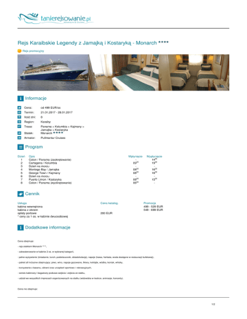 Rejs Karaibskie Legendy z Jamajką i Kostaryką - Monarch Rejs promocyjny Informacje Cena: od 499 EUR/os Termin: 21.01.2017 - 28.01.2017 Ilość dni: 8 Region: Karaiby Trasa: Statek: Panama > Kolumbia > Kajmany > Jamajka > Kostaryka Monarch Armator: Pullmantur Cruises Program Dzień 1 2 3 4 5 6 7 8 Opis Colon / Panama (zaokrętowanie) Cartagena / Kolumbia Dzień na morzu Montego Bay / Jamajka George Town / Kajmany Dzień na morzu Puerto Limon / Kostaryka Colon / Panama (wyokrętowanie) Wpłynięcie 0930 0830 0800 0800 0630 Wypłynięcie 1400 1900 1630 1600 1500 - Cennik Usługa kabina wewnętrzna kabina z oknem opłaty portowe * ceny za 1 os. w kabinie dwuosobowej Cena katalog. 200 EUR Promocja 499 - 529 EUR 549 - 699 EUR Dodatkowe informacje Cena obejmuje: - rejs statkiem Monarch ****, - zakwaterowanie w kabinie 2 os. w wybranej kategorii, - pełne wyżywienie (śniadanie, lunch, podwieczorek, obiadokolację), napoje (kawa, herbata, woda dostępne w restauracji bufetowej), - pakiet all inclusive obejmujący: piwo, wino, napoje gazowane, likiery, koktajle, wódka, koniak, whisky, - korzystanie z basenu, siłowni oraz urządzeń sportowo – rekreacyjnych, - serwis kabinowy i bagażowy podczas wejścia i zejścia ze statku, - udział we wszystkich imprezach organizowanych na statku (widowiska w teatrze, animacje, koncerty). Cena nie obejmuje: 1/2 - opłat portowych, - ubezpieczenia KL, NW i bagażu, - kosztów dojazdu do portu, - wycieczek fakultatywnych zamawianych na pokładzie statku, - korzystania z punktów usługowych (pralnia, fotograf, SPA itp.), - Turystycznego Funduszu Gwarancyjnego (2,90 EUR/rejs/os.), - obowiązkowych napiwków dla załogi 72 EUR/rejs/os. 2/2 Powered by TCPDF (www.tcpdf.org)