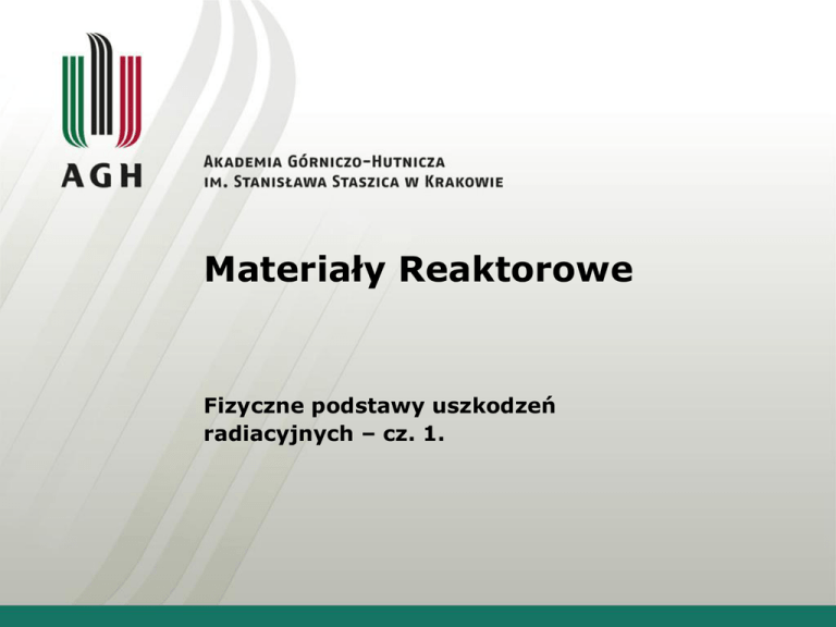 Materiały Reaktorowe Fizyczne podstawy uszkodzeń radiacyjnych – cz. 1. Uszkodzenie radiacyjne Uszkodzenie radiacyjne – przekaz energii od cząstki inicjującej do materiału oraz rozkład jonów w ciele stałym po zakończeniu zdarzenia. Etapy procesu: 1. Oddziaływanie cząstki uderzającej z jonem w sieci krystalicznej. 2. Przekaz energii kinetycznej do jonu – powstanie primary knock-on atom (PKA). 3. Wybicie jonu z jego pozycji sieciowej. 4. Przejście wybitego jonu przez sieć i towarzyszące temu wybijanie innych jonów. 5. Formowanie kaskady ( zbiór defektów punktowych wygenerowanych przez PKA ). 6. Schłodzenie PKA jako jon międzywęzłowy. Uszkodzenie radiacyjne Wynikiem zdarzenia uszkodzenia radiacyjnego jest powstanie zbioru defektów punktowych ( wakacji i jonów międzywęzłowych ) oraz ewentualnie klastrów tych defektów w sieci krystalicznej. Całość procesu trwa ok. 10-11 s. Oddziaływanie neutron - jądro Rozpraszanie elastyczne • Ze względu na neutralność elektryczną neutronu zderzenia elastyczne pomiędzy neutronami i jądrem opisane są jako zderzenia sztywnych kul. • Neutron przechodząc przez ciało stałe posiada skończone prawdopodobieństwo, że zderzy się z jonem w sieci krystalicznej. 4mM 4A M m2 1 A2 T 2 Ei 1 cos m 1; MA Przekaz energii ( energia odrzutu ). Oddziaływanie neutron - jądro Oddziaływanie neutron - jądro s Ei , s Ei , E f , dE f s Ei s Ei , d s Ei , T dT s Ei , d s Ei s Ei , T Ei nie zależy od T !!! T Ei 2 Oddziaływanie neutron - jądro Rozpraszanie nieelastyczne Neutron jest absorbowany przez jądro, które następnie emituje neutron i kwant gamma. Jądro najczęściej pozostaje w stanie wzbudzonym. Reakcje (n, 2n) Powstaje dodatkowy neutron, który może uszkodzenia radiacyjne lub reakcje transmutacji. powodować dalsze Reakcje (n, ) Reakcje tego typu są ważne gdy energia odrzutu jądra jest na tyle duże, że wyrzuci jon z położenia węzłowego. Zwłaszcza ważne w uszkodzeniach zbiornika ciśnieniowego reaktora gdzie strumień jest bardzo duży. Oddziaływanie neutron - jądro Oddziaływania pomiędzy jonami. • Końcowym wynikiem oddziaływania neutron – jon jest utworzenie PKA posiadającego pewną energię kinetyczną. • PKA zaczyna zderzać się z innymi jonami w sieci krystalicznej. • Właściwy opis oddziaływań pomiędzy jonami jest kluczowy w prawidłowym opisie uszkodzeń radiacyjnych. • Zderzenia pomiędzy jonami są rządzone przez prawa mechaniki kwantowej wynikłe z nakrywania się na siebie chmur elektronowych. • Zderzenia te opisuje się przy zastosowaniu potencjałów międzyatomowych. • Nie istnieje jedna wspólna funkcja potencjału opisująca wszystkie typy oddziaływań. • Istnieją różne typy funkcji w zależności od energii i odległości międzyatomowych. Oddziaływania pomiędzy jonami. Oddziaływania pomiędzy jonami. Cu Oddziaływania pomiędzy jonami. (1)– 20 MeV protony (2)- 70 MeV produkty rozszczepienia (3)- 50 keV jony Cu Kaskada • Wybity jon z położenia sieciowego (PKA) przemieszcza się poprzez sieć ze znaczną energią kinetyczną. • W wyniku kolejnych zderzeń z innymi jonami mogą one doznawać przemieszczenia z pozycji sieciowej. • Ilość wybitych jonów z pozycji sieciowych może być bardzo duża. • Może to mieć istotny wpływ na właściwości fizyczne i mechaniczne materiału. Kaskada Prawdopodobieństwo przemieszczenia atomu. Uwzględniając rozmycie wywołane: drganiami jonów, domieszkami, itp. Kaskada Model Kinchin – Pease Określa średnią liczbę przemieszczonych jonów przez PKA o danej energii w sieci krystalicznej. Założenia: 1. Kaskada jest wywoływana na wskutek elastycznych zderzeń pomiędzy dwoma jonami. 2. Prawdopodobieństwo przemieszczenia jest 1 dla E>Ed. 3. Wzbudzenia fononowe są zaniedbywalne. 4. Dla energii wyższych od Ec nie występują zderzenia pomiędzy jonami a jedynie jonizacja jonów. Poniżej energii Ec występują jedynie zderzenia pomiędzy jonami. 5. Transfer energii wskutek zderzeń dany jest modelem sztywnych sfer. 6. Struktura krystaliczna jest zaniedbana. Kaskada Model Kinchin – Pease IV III I II I. Energia PKA jest za mała, żeby wybić jon z położenia sieciowego. II. Tylko jedno przemieszczenie jest możliwe ( PKA albo PKA przekazuje całą swoją energię innemu jonowi ). III. Wzrost energii PKA generuje coraz więcej wybitych jonów. IV. Energia jest na tyle duża, że zaczyna zachodzić jonizacja jonów. Kaskada • Jon w sieci krystalicznej musi otrzymać pewną minimalną ilość energii Ed, aby zostać wybity ze swego położenia równowagi. W przeciwnym razie zaczyna drgać wokół położenia równowagi, które są przekazywane na inne jony powodując wzrost temperatury. • W sieci krystalicznej wielkość Ed zależy od kierunku. rozchodzi się w ściśle przypadkowym kierunku. Kaskada nie • Wielkość Ed szacuje się „z grubsza” na 20 – 25 eV. Szacuje się ją stosując metody symulacyjne. Kaskada • At. K przemieszcza się w kierunku L w sieci FCC. • Ed<110> < Ed<100> < Ed<111> • Ed zależy od: ilości at. bariery B, odległości at. K od bariery y, najmniejszej odległości przy przejściu pomiędzy at. K i B z. • Min. Ed: B, y – małe, z – duże. Kaskada Wpływ struktury krystalicznej • Wyostrzanie ( focusing ) – przekaz energii lub atomów poprzez zderzenia „do przodu” wzdłuż płaszczyzn sieciowych. • Kanałowanie (channeling ) – długozasięgowe przemieszczenia atomów wzdłuż otwartych kierunków krystalograficznych. Oba procesy prowadzą do długozasięgowego transportu defektów daleko od PKA. Kaskada Średnia droga swobodna PKA Kaskada Kaskada Kaskada Kaskada Kaskada Kaskada Kaskada Etapy kaskady: 1. Kolizja – generowanie PKA (t<1ps) 2. Gwałtowne grzanie - (thermal spike) – jon po zderzeniu przekazuje energię jonom sąsiednim (t= 0,1 - 10 ps ). 3. Szybkie chłodzenie – (quenching) – osiągnięcie stanu równowagi termodynamic