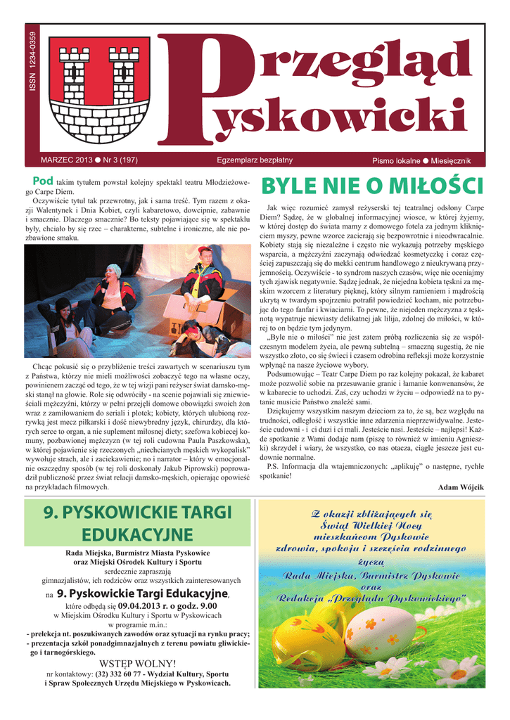 MARZEC 2013 Nr 3 (197) Egzemplarz bezpłatny Pod takim tytułem powstał kolejny spektakl teatru Młodzieżowego Carpe Diem. Oczywiście tytuł tak przewrotny, jak i sama treść. Tym razem z okazji Walentynek i Dnia Kobiet, czyli kabaretowo, dowcipnie, zabawnie i smacznie. Dlaczego smacznie? Bo teksty pojawiające się w spektaklu były, chciało by się rzec – charakterne, subtelne i ironiczne, ale nie pozbawione smaku. Chcąc pokusić się o przybliżenie treści zawartych w scenariuszu tym z Państwa, którzy nie mieli możliwości zobaczyć tego na własne oczy, powinienem zacząć od tego, że w tej wizji pani reżyser świat damsko-męski stanął na głowie. Role się odwróciły - na scenie pojawiali się zniewieściali mężczyźni, którzy w pełni przejęli domowe obowiązki swoich żon wraz z zamiłowaniem do seriali i plotek; kobiety, których ulubioną rozrywką jest mecz piłkarski i dość niewybredny język, chirurdzy, dla których serce to organ, a nie suplement miłosnej diety; szefowa kobiecej komuny, pozbawionej mężczyzn (w tej roli cudowna Paula Paszkowska), w której pojawienie się rzeczonych „niechcianych męskich wykopalisk” wywołuje strach, ale i zaciekawienie; no i narrator – który w emocjonalnie oszczędny sposób (w tej roli doskonały Jakub Piprowski) poprowadził publiczność przez świat relacji damsko-męskich, opierając opowieść na przykładach filmowych. 9. PYSKOWICKIE TARGI EDUKACYJNE Rada Miejska, Burmistrz Miasta Pyskowice oraz Miejski Ośrodek Kultury i Sportu serdecznie zapraszają gimnazjalistów, ich rodziców oraz wszystkich zainteresowanych na 9. Pyskowickie Targi Edukacyjne, które odbędą się 09.04.2013 r. o godz. 9.00 w Miejskim Ośrodku Kultury i Sportu w Pyskowicach w programie m.in.: - prelekcja nt. poszukiwanych zawodów oraz sytuacji na rynku pracy; - prezentacja szkół ponadgimnazjalnych z terenu powiatu gliwickiego i tarnogórskiego. WSTĘP WOLNY! nr kontaktowy: (32) 332 60 77 - Wydział Kultury, Sportu i Spraw Społecznych Urzędu Miejskiego w Pyskowicach. BYLE NIE O MIŁOŚCI Jak więc rozumieć zamysł reżyserski tej teatralnej odsłony Carpe Diem? Sądzę, że w globalnej informacyjnej wiosce, w której żyjemy, w której dostęp do świata mamy z domowego fotela za jednym kliknięciem myszy, pewne wzorce zacierają się bezpowrotnie i nieodwracalnie. Kobiety stają się niezależne i często nie wykazują potrzeby męskiego wsparcia, a mężczyźni zaczynają odwiedzać kosmetyczkę i coraz częściej zapuszczają się do mekki centrum handlowego z nieukrywaną przyjemnością. Oczywiście - to syndrom naszych czasów, więc nie oceniajmy tych zjawisk negatywnie. Sądzę jednak, że niejedna kobieta tęskni za męskim wzorcem z literatury pięknej, który silnym ramieniem i mądrością ukrytą w twardym spojrzeniu potrafił powiedzieć kocham, nie potrzebując do tego fanfar i kwiaciarni. To pewne, że niejeden mężczyzna z tęsknotą wypatruje niewiasty delikatnej jak lilija, zdolnej do miłości, w której to on będzie tym jedynym. „Byle nie o miłości” nie jest zatem próbą rozliczenia się ze współczesnym modelem życia, ale pewną subtelną – smaczną sugestią, że nie wszystko złoto, co się świeci i czasem odrobina refleksji może korzystnie wpłynąć na nasze życiowe wybory. Podsumowując – Teatr Carpe Diem po raz kolejny pokazał, że kabaret może pozwolić sobie na przesuwanie granic i łamanie konwenansów, że w kabarecie to uchodzi. Zaś, czy uchodzi w życiu – odpowiedź na to pytanie musicie Państwo znaleźć sami. Dziękujemy wszystkim naszym dzieciom za to, że są, bez względu na trudności, odległość i wszystkie inne zdarzenia nieprzewidywalne. Jesteście cudowni - i ci duzi i ci mali. Jesteście nasi. Jesteście – najlepsi! Każde spotkanie z Wami dodaje nam (piszę to również w imieniu Agnieszki) skrzydeł i wiary, że wszystko, co nas otacza, ciągle jeszcze jest cudownie normalne. P.S. Informacja dla wtajemniczonych: „aplikuję” o następne, rychłe spotkanie! Adam Wójcik Z okazji zbliżających się Świąt Wielkiej Nocy mieszkańcom Pyskowic zdrowia, spokoju i szczęścia rodzinnego życzą Rada Miejska, Burmistrz Pyskowic oraz Redakcja „Przeglądu Pyskowickiego” 2 Przegl¹d Pyskowicki • nr 3 (197) marzec 2013 Informacje burmistrza LIST OTWARTY DO MIESZKAŃCÓW NIERUCHOMOŚCI WIELOLOKALOWYCH I ICH ZARZĄDCÓW Szanowni Państwo, obowiązkiem ciążącym na każdej gminie z dniem 1 lipca 2013 r. stanie się odbiór i zagospodarowanie odpadów komunalnych wytwarzanych przez jej mieszkańców. W praktyce oznacza to, że Gmina Pyskowice jest zobowiązana do zorganizowania systemu odbioru odpadów komunalnych ze wszystkich nieruchomości zamieszkanych znajdujących się na jej terenie. W związku z tym gmina w drodze przetargu wybierze firmę zajmującą się wywozem odpadów. Oprócz odbioru odpadów komunalnych, gmina jest zobowiązana do odzyskania jak największej ilości surowców wtórnych, tak by na wysypisko tra- fiły tylko te odpady, których już nie da się wykorzystać. Podkreślić trzeba, że każda gmina musi osiągnąć odpowiedni poziom recyklingu, w związku z czym każdy mieszkaniec ma nie tylko prawny, ale i moralny obowiązek segregowania śmieci. Pozyskiwanie surowców wtórnych jest niezwykle ważne i to nie tylko z uwagi, na to, że za brak segregacji można zostać ukaranym. Nadmierne wytwarzanie śmieci może doprowadzić do tego, że po prostu w nich „utoniemy”. Dodatkowym obowiązkiem, który Gmina Pyskowice dobrowolnie przejmie na siebie, jest wyposażenie nieruchomości w pojemniki do zbierania odpadów oraz utrzymanie ich w należytym stanie sanitarnym, porządkowym i technicznym. Stało się to możliwe dzięki ostatniej nowelizacji ustawy o utrzymaniu czystości i porządku w gminach. Jeszcze w zeszłym roku, gdy Rada Miejska podejmowała uchwały wprowadzające nowy system, mimo dużego zapotrzebowania społe
