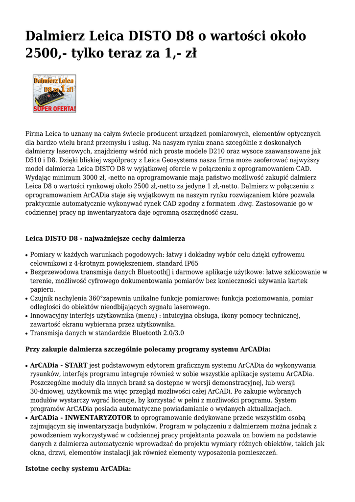 Dalmierz Leica DISTO D8 o wartości około 2500,- tylko teraz za 1,- zł Firma Leica to uznany na całym świecie producent urządzeń pomiarowych, elementów optycznych dla bardzo wielu branż przemysłu i usług. Na nasyzm rynku znana szcególnie z doskonałych dalmierzy laserowych, znajdziemy wśród nich proste modele D210 oraz wysoce zaawansowane jak D510 i D8. Dzięki bliskiej współpracy z Leica Geosystems nasza firma może zaoferować najwyższy model dalmierza Leica DISTO D8 w wyjątkowej ofercie w połączeniu z oprogramowaniem CAD. Wydając minimum 3000 zł, -netto na oprogramowanie maja państwo możliwość zakupić dalmierz Leica D8 o wartości rynkowej około 2500 zł,-netto za jedyne 1 zł,-netto. Dalmierz w połączeniu z oprogramowaniem ArCADia staje się wyjątkowym na naszym rynku rozwiązaniem które pozwala praktycznie automatycznie wykonywać rynek CAD zgodny z formatem .dwg. Zastosowanie go w codziennej pracy np inwentaryzatora daje ogromną oszczędność czasu. Leica DISTO D8 - najważniejsze cechy dalmierza ● ● ● ● ● Pomiary w każdych warunkach pogodowych: łatwy i dokładny wybór celu dzięki cyfrowemu celownikowi z 4-krotnym powiększeniem, standard IP65 Bezprzewodowa transmisja danych Bluetooth i darmowe aplikacje użytkowe: łatwe szkicowanie w terenie, możliwość cyfrowego dokumentowania pomiarów bez konieczności używania kartek papieru. Czujnik nachylenia 360°zapewnia unikalne funkcje pomiarowe: funkcja poziomowania, pomiar odległości do obiektów nieodbijających sygnału laserowego. Innowacyjny interfejs użytkownika (menu) : intuicyjna obsługa, ikony pomocy technicznej, zawartość ekranu wybierana przez użytkownika. Transmisja danych w standardzie Bluetooth 2.0/3.0 Przy zakupie dalmierza szczególnie polecamy programy systemu ArCADia: ● ● ArCADia - START jest podstawowym edytorem graficznym systemu ArCADia do wykonywania rysunków, interfejs programu integruje również w sobie wszystkie aplikacje systemu ArCADia. Poszczególne moduły dla innych branż są dostępne w wersji demonstracyjnej, lub wersji 30-dniowej, użytkownik ma więc przegląd możliwości całej ArCADi. Po zakupie wybranych modułów wystarczy wgrać licencje, by korzystać w pełni z możliwości programu. System programów ArCADia posiada automatyczne powiadamianie o wydanych aktualizacjach. ArCADia - INWENTARYZOTOR to oprogramowanie dedykowane przede wszystkim osobą zajmującym się inwentaryzacja budynków. Program w połączeniu z dalmierzem można jednak z powodzeniem wykorzystywać w codziennej pracy projektanta pozwala on bowiem na podstawie danych z dalmierza automatycznie wprowadzać do projektu wymiary różnych obiektów, takich jak okna, drzwi, elementów instalacji jak również elementy wyposażenia pomieszczeń. Istotne cechy systemu ArCADia: ● ● ● ● ● ● Komunikacja systemu ArCADia z urządzeniami bluetooth. Automatyczne wykonywanie rysunku w środowisku CAD z zapisem do formatu .dwg na podstawie danych z dalmierza. ArCADia-START to w pełni funkcjonalny edytor CAD z obsługą plików .dwg zgodnych ze standardem programu AutoCAD 2009. Współpraca z programem ArCADia-INTELLICAD 2009 oraz ArCADia-INTELLICAD 7 Współpraca z programem AutoCAD 2011/2012/2013 również w wersji 64bit. Programy ArCADia wówczas instalują się i pracują jako nakładki programu AutoCAD. Przyjazny interfejs użytkownika integrujący wszystkie moduły ArCADia. Ograniczona czasowo możliwość (9 miesięcy) korzystania z pełnych wersji wszystkich modułów systemu ArCADia pod warunkiem zakupu modułu ArCADia-ARCHITEKTURA. KONTAKT INTERsoft E-mail: [email protected] WWW: www.intersoft.pl Tel: +48 42 689 11 01 Fax: +48 42 689 11 00 Adres: Sienkiewicza 85/87 90-057 Łódź