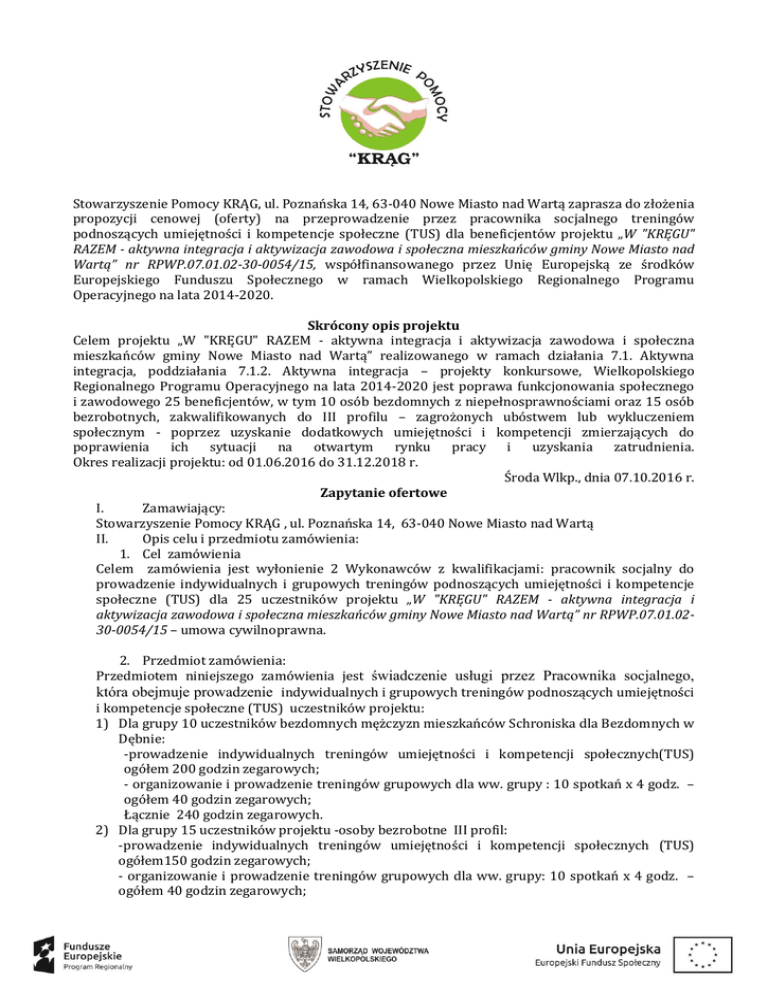 Stowarzyszenie Pomocy KRĄG, ul. Poznańska 14, 63-040 Nowe Miasto nad Wartą zaprasza do złożenia propozycji cenowej (oferty) na przeprowadzenie przez pracownika socjalnego treningów podnoszących umiejętności i kompetencje społeczne (TUS) dla beneficjentów projektu „W "KRĘGU" RAZEM - aktywna integracja i aktywizacja zawodowa i społeczna mieszkańców gminy Nowe Miasto nad Wartą” nr RPWP.07.01.02-30-0054/15, współfinansowanego przez Unię Europejską ze środków Europejskiego Funduszu Społecznego w ramach Wielkopolskiego Regionalnego Programu Operacyjnego na lata 2014-2020. Skrócony opis projektu Celem projektu „W "KRĘGU" RAZEM - aktywna integracja i aktywizacja zawodowa i społeczna mieszkańców gminy Nowe Miasto nad Wartą” realizowanego w ramach działania 7.1. Aktywna integracja, poddziałania 7.1.2. Aktywna integracja – projekty konkursowe, Wielkopolskiego Regionalnego Programu Operacyjnego na lata 2014-2020 jest poprawa funkcjonowania społecznego i zawodowego 25 beneficjentów, w tym 10 osób bezdomnych z niepełnosprawnościami oraz 15 osób bezrobotnych, zakwalifikowanych do III profilu – zagrożonych ubóstwem lub wykluczeniem społecznym - poprzez uzyskanie dodatkowych umiejętności i kompetencji zmierzających do poprawienia ich sytuacji na otwartym rynku pracy i uzyskania zatrudnienia. Okres realizacji projektu: od 01.06.2016 do 31.12.2018 r. Środa Wlkp., dnia 07.10.2016 r. Zapytanie ofertowe I. Zamawiający: Stowarzyszenie Pomocy KRĄG , ul. Poznańska 14, 63-040 Nowe Miasto nad Wartą II. Opis celu i przedmiotu zamówienia: 1. Cel zamówienia Celem zamówienia jest wyłonienie 2 Wykonawców z kwalifikacjami: pracownik socjalny do prowadzenie indywidualnych i grupowych treningów podnoszących umiejętności i kompetencje społeczne (TUS) dla 25 uczestników projektu „W "KRĘGU" RAZEM - aktywna integracja i aktywizacja zawodowa i społeczna mieszkańców gminy Nowe Miasto nad Wartą” nr RPWP.07.01.0230-0054/15 – umowa cywilnoprawna. 2. Przedmiot zamówienia: Przedmiotem niniejszego zamówienia jest świadczenie usługi przez Pracownika socjalnego, która obejmuje prowadzenie indywidualnych i grupowych treningów podnoszących umiejętności i kompetencje społeczne (TUS) uczestników projektu: 1) Dla grupy 10 uczestników bezdomnych mężczyzn mieszkańców Schroniska dla Bezdomnych w Dębnie: -prowadzenie indywidualnych treningów umiejętności i kompetencji społecznych(TUS) ogółem 200 godzin zegarowych; - organizowanie i prowadzenie treningów grupowych dla ww. grupy : 10 spotkań x 4 godz. – ogółem 40 godzin zegarowych; Łącznie 240 godzin zegarowych. 2) Dla grupy 15 uczestników projektu -osoby bezrobotne III profil: -prowadzenie indywidualnych treningów umiejętności i kompetencji społecznych (TUS) ogółem150 godzin zegarowych; - organizowanie i prowadzenie treningów grupowych dla ww. grupy: 10 spotkań x 4 godz. – ogółem 40 godzin zegarowych; Łącznie 190 godzin zegarowych. Ponadto do zadań Pracownika socjalnego należeć będzie: - prowadzenie wymaganej dokumentacji: list obecności, dokumentacji świadczenia usług zgodnie z ustalonym wzorem oraz przekazywanie dokumentów Zamawiającemu - uczestnictwo w realizacji Indywidualnego Programu Wychodzenia z Bezdomności, - ścisła współpraca z koordynatorem projektu, koordynatorem merytorycznym i zespołem projektowym, - dołożenie należytej staranności przy wykonaniu przedmiotu zamówienia. III. Zamawiający dopuszcza składanie ofert częściowych dotyczących grup uczestników projektu i/lub rodzaju wsparcia. IV. Termin realizacji: Od 01.11.2016 r. do 31.12.2018 r. - szczegółowe terminy wykonania usługi - po uzgodnieniu z Zamawiającym. V. Miejsce realizacji zamówienia: Schronisko dla Bezdomnych w Dębnie VI. Opis przygotowania oferty cenowej: a. b. ofertę należy dostarczyć do Stowarzyszenia Pomocy KRĄG ul. Poznańska 14 63-040 Nowe Miasto nad Wartą osobiście, pocztą (decyduje data wpływu do Zamawiającego) lub drogą elektroniczną na adres: [email protected] do dnia 17.10.2016 r. do godz. 15.00. propozycję cenową należy złożyć na formularzu stanowiącym załącznik do zapytania. VII. Kryteria oceny oferty: a. Cena – 50%: Cena powinna być podana w złotych wraz ze wszystkimi należnymi podatkami i obciążeniami. Punkty przyznane za kryterium cena będą liczone wg. wzoru: C=(Cmin:C0) x 50, gdzie: C – liczba punktów, Cmin - najniższa cena spośród ważnych ofert, C0 – cena badanej oferty. Maksymalna liczba punktów do uzyskania przez Wykonawcę – 45. b. Doświadczenie zawodowe – 50% Przez doświadczenie Wykonawcy rozumie się staż pracy z osobami zagrożonymi wykluczeniem społecznym – należy wypisać w tabelę stanowiącą załącznik do Formularza Ofertowego. Punkty przyznane za kryterium doświadczenie: 1) 2-5 lat:10 pkt; 6-10lat:15pkt; 11-15lat:20pkt; 16-20lat 25pkt.; powyżej 21lat:30pkt 2) doświadczenie zawodowe w pracy z osobami niepełnosprawnymi i/lub bezdomnymi i/lub klientami pomocy społecznej: maksymalnie 15 pkt. (po 5 pkt za posiadane doświadczenie w pracy z każdą grupą w okresie ostatnich dwóch lat). Maksymalna liczba punktów do uzyskania przez Wykonawcę – 45. Łącznie Wykonawca może uzyskać 90 punktów. W przypadku złożenia kilku ofert o takiej samej liczbie punktów – decydować będzie Zamawiający po przeprowadzeniu rozmów z oferentami. VIII. Warunki udziału w postępowaniu 1. Wykształcenie kierunkowe; 2. Minimum 2 letnie doświadczenie zawodowe w pracy z osobami zagrożonymi ubóstwem lub wykluczeniem społecznym; 3. Zamawiający w trosce o należyte wykonanie powierzonych zadań zastrzega sobie prawo do wglądu w dokumentację potwierdzającą wykształcenie i doświadczenie oferenta, w tym zwłaszcza dyplomy, certyfikaty, referencje. W razie nieudostępnienia Zamawiającemu ww. dokumentów oferta ulega odrzuceniu. IX. Informacje dotyczące wyboru najkorzystniejszej oferty: O wyb