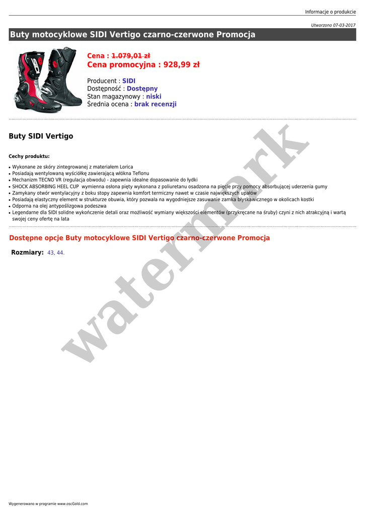 Informacje o produkcie Utworzono 07-03-2017 Buty motocyklowe SIDI Vertigo czarno-czerwone Promocja Cena : 1.079,01 zł Cena promocyjna : 928,99 zł Producent : SIDI Dostępność : Dostępny Stan magazynowy : niski Średnia ocena : brak recenzji Cechy produktu: ● ● ● ● ● ● ● ● er m ar k Buty SIDI Vertigo Wykonane ze skóry zintegrowanej z materiałem Lorica Posiadają wentylowaną wyściółkę zawierającą włókna Teflonu Mechanizm TECNO VR (regulacja obwodu) - zapewnia idealne dopasowanie do łydki SHOCK ABSORBING HEEL CUP wymienna osłona pięty wykonana z poliuretanu osadzona na pięcie przy pomocy absorbującej uderzenia gumy Zamykany otwór wentylacyjny z boku stopy zapewnia komfort termiczny nawet w czasie największych upałów Posiadają elastyczny element w strukturze obuwia, który pozwala na wygodniejsze zasuwanie zamka błyskawicznego w okolicach kostki Odporna na olej antypoślizgowa podeszwa Legendarne dla SIDI solidne wykończenie detali oraz możliwość wymiany większości elementów (przykręcane na śruby) czyni z nich atrakcyjną i wartą swojej ceny ofertę na lata Dostępne opcje Buty motocyklowe SIDI Vertigo czarno-czerwone Promocja w at Rozmiary: 43, 44. Wygenerowano w programie www.oscGold.com