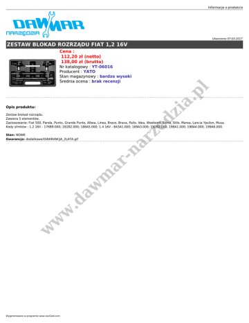 Informacje o produkcie Utworzono 07-03-2017 ZESTAW BLOKAD ROZRZĄDU FIAT 1,2 16V Cena : 112,20 zł (netto) 138,00 zł (brutto) zi a. p l Nr katalogowy : YT-06016 Producent : YATO Stan magazynowy : bardzo wysoki Średnia ocena : brak recenzji Opis produktu: ar ze d Zestaw blokad rozrządu. Zawiera 5 elementów. Zastosowanie: Fiat 500, Panda, Punto, Grande Punto, Albea, Linea, Bravo, Brava, Palio, Idea, Weekend, Siena, Stilo, Marea, Lancia Ypsilon, Musa. Kody silników : 1.2 16V - 176B9.000; 182B2.000; 188A5.000; 1.4 16V - 843A1.000; 169A3.000; 192B2.000; 198A1.000; 198A4.000; 199A6.000. w w w .d aw m ar -n Stan: NOWE Gwarancja: dodatkowe/GWARANCJA_2LATA.gif Wygenerowano w programie www.oscGold.com