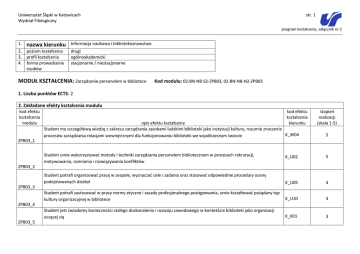 Uniwersytet Śląski w Katowicach Wydział Filologiczny str. 1 program kształcenia, załącznik nr 2 1. nazwa kierunku Informacja naukowa i bibliotekoznawstwo 2. 3. 4. poziom kształcenia profil kształcenia forma prowadzenia studiów drugi ogólnoakademicki stacjonarne / niestacjonarne MODUŁ KSZTAŁCENIA: Zarządzanie personelem w bibliotece Kod modułu: 02-BN-NB-S2-ZPB03, 02-BN-NB-N2-ZPB03 1. Liczba punktów ECTS: 2 2. Zakładane efekty kształcenia modułu kod efektu kształcenia modułu kod efektu kształcenia kierunku opis efektu kształcenia Student ma szczegółową wiedzę z zakresu zarządzania zasobami ludzkimi biblioteki jako instytucji kultury, rozumie znaczenie K_W04 procesów zarządzania relacjami wewnętrznymi dla funkcjonowaniu biblioteki we współczesnym świecie stopień realizacji (skala 1-5) 5 ZPB03_1 Student umie wykorzystywać metody i techniki zarządzania personelem bibliotecznym w procesach rekrutacji, motywowania, oceniania i rozwiązywania konfliktów K_U02 5 Student potrafi organizować pracę w zespole, wyznaczać cele i zadania oraz stosować odpowiednie procedury oceny podejmowanych działań K_U05 4 Student potrafi zastosować w pracy normy etyczne i zasady profesjonalnego postępowania, umie kształtować pożądany typ kultury organizacyjnej w bibliotece K_U10 4 Student jest świadomy konieczności stałego doskonalenia i rozwoju zawodowego w kontekście biblioteki jako organizacji uczącej się K_K01 3 ZPB03_2 ZPB03_3 ZPB03_4 ZPB03_5 Uniwersytet Śląski w Katowicach Wydział Filologiczny str. 2 program kształcenia, załącznik nr 2 Student rozumie znaczenie zarządzania personelem biblioteki dla kreowania jej wizerunku jako nowoczesnej organizacji K_K07 ZPB03_6 3. Opis modułu Opis Wymagania wstępne modułu 4 Celem modułu jest zapoznanie studentów z metodami i technikami zarządzania zasobami ludzkimi biblioteki. Dzięki wykorzystaniu metod aktywizujących oraz w oparciu o analizę i krytyczną ocenę przykładów case study studenci poznają procedury rekrutacji i doboru kadr bibliotecznych, sposoby i narzędzia motywowania pracowników, czynniki wpływające na kulturę organizacyjną biblioteki. Realizując projekty indywidualne i zadania zespołowe nauczą się odpowiedzialności za własne decyzje i zasad pracy grupowej, w tym sposobów rozwiązywania konfliktów Podstawowa wiedza z zakresu bibliotekarstwa, znajomość specyfiki biblioteki jako instytucji kultury i form jej działalności, podstawowa wiedza z zakresu zarządzania. 4. Sposoby weryfikacji efektów kształcenia modułu kod ZPB03_w_1 nazwa (typ) sposobu weryfikacji Test ZPB03_w_2 Projekt ZPB03_w_3 Projekt ZPB03_w_4 Projekt opis szczegółowy Test pisemny sprawdzający poziom przyswojenia treści analizowanych w czasie zajęć Przygotowanie indywidualnie dokumentów aplikacyjnych (CV oraz list motywacyjny) oraz przejście próbnej rozmowy kwalifikacyjnej Przygotowanie w grupach wstępnego projektu ocen okresowych pracowników wybranej biblioteki Przygotowanie w grupach do debaty oksfordzkiej na zadany temat efekt(-y) kształcenia modułu ZPB03_1 ZPB03_1, ZPB03_2, ZPB03_3, ZPB03_4, ZPB03_5, ZPB03_6 ZPB03_1, ZPB03_2, ZPB03_3, ZPB03_4, ZPB03_5, ZPB03_6 ZPB03_1, ZPB03_2, ZPB03_3, ZPB03_4, ZPB03_5, ZPB03_6 5.a Formy prowadzenia zajęć (studia prowadzone w formie stacjonarnej) forma prowadzenia zajęć praca własna studenta sposób weryfikacji punkty Uniwersytet Śląski w Katowicach Wydział Filologiczny str. 3 program kształcenia, załącznik nr 2 nazwa ZPB03_fs_1 Ćwiczen ia opis (z uwzględnieniem metod liczba dydaktycznych) godzin Ćwiczenia, w trakcie których studenci 15 omawiają zadane teksty, analizują przykłady case study, uczestniczą w dyskusjach i ćwiczeniach praktycznych indywidualnie i w grupach suma godzin: 15 opis Lektura zadanych tekstów poszerzających wiedzę, przygotowanie projektów zgodnie z wymogami prowadzącego liczba godzin 45 suma godzin: 45 efektów kształcenia ZPB03_w_1, ZPB03_w_2, ZPB03_w_3, ZPB03_w_4 ECTS 2 suma punktów: 2 5.a Formy prowadzenia zajęć (studia prowadzone w formie niestacjonarnej) nazwa ZPB03_fns_1 Ćwiczen ia forma prowadzenia zajęć opis (z uwzględnieniem metod liczba dydaktycznych) godzin Ćwiczenia, w trakcie których studenci 10 omawiają zadane teksty, analizują przykłady case study, uczestniczą w dyskusjach i ćwiczeniach praktycznych indywidualnie i w grupach suma godzin: 10 praca własna studenta opis Lektura zadanych tekstów poszerzających wiedzę, przygotowanie projektów zgodnie z wymogami prowadzącego liczba godzin 50 suma godzin: 50 sposób weryfikacji efektów kształcenia ZPB03_w_1, ZPB03_w_2, ZPB03_w_3, ZPB03_w_4 punkty ECTS 2 suma punktów: 2