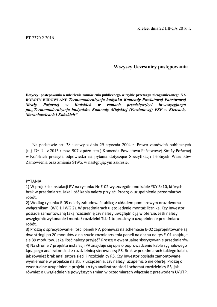 Kielce, dnia 22 LIPCA 2016 r. PT.2370.2.2016 Wszyscy Uczestnicy postępowania Dotyczy: postępowania o udzielenie zamówienia publicznego w trybie przetargu nieograniczonego NA ROBOTY BUDOWLANE Termomodernizacja budynku Komendy Powiatowej Państwowej Straży Pożarnej w Końskich w ramach przedsięwzięci inwestycyjnego pn.„Termomodernizacja budynków Komendy Miejskiej (Powiatowej) PSP w Kielcach, Starachowicach i Końskich” Na podstawie art. 38 ustawy z dnia 29 stycznia 2004 r. Prawo zamówień publicznych (t. j. Dz. U. z 2013 r. poz. 907 z późn. zm.) Komenda Powiatowa Państwowej Straży Pożarnej w Końskich przesyła odpowiedzi na pytania dotyczące Specyfikacji Istotnych Warunków Zamówienia oraz zmienia SIWZ w następującym zakresie. PYTANIA 1) W projekcie instalacji PV na rysunku Nr E-02 wyszczególniono kable YKY 5x10, których brak w przedmiarze. Jaka ilość kabla należy przyjąć. Proszę o uzupełnienie przedmiarów robót. 2) Według rysunku E-05 należy zabudować tablicę z układem pomiarowym oraz dwoma wyłącznikami (WG 1 i WG 2). W przedmiarach ujęto jedynie montaż licznika. Czy Inwestor posiada zamontowaną taką rozdzielnię czy należy uwzględnić ją w ofercie. Jeśli należy uwzględnić wykonanie i montaż rozdzielni TLL-1 to prosimy o uzupełnienie przedmiaru robót. 3) Proszę o sprecyzowanie ilości paneli PV, ponieważ na schemacie E-02 zaprojektowane są dwa stringi po 20 modułów a na rzucie rozmieszczenia paneli na dachu na rys E-01 znajduje się 39 modułów. Jaką ilość należy przyjąć? Proszę o ewentualne skorygowanie przedmiarów. 4) Na stronie 7 projektu instalacji PV znajduje się opis o poprowadzeniu kabla sygnałowego łączącego analizator sieci z rozdzielnicą sterowniczą RS. Brak w przedmiarach takiego kabla, jak również brak analizatora sieci i rozdzielnicy RS. Czy Inwestor posiada zamontowane wymienione w projekcie na str. 7 urządzenia, czy należy uzupełnić o nie ofertę. Proszę o ewentualne uzupełnienie projektu o typ analizatora sieci i schemat rozdzielnicy RS, jak również o uwzględnienie powyższych zmian w przedmiarach włącznie z przewodem U/UTP. 5) W przedmiarze robót branży elektrycznej poz. 7 znajduje się sterownik typu P1 prod. PROMAG. Nie znaleźliśmy takiego sterownika w projekcie instalacji PV ani w opisie ani na schematach. Proszę o uzupełnienie projektu. 6) W sprawie rozbieżności projektowych. Dokumentacja techniczna rys nt BUD WYK 003 zawiera w swym zakresie wyłącznie wzmocnienie istniejącej konstrukcji dachu ceownikiem zimni giętym 200x48x1,5 czego nie potwierdza cześć opisowa załączonej dokumentacji. Przedmiar robót /poz 97-103/ w swym zakresie obejmuje wykonanie nowej konstrukcji nośnej w wadze oko ło 11 ton stali konstrukcyjnej. ODPOWIEDZI Odpowiedz na pytanie 1-5 w przedmiarach. Odpowiedz na pytanie 6 Informujemy że zgodnie z zapisami w projekcie w pkt 3.4. opisu technicznego: „Wszystkie elementy ujęte w opisie a nie ujęte na rysunkach lub ujęte na rysunkach a nie ujęte w specyfikacji (opisie) winne być traktowane tak jakby były ujęte w obu” Ponadto pozycje przedmiarowe o nr 97 do 99 dotyczą wykonania konstrukcji uzupełniających z profili zimnogiętych z przeznaczeniem pod montaż zabudowy z karton-gipsu. Natomiast pozycje o nr 100 do 103 należy poddać przemalowaniu po uprzednim ich oczyszczeniu. Otrzymują: 1. Wszyscy Uczestnicy postępowania 2. A/a 3. Publikacja: www.strazkonskie.pl