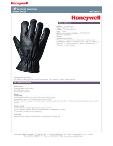 WINTER DRIVER REF. 2001612 OGÓLNE DANE Oddział : Ochrona ciała Grupa : Rękawice ochronne Zakres : Ochrona termiczna Linia : Zimno Marka znana poprzednio jako : PERFECT FIT Business Countries Poland Domeny aktywności : Rolnictwo • Budownictwo • Energia lub elektryczność • Przestrzenie zielone • Przemysł żelaza i stali • Logistyka • Nabrzeża • Telekomunikacja • Usługi • Laboratorium • Przemysł • Administracja Użytkowanie produktu : For medium handling in dry or damp environment. Cold resistant . Heavy handling glove. ZALETY PRODUKTÓW Właściwości : Cowhide grain leather glove. Brushed fleece lining. Elasticated at the back. Zaleta : COMFORT The lining increases the glove's comfort and heat insulation. Elasticated at the wrist, the glove offers added support. The US assembly, winged thumb and flexible materials used make this glove anatomical, thus providing excellent comfort for use. RESISTANCE Cowhide leather provides good mechanical resistance. Its US assembly ensures a longer life while reducing the number of seams. The lining brings a good cold resistance. HYGIENE Its black colour makes it more soilproof, thus ensuring a longer last. OPIS TECHNICZNY Opis : CE CATEGORY : II intermediary risks In accordance with NF EN 420-2003 Basic standards. NF EN 388-2003 Mechanical risks. NF EN 511-2006 Cold risks CHARATERISTICS 5 fingers glove in black cow grain. American cut, straight thumb. Lined molleton. Elastic wrist. HARMELESSNESS This article does not contain substances that may provoke allergic reactions other than : pH value: between 3,5 and 9,5 Chrome content: inferior at 10 mg/kg other substances : without object Technologia produktu : Szyte z kawałków Długość : 260 mm Nieszkodliwość : In conformity with european standards Zręczność : Klasa 5 Rozmiar : 8 - 10 - 9 EN 388 - Mechaniczne czynniki ryzyka Odporność na ścieranie : 2 Odporność na przecięcie : 2 Odporność na rozerwanie : 2 Odporność na perforację : 2 EN 511 - Ochrona w niskich temperaturach Odporne na zimno przenoszone przez przewodzenie: 1 Odporne na zimno przenoszone w kontakcie ze źródłem: 1 Przepuszczalność wody: 0 INFORMACJE DODATKOWE Dane dotyczące przechowywania : packed by 10 pairs in cartons of 100 Pairs Instrukcja obchodzenia się z produktem : In order to keep its mechanical properties, this article should not be cleaned. Numer instrukcji użytkownika : 102 CERTYFIKATY I ZGODNOŚĆ Dyrektywy Unii Europejskiej : 89/686/EEC Kategoria UE Środki ochrony osobistej* : Klasa 2 Normy : EN 420 / EN 388 / EN 511 Tagging : CE SPERIAN 20 016 12 T09 EN 388 : 2222 EN 511 : 110 Zapewnienie jakości : ISO 9001 / 2000 DEKLARACJA ZGODNOŚCI UE Producent lub jego prawny przedstawiciel/dostawca z siedzibą na terenie Unii Europejskiej: Sperian Protection Europe Stwierdza, że opisane tutaj środki ochrony osobistej są zgodne z postaniowieniami Dyrektywy 89/686/CEE Rady Europy: Designation: WINTER DRIVER Reference: 2001612 Standard(s): EN 420 EN 388 EN 511 ŚOO podlega powyższemu typowi atestu UE: 0075/797/162/03/07/0098 Delivered by: CENTRE TECHNIQUE DU CUIR 4 rue Hermann Frenkel 69367 Lyon Cedex 07 France Sporządzono w Roissy, na 06/22/2007 przez: Grégory Tessier Oddział: Ochrona ciała