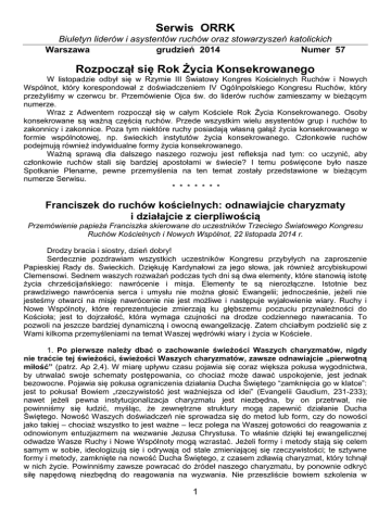 Serwis ORRK Biuletyn liderów i asystentów ruchów oraz stowarzyszeń katolickich Warszawa grudzień 2014 Numer 57 Rozpoczął się Rok Życia Konsekrowanego W listopadzie odbył się w Rzymie III Światowy Kongres Kościelnych Ruchów i Nowych Wspólnot, który korespondował z doświadczeniem IV Ogólnpolskiego Kongresu Ruchów, który przeżyliśmy w czerwcu br. Przemówienie Ojca św. do liderów ruchów zamieszamy w bieżącym numerze. Wraz z Adwentem rozpoczął się w całym Kościele Rok Życia Konsekrowanego. Osoby konsekrowane są ważną częścią ruchów. Przede wszystkim wielu asystentów grup i ruchów to zakonnicy i zakonnice. Poza tym niektóre ruchy posiadają własną gałąź życia konsekrowanego w formie wspólnotowej, np. świeckich instytutów życia konsekrowanego. Członkowie ruchów podejmują również indywidualne formy życia konsekrowanego. Ważną sprawą dla dalszego naszego rozwoju jest refleksja nad tym: co uczynić, aby członkowie ruchów stali się bardziej apostołami w świecie? I temu poświęcone było nasze Spotkanie Plenarne, pewne przemyślenia na ten temat zostały przedstawione w bieżącym numerze Serwisu. * * * * * * * Franciszek do ruchów kościelnych: odnawiajcie charyzmaty i działajcie z cierpliwością Przemówienie papieża Franciszka skierowane do uczestników Trzeciego Światowego Kongresu Ruchów Kościelnych i Nowych Wspólnot, 22 listopada 2014 r. Drodzy bracia i siostry, dzień dobry! Serdecznie pozdrawiam wszystkich uczestników Kongresu przybyłych na zaproszenie Papieskiej Rady ds. Świeckich. Dziękuję Kardynałowi za jego słowa, jak również arcybiskupowi Clemensowi. Sednem waszych rozważań podczas tych dni są dwa elementy, które stanowią istotę życia chrześcijańskiego: nawrócenie i misja. Elementy te są nierozłączne. Istotnie bez prawdziwego nawrócenia serca i umysłu nie można głosić Ewangelii; jednocześnie, jeżeli nie jesteśmy otwarci na misję nawrócenie nie jest możliwe i następuje wyjałowienie wiary. Ruchy i Nowe Wspólnoty, które reprezentujecie zmierzają ku głębszemu poczuciu przynależności do Kościoła; jest to dojrzałość, która wymaga czujności na drodze codziennego nawracania. To pozwoli na jeszcze bardziej dynamiczną i owocną ewangelizację. Zatem chciałbym podzielić się z Wami kilkoma przemyśleniami na temat Waszej wędrówki wiary i życia w Kościele. 1. Po pierwsze należy dbać o zachowanie świeżości Waszych charyzmatów, nigdy nie traćcie tej świeżości, świeżości Waszych charyzmatów, zawsze odnawiajcie „pierwotną miłość” (patrz. Ap 2,4). W miarę upływu czasu pojawia się coraz większa pokusa wygodnictwa, by utrwalać swoje schematy postępowania, co chociaż może dawać uspokojenie, jest jednak bezowocne. Pojawia się pokusa ograniczenia działania Ducha Świętego “zamknięcia go w klatce”: jest to pokusa! Bowiem „rzeczywistość jest ważniejsza od idei” (Evangelii Gaudium, 231-233); nawet jeżeli pewna instytucjonalizacja charyzmatu jest niezbędna, by on przetrwał, nie powinniśmy się łudzić, myśląc, że zewnętrzne struktury mogą zapewnić działanie Ducha Świętego. Nowość Waszych doświadczeń nie sprowadza się do metod lub form, czy do nowości jako takiej – chociaż wszystko to jest ważne – lecz polega na Waszej gotowości do reagowania z odnowionym entuzjazmem na wezwanie Jezusa Chrystusa. To właśnie dzięki tej ewangelicznej odwadze Wasze Ruchy i Nowe Wspólnoty mogą wzrastać. Jeżeli formy i metody stają się celem samym w sobie, ideologizują się i odrywają od stale zmieniającej się rzeczywistości; te sztywne formy i metody, zamknięte na nowość Ducha Świętego, z czasem zdławią charyzmat, który tchnął w nich życie. Powinniśmy zawsze powracać do źródeł naszego charyzmatu, by ponownie odkryć siłę napędową niezbędną do reagowania na wyzwania. Nie przeszliście bowiem szkolenia w 1 zakresie duchowości. W tym celu nie uczęszczaliście do szkoły duchowości. Nie jesteście zwyczajną małą grupą. Nie! Jesteście ruchem, zawsze w drodze, zawsze w ruchu, otwarci na niespodziewane działanie Boga będące w harmonii z powołaniem ruchu, czyli charyzmatem założycielskim. 2. Kolejna sprawa dotyczy sposobu zapraszania i towarzyszenia mężczyznom i kobietom w dzisiejszym świecie, zwłaszcza młodzieży (Evangelii Gaudium 105-106). Jesteśmy częścią zranionej ludzkości – i musimy szczerze o tym mówić – której wszystkie instytucje edukacyjne, szczególnie ta najważniejsza czyli rodzina, przeżywają, niemal wszędzie na świecie, poważne trudności. Kobiety i mężczyźni przeżywają dzisiaj poważne problemy związane z tożsamością i mają trudności z podejmowaniem właściwych wyborów; w wyniku czego często działają w sposób narzucony im przez otoczenie, co przejawia się w tym, że mają skłonność do przerzucania na innych ważnych decyzji dotyczących swojego życia. Powinniśmy oprzeć się pokusie odbierania ludziom prawa do wolności osobistej, kierowania nimi, zabraniania im wzrastania w autentycznej dojrzałości. Każda osoba ma swój własny czas, swoją własną drogę, a my powinniśmy towarzyszyć im w tej drodze. Postęp moralny lub duchowy, który sprowadza się do manipulowania niedojrzałością jednostki jest tylko pozornym sukcesem, skazanym na porażkę. Lepiej jest osiągnąć mniej i iść do przodu bez szukania rozgłosu. Natomiast edukacja chrześcijańska wymaga od nas cierpliwego towarzyszenia, które jest zdolne czekać na właściwy moment dla każdej osoby, tak jak czyni to Pan w stosunku do każdego z nas. Pan jest cierpliwy wobec nas! Cierpliwość jest jedynym sposobem, by kochać prawdziwe i prowadzić innych ku autentycznej relacji z Panem. 3. Jeszcze inną sprawą, o której powinniśmy zawsze pamiętać jest to, że najbardziej wartościowym dobrem, pieczęcią Ducha Świętego, jest komunia. Jest to najwyższe b