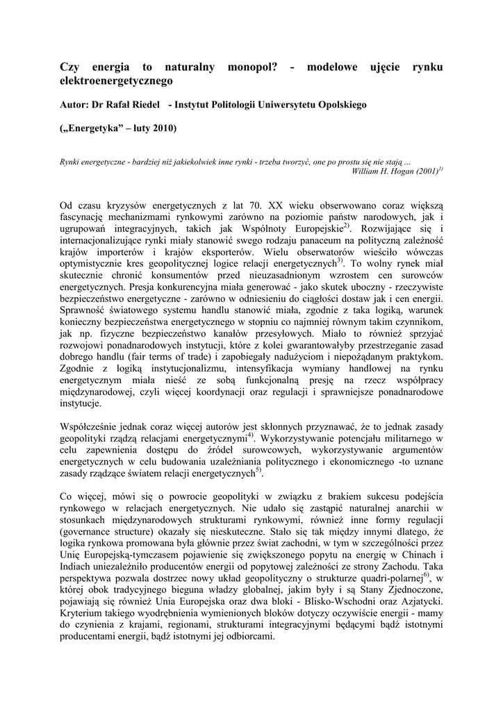 Czy energia to naturalny elektroenergetycznego monopol? - modelowe ujęcie rynku Autor: Dr Rafał Riedel - Instytut Politologii Uniwersytetu Opolskiego („Energetyka” – luty 2010) Rynki energetyczne - bardziej niż jakiekolwiek inne rynki - trzeba tworzyć, one po prostu się nie stają ... William H. Hogan (2001)1) Od czasu kryzysów energetycznych z lat 70. XX wieku obserwowano coraz większą fascynację mechanizmami rynkowymi zarówno na poziomie państw narodowych, jak i ugrupowań integracyjnych, takich jak Wspólnoty Europejskie2). Rozwijające się i internacjonalizujące rynki miały stanowić swego rodzaju panaceum na polityczną zależność krajów importerów i krajów eksporterów. Wielu obserwatorów wieściło wówczas optymistycznie kres geopolitycznej logice relacji energetycznych3). To wolny rynek miał skutecznie chronić konsumentów przed nieuzasadnionym wzrostem cen surowców energetycznych. Presja konkurencyjna miała generować - jako skutek uboczny - rzeczywiste bezpieczeństwo energetyczne - zarówno w odniesieniu do ciągłości dostaw jak i cen energii. Sprawność światowego systemu handlu stanowić miała, zgodnie z taka logiką, warunek konieczny bezpieczeństwa energetycznego w stopniu co najmniej równym takim czynnikom, jak np. fizyczne bezpieczeństwo kanałów przesyłowych. Miało to również sprzyjać rozwojowi ponadnarodowych instytucji, które z kolei gwarantowałyby przestrzeganie zasad dobrego handlu (fair terms of trade) i zapobiegały nadużyciom i niepożądanym praktykom. Zgodnie z logiką instytucjonalizmu, intensyfikacja wymiany handlowej na rynku energetycznym miała nieść ze sobą funkcjonalną presję na rzecz współpracy międzynarodowej, czyli więcej koordynacji oraz regulacji i sprawniejsze ponadnarodowe instytucje. Współcześnie jednak coraz więcej autorów jest skłonnych przyznawać, że to jednak zasady geopolityki rządzą relacjami energetycznymi4). Wykorzystywanie potencjału militarnego w celu zapewnienia dostępu do źródeł surowcowych, wykorzystywanie argumentów energetycznych w celu budowania uzależniania politycznego i ekonomicznego -to uznane zasady rządzące światem relacji energetycznych5). Co więcej, mówi się o powrocie geopolityki w związku z brakiem sukcesu podejścia rynkowego w relacjach energetycznych. Nie udało się zastąpić naturalnej anarchii w stosunkach międzynarodowych strukturami rynkowymi, również inne formy regulacji (governance structure) okazały się nieskuteczne. Stało się tak między innymi dlatego, że logika rynkowa promowana była głównie przez świat zachodni, w tym w szczególności przez Unię Europejską-tymczasem pojawienie się zwiększonego popytu na energię w Chinach i Indiach uniezależniło producentów energii od popytowej zależności ze strony Zachodu. Taka perspektywa pozwala dostrzec nowy układ geopolityczny o strukturze quadri-polarnej6), w której obok tradycyjnego bieguna władzy globalnej, jakim były i są Stany Zjednoczone, pojawiają się również Unia Europejska oraz dwa bloki - Blisko-Wschodni oraz Azjatycki. Kryterium takiego wyodrębnienia wymienionych bloków dotyczy oczywiście energii - mamy do czynienia z krajami, regionami, strukturami integracyjnymi będącymi bądź istotnymi producentami energii, bądź istotnymi jej odbiorcami. Za odchodzeniem od logiki rynkowej przemawiają również argumenty natury ekonomicznej biorąc pod uwagę lokalizację zidentyfikowanych zasobów ropy naftowej i gazu oraz dynamikę ich eksploatacji, po 2010 roku będziemy obserwować stopniową koncentrację tych zasobów w rękach względnie małej (i malejącej) liczby podmiotów - Rosja, Katar, Turkmenistan i Iran dysponowały będą ponad potową zasobów - co nie sprzyja budowaniu rynku, a raczej struktury oligopolicznej czy może nawet monopolistycznej. Wreszcie należy zauważyć, że tak silnie promowane przez europejskie instytucje wspólnotowe podejście rynkowe znajduje również oponentów po stronie wydawałoby się najbardziej naturalnego sojusznika - Ameryki. Analiza strategiczna przygotowana przez Jamesa Bakera7), przygotowana na początku milenium w celu zidentyfikowania najważniejszych wyzwań stojących przed amerykańską polityką energetyczną nie pozostawia złudzeń, że tak strategiczne kwestie jak polityka energetyczna, a w szczególności ta jej część, która dotyczy bezpieczeństwa energetycznego, nie powinny być pozostawione prywatnym firmom, których zachowanie podporządkowane jest maksymalizacji zysku, co nie zawsze idzie w parze z długookresowymi celami strategicznymi państwa8). Oczywiście uproszczonym schematem analizy byłoby postrzeganie rzeczywistości energetycznej tylko i wyłącznie przez pryzmat bądź logiki rynkowej, bądź (geo)politycznej. W przypadku relacji energetycznych te dwa wymiary rzeczywistości przenikają się w naturalny sposób. Natomiast przenikanie się tych dwóch wymiarów przynosi czasami niespodziewane efekty i perturbacje. Polityka zazwyczaj krótkowzroczna, mierzona w krótkim horyzoncie czasowym nie współgra z naturą rynku ropy, na którym kosztochłonność inwestycji i ich długofalowy charakter generują daleko idącą niekompatybilność. Konsekwencje, jakie niesie ze sobą taka sytuacja mogą być zilustrowane przykładem następującego mechanizmu: w okresach wysokiej ceny ropy wszelkie kalkulacje opłacalności inwestycji wydają się być optymistyczne i dlatego częściej kończą się decyzjami inwestycyjnymi. W czasach (relatywnie) niższej ceny ropy, wnioski są dokładnie odwrotne. Jednocześnie zwrot z inwestycji transponowany jest pomiędzy okresami wysokiej i niskiej ceny ropy. Powoduje to sytuację, w której dynamiczny wzrost cen w latach 2002-2003 oraz 2007-2008 motywowany był niedoinwestowaniem w latach dziewięćdziesiątych XX wieku (oraz pochodnej mu niskiej podaży), kiedy to cena baryłki ropy była względnie niska (naturalnie w konsekwencji „pr