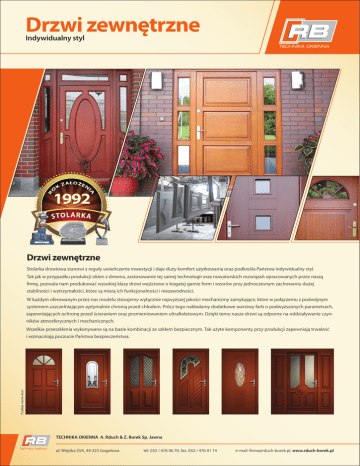 Drzwi zewnętrzne Indywidualny styl 1992 Drzwi zewnętrzne Stolarka drzwiowa stanowi z reguły uwieńczenie inwestycji i daje duży komfort użytkowania oraz podkreśla Państwa indywidualny styl. Tak jak w przypadku produkcji okien z drewna, zastosowanie tej samej technologii oraz nowatorskich rozwiązań opracowanych przez naszą firmę, pozwala nam produkować wysokiej klasy drzwi wejściowe o bogatej gamie form i wzorów przy jednoczesnym zachowaniu dużej stabilności i wytrzymałości, które są miarą ich funkcjonalności i niezawodności. W każdym oferowanym przez nas modelu stosujemy wyłącznie najwyższej jakości mechanizmy zamykające, które w połączeniu z podwójnym systemem uszczelniającym optymalnie chronią przed chłodem. Prócz tego nakładamy dodatkowe warstwy farb o podwyższonych parametrach, zapewniających ochronę przed ścieraniem oraz promieniowaniem ultrafioletowym. Dzięki temu nasze drzwi są odporne na oddziaływanie czynników atmosferycznych i mechanicznych. Wszelkie przeszklenia wykonywane są na bazie kombinacji ze szkłem bezpiecznym. Tak użyte komponenty przy produkcji zapewniają trwałość Przykłady wzorów drzwi i wzmacniają poczucie Państwa bezpieczeństwa. TECHNIKA OKIENNA A. Rduch & Z. Borek Sp. Jawna ul. Wiejska 55A, 44-323 Gogołowa tel. 032 / 476 06 70, fax. 032 / 476 01 14 e-mail: [email protected], www.rduch-borek.pl