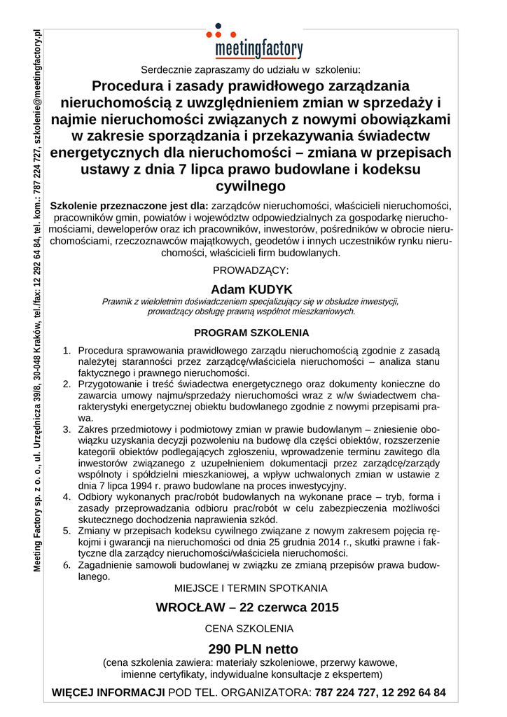 Meeting Factory sp. z o. o., ul. Urzędnicza 39/8, 30-048 Kraków, tel./fax: 12 292 64 84, tel. kom.: 787 224 727, [email protected] Serdecznie zapraszamy do udziału w szkoleniu: Procedura i zasady prawidłowego zarządzania nieruchomością z uwzględnieniem zmian w sprzedaży i najmie nieruchomości związanych z nowymi obowiązkami w zakresie sporządzania i przekazywania świadectw energetycznych dla nieruchomości – zmiana w przepisach ustawy z dnia 7 lipca prawo budowlane i kodeksu cywilnego Szkolenie przeznaczone jest dla: zarządców nieruchomości, właścicieli nieruchomości, pracowników gmin, powiatów i województw odpowiedzialnych za gospodarkę nieruchomościami, deweloperów oraz ich pracowników, inwestorów, pośredników w obrocie nieruchomościami, rzeczoznawców majątkowych, geodetów i innych uczestników rynku nieruchomości, właścicieli firm budowlanych. PROWADZĄCY: Adam KUDYK Prawnik z wieloletnim doświadczeniem specjalizujący się w obsłudze inwestycji, prowadzący obsługę prawną wspólnot mieszkaniowych. PROGRAM SZKOLENIA 1. Procedura sprawowania prawidłowego zarządu nieruchomością zgodnie z zasadą należytej staranności przez zarządcę/właściciela nieruchomości – analiza stanu faktycznego i prawnego nieruchomości. 2. Przygotowanie i treść świadectwa energetycznego oraz dokumenty konieczne do zawarcia umowy najmu/sprzedaży nieruchomości wraz z w/w świadectwem charakterystyki energetycznej obiektu budowlanego zgodnie z nowymi przepisami prawa. 3. Zakres przedmiotowy i podmiotowy zmian w prawie budowlanym – zniesienie obowiązku uzyskania decyzji pozwoleniu na budowę dla części obiektów, rozszerzenie kategorii obiektów podlegających zgłoszeniu, wprowadzenie terminu zawitego dla inwestorów związanego z uzupełnieniem dokumentacji przez zarządcę/zarządy wspólnoty i spółdzielni mieszkaniowej, a wpływ uchwalonych zmian w ustawie z dnia 7 lipca 1994 r. prawo budowlane na proces inwestycyjny. 4. Odbiory wykonanych prac/robót budowlanych na wykonane prace – tryb, forma i zasady przeprowadzania odbioru prac/robót w celu zabezpieczenia możliwości skutecznego dochodzenia naprawienia szkód. 5. Zmiany w przepisach kodeksu cywilnego związane z nowym zakresem pojęcia rękojmi i gwarancji na nieruchomości od dnia 25 grudnia 2014 r., skutki prawne i faktyczne dla zarządcy nieruchomości/właściciela nieruchomości. 6. Zagadnienie samowoli budowlanej w związku ze zmianą przepisów prawa budowlanego. MIEJSCE I TERMIN SPOTKANIA WROCŁAW – 22 czerwca 2015 CENA SZKOLENIA 290 PLN netto (cena szkolenia zawiera: materiały szkoleniowe, przerwy kawowe, imienne certyfikaty, indywidualne konsultacje z ekspertem) WIĘCEJ INFORMACJI POD TEL. ORGANIZATORA: 787 224 727, 12 292 64 84 Meeting Factory sp. z o. o., ul. Urzędnicza 39/8, 30-048 Kraków, tel./fax: 12 292 64 84, tel. kom.: 787 224 727, www.meetingfactory.pl Procedura i zasady prawidłowego zarządzania nieruchomością - Wrocław 22.06, godz. 10.00 Nazwa firmy (dane jak do faktury):.................................................................................................................. Adres:................................................................................................................................................................. NIP:.....................................................................tel.:........................................................................................... fax.:.....................................................................e-mail:..................................................................................... Lp. Imię i nazwisko STANOWISKO Tel. kontaktowy 1. 2 MIEJSCE I TERMIN WROCŁAW – 22 czerwca 2015 EUROPROFES, Rynek 35 kwota: □ 356,70 zł brutto (290 zł netto)* za osobę x liczba osób .......... = ................. zł (cena zawiera: szkolenie, materiały szkoleniowe, imienne certyfikaty, przerwy kawowe, indywidualne konsultacje z ekspertem) suma: ................. PLN; słownie ............................................................................ należność: IDEA BANK S.A. 68 1950 0001 2006 2224 4912 0003 (osoba zgłaszająca należność zobowiązuje się przekazać na konto Meeting Factory sp. z o. o.:) w tytule przelewu proszę wpisać: WR2206 * UWAGA: przy finansowaniu szkolenia w całości ze środków publicznych jest ono opodatkowane zwolnioną stawką VAT (art. 43 ust. 1 pkt 29c ustawy o VAT) WARUNKI UCZESTNICTWA: ■ przesłanie faksem lub e-mailem wypełnionej karty zgłoszenia ■ przesłanie zgłoszenia udziału w szkoleniu stanowi zgodę na wystawienie faktury VAT i zobowiązanie się do uiszczenia opłaty za szkolenie ■ wpłata na konto Meeting Factory sp. z o. o. należności za uczestnictwo przed szkoleniem ■ brak wpłaty nie jest jednoznaczny z rezygnacją z udziału ■ rezygnacja możliwa jest najpóźniej na 7 dni przed seminarium wyłącznie w formie pisemnej ■ Szkolenie może nie dojść do skutku w ww. terminie, jeśli nie zgłosi się odpowiednia ilość uczestników ■ Zapoznaliśmy się i akceptujemy warunki płatności oraz uczestnictwa w szkoleniu organizowanym przez Meeting Factory sp. z o. o. ■ wyrażamy zgodę na przetwarzanie danych osobowych do celów organizacyjnych i marketingowych przez firmę Meeting Factory sp. z o. o. ........................................... (pieczątka firmowa osoby zgłaszającej) ........................................... (data i czytelny podpis) OŚWIADCZENIE: Oświadczam, że środki na szkolenie pochodzą w co najmniej 70% ze środków publicznych w rozumieniu ustawy o finansach publicznych co stanowi podstawę do opodatkowania zwolnioną stawką VAT (art. 43 ust. 1 pkt 29c ustawy o VAT oraz § 13 ust. 1 pkt 20 rozporządzenia Ministra Finansów z 4 kwietnia 2011 r. w sprawie VAT) ........................................... (pieczątka i podpis osoby zgłaszającej) S WIĘCEJ INFORMACJI POD N