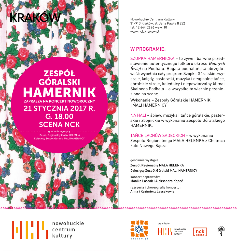 Nowohuckie Centrum Kultury 31-913 Kraków, al. Jana Pawła II 232 tel. 12 644 02 66 wew. 10 www.nck.krakow.pl W PROGRAMIE: ZESPÓŁ GÓRALSKI HAMERNIK ZAPRASZA NA KONCERT NOWOROCZNY 21 STYCZNIA 2017 R. G. 18.00 SCENA NCK gościnnie wystąpią: Zespół Regionalny MAŁA HELENKA Dziecięcy Zespół Góralski MALI HAMERNICY SZOPKA HAMERNICKA – to żywe i barwne przedstawienie autentycznego folkloru okresu Godnych Świąt na Podhalu. Bogata podhalańska obrzędowość wypełnia cały program Szopki. Góralskie zwyczaje, kolędy, pastorałki, muzyka i oryginalne tańce, góralskie stroje, kolędnicy i niepowtarzalny klimat Skalnego Podhala – a wszystko to wiernie przeniesione na scenę. Wykonanie – Zespoły Góralskie HAMERNIK i MALI HAMERNICY NA HALI – śpiew, muzyka i tańce góralskie, pasterskie i zbójnickie w wykonaniu Zespołu Góralskiego HAMERNIK. TAŃCE LACHÓW SĄDECKICH – w wykonaniu Zespołu Regionalnego MAŁA HELENKA z Chełmca koło Nowego Sącza. gościnnie wystąpią: Zespół Regionalny MAŁA HELENKA Dziecięcy Zespół Góralski MALI HAMERNICY koncert poprowadzą: Monika Lassak i Aleksandra Kopeć reżyseria i choreografia koncertu: Anna i Kazimierz Lassakowie NCK SCENA PROJEKT LOGO organizator: 01