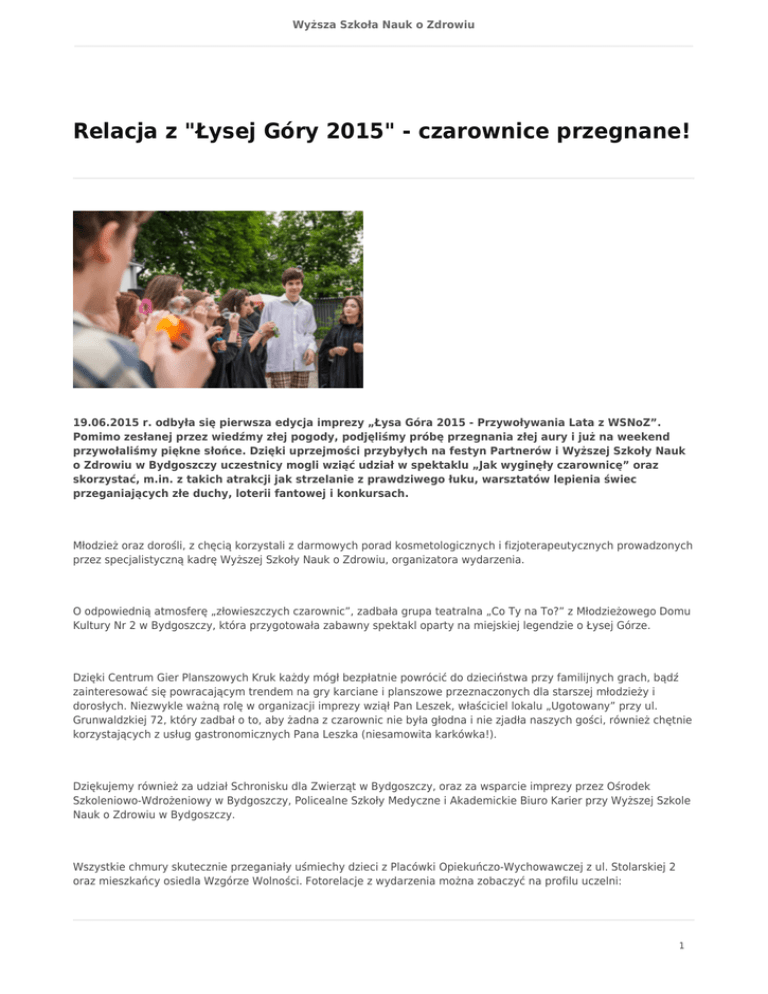 Wyższa Szkoła Nauk o Zdrowiu Relacja z "Łysej Góry 2015" - czarownice przegnane! 19.06.2015 r. odbyła się pierwsza edycja imprezy „Łysa Góra 2015 - Przywoływania Lata z WSNoZ”. Pomimo zesłanej przez wiedźmy złej pogody, podjęliśmy próbę przegnania złej aury i już na weekend przywołaliśmy piękne słońce. Dzięki uprzejmości przybyłych na festyn Partnerów i Wyższej Szkoły Nauk o Zdrowiu w Bydgoszczy uczestnicy mogli wziąć udział w spektaklu „Jak wyginęły czarownicę” oraz skorzystać, m.in. z takich atrakcji jak strzelanie z prawdziwego łuku, warsztatów lepienia świec przeganiających złe duchy, loterii fantowej i konkursach. Młodzież oraz dorośli, z chęcią korzystali z darmowych porad kosmetologicznych i fizjoterapeutycznych prowadzonych przez specjalistyczną kadrę Wyższej Szkoły Nauk o Zdrowiu, organizatora wydarzenia. O odpowiednią atmosferę „złowieszczych czarownic”, zadbała grupa teatralna „Co Ty na To?” z Młodzieżowego Domu Kultury Nr 2 w Bydgoszczy, która przygotowała zabawny spektakl oparty na miejskiej legendzie o Łysej Górze. Dzięki Centrum Gier Planszowych Kruk każdy mógł bezpłatnie powrócić do dzieciństwa przy familijnych grach, bądź zainteresować się powracającym trendem na gry karciane i planszowe przeznaczonych dla starszej młodzieży i dorosłych. Niezwykle ważną rolę w organizacji imprezy wziął Pan Leszek, właściciel lokalu „Ugotowany” przy ul. Grunwaldzkiej 72, który zadbał o to, aby żadna z czarownic nie była głodna i nie zjadła naszych gości, również chętnie korzystających z usług gastronomicznych Pana Leszka (niesamowita karkówka!). Dziękujemy również za udział Schronisku dla Zwierząt w Bydgoszczy, oraz za wsparcie imprezy przez Ośrodek Szkoleniowo-Wdrożeniowy w Bydgoszczy, Policealne Szkoły Medyczne i Akademickie Biuro Karier przy Wyższej Szkole Nauk o Zdrowiu w Bydgoszczy. Wszystkie chmury skutecznie przeganiały uśmiechy dzieci z Placówki Opiekuńczo-Wychowawczej z ul. Stolarskiej 2 oraz mieszkańcy osiedla Wzgórze Wolności. Fotorelacje z wydarzenia można zobaczyć na profilu uczelni: 1 Wyższa Szkoła Nauk o Zdrowiu www.facebook.com/wsnoz. Sukces I. edycji festynu „Łysa Góra 2015 – przywoływanie lata z WSNoZ”, pozwolił już dziś ogłosić, że widzimy się za rok! A w 2016 roku, czeka na Was jeszcze więcej czartów, wiedźm, uśmiechów i wspólnej zabawy! Aby być na bieżąco z „Łysą Górą” i innymi ciekawymi wydarzeniami, zapraszamy na nasz fanpage na Facebooku. Bądźcie czujni! Czarownice jeszcze nie powiedziały ostatniego słowa! 2