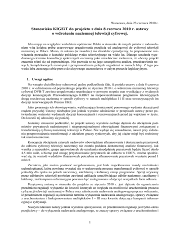 Warszawa, dnia 23 czerwca 2010 r. Stanowisko KIGEiT do projektu z dnia 8 czerwca 2010 r. ustawy o wdroŜeniu naziemnej telewizji cyfrowej. Izba mając na względzie wieloletnie opóźnienie Polski w stosunku do innych państw z zadowoleniem wita kolejną próbę ustawowego uregulowania przejścia od analogowej do cyfrowej telewizji naziemnej w Polsce. Mimo, Ŝe ustawa (w zasadzie) ma charakter epizodyczny, to proponowane rozwiązania przesądzą o kształcie polskiego rynku telewizyjnego na wiele lat. Dlatego ustalenie tygodniowego terminu konsultacji społecznych oceniamy jako niewłaściwe zwłaszcza, Ŝe obecny projekt znacznie róŜni się od poprzedniego. Nie pozwala to na jego szczegółową analizę, przedstawienie nowych, kompleksowych rozwiązań i przeprowadzenia pełnych uzgodnień w ramach Izby. Z tego powodu Izba zastrzega sobie prawo do aktywnego uczestnictwa w całym procesie legislacyjnym. 1. Uwagi ogólne Na wstępie chcielibyśmy odnotować godny podkreślenia fakt, iŜ projekt ustawy z dnia 8 czerwca 2010 r. w odróŜnieniu od poprzedniego projektu ze stycznia 2010 r. o wdroŜeniu naziemnej telewizji cyfrowej DVB-T zawiera uregulowania respektujące w pewnym stopniu stan wynikający z wydanych decyzji koncesyjnych Przewodniczącego KRRiT na rozpowszechnianie programów telewizyjnych drogą rozsiewczą naziemną w sposób cyfrowy w ramach multipleksu I i II oraz towarzyszących im decyzji rezerwacyjnych Prezesa UKE. Jako gwarancja ich obowiązywania, wykluczająca konieczność ponownego wydania decyzji pod rządem przyszłej Ustawy niezbędne jest jednak wyraźne odniesienie w przepisach ustawy przez potwierdzenie waŜności wydanych decyzji koncesyjnych i rezerwacyjnych przed jej wejściem w Ŝycie. Do kwestii tej odnosimy się poniŜej. Jesteśmy zmuszeni podkreślić, Ŝe projekt ustawy wyraźnie cechuje dąŜenie do obciąŜenia podmiotów prywatnych nadmiernymi i nieproporcjonalnymi obowiązkami finansowymi związanymi z transformacją cyfrową naziemnej telewizji w Polsce. Nie wydaje się uzasadnione, nawet przy załoŜeniu przeprowadzenia transformacji z udziałem graczy rynkowych, aby jej cięŜar mógł być rozłoŜony tak nierównomiernie. Koncepcja obciąŜenia czterech nadawców obowiązkiem sfinansowania i dostarczenia przystawek do odbioru cyfrowej telewizji naziemnej nie została poddana dostatecznej analizie finansowej. Jak wynika z szacunków, grupa uprawnionych do uzyskania nieodpłatnie przystawek będzie liczyć około 4,5 mln osób, a biorąc pod uwagę przystosowanie przystawek do odbioru w HDTV, moŜna spodziewać się, Ŝe wartość wydatków finansowych potrzebna na sfinansowanie przystawek wyniesie ponad 1 mld zł. Zarzutem, jaki moŜna postawić uregulowaniom, jest brak respektowania zasady neutralności technologicznej, która powinna wyraŜać się w traktowaniu procesu transformacji cyfrowej w sposób jednolity dla rynku na polach naziemnej, satelitarnej i kablowej emisji programów. Sprzęt uŜywany przez odbiorców telewizji powinien zawierać aplikacje umoŜliwiające odbiór naziemny, satelitarny i kablowy, zaś kampania informacyjna powinna być zintegrowana i dotyczyć wszystkich form odbioru. Pozytywną zmianą w stosunku do projektu ze stycznia 2010 r. jest dąŜenie do ograniczenia przedmiotu regulacji wyłącznie do kwestii istotnych ze względu na moŜliwość uruchomienia procesu cyfryzacji telewizji naziemnej w Polsce oraz zakończenia nadawania analogowego poprzez wskazanie, iŜ przedmiotem regulacji są określenie terminu wyłączenia nadawania analogowego, sprawy związane z uruchomieniem i funkcjonowaniem multipleksów I – III oraz kwestie dotyczące kampanii informacyjnej o cyfryzacji. Naszym zdaniem naleŜy jednak wyraźnie sprecyzować, Ŝe przedmiotem regulacji jest tylko okres przejściowy – do wyłączenia nadawania analogowego, to znaczy sprawy związane z uruchomieniem i 1 funkcjonowaniem multipleksów (I – III) w tym okresie. Chodzi bowiem o to, Ŝeby nie było wątpliwości, takich jakie rodzą się przy obecnej lekturze projektu, na przykład w odniesieniu do szczególnych obowiązków operatora multipleksu II (art. 9 ust. 1 pkt 2 lit. b) projektu ustawy) czy będą one nieograniczone czasowo i będą obowiązkami operatora multipleksu II równieŜ po zakończeniu okresu przejściowego. Ustawowy obowiązek zapewnienia uŜytkownikom nieodpłatnego dostępu do programów – Polsat, TVN, TV4 i Puls równieŜ po okresie przejściowym wydaje się być zbyt daleko idącym, przede wszystkim dlatego, iŜ nie moŜna przewidzieć zmian, które mogą zaistnieć w dalszej przyszłości – np. zmian na rynku, czy zmian nazw programu, co moŜe doprowadzić do sytuacji, w której ten obowiązek ustawowy nie będzie mógł być realizowany z przyczyn niezaleŜnych od operatora multipleksu II, a przy tym operator ten będzie naraŜony na sankcję w postaci kary pienięŜnej, o której mowa w art. 17 i 18 projektu ustawy. Izba postuluje zatem, aby po wyłączeniu nadawania analogowego ustawowe obowiązki operatorów wszystkich multipleksów wynikały tylko z nowowprowadzanych przepisów – zmian w Prawie telekomunikacyjnych (nowy Dział IVb). Ewentualne obowiązki dotyczące umieszczania określonych programów w odniesieniu do wszystkich multipleksów byłyby więc obowiązkami wynikającymi z odpowiednich decyzji organów regulacyjnych. Ustawa powinna teŜ wskazać co to są multipleksy I – III. Zdefiniowanie multipleksów I – III mogłoby nastąpić przez określenie celów jakim słuŜą te multipleksy – np. multipleks I – multipleks odtworzeniowy obecnej oferty publicznej plus cztery nowe programy, multipleks II – multipleks do zagospodarowania przez ofertę dzisiejszych nadawców prywatnych, multipleks III – docelowy multipleks publiczny. Niezrozumiałe i niepotrzebne wydaje się zamieszczenie w art. 6 ust. 1 listy kanałów, bo bez wskazania obszarów, na których mogą być wykorzystywane lista taka