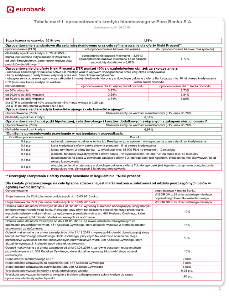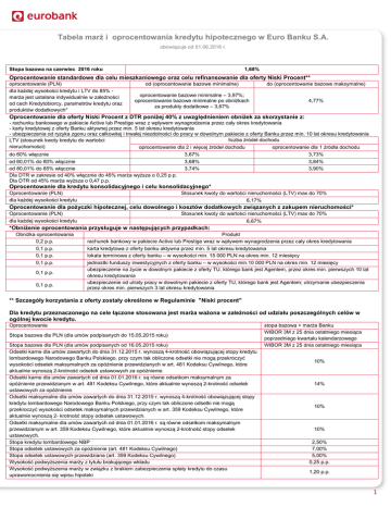 Tabela marż i oprocentowania kredytu hipotecznego w Euro Banku S.A. obowiązuje od 01.06.2016 r. Stopa bazowa na czerwiec 2016 roku 1,68% Oprocentowanie standardowe dla celu mieszkaniowego oraz celu refinansowanie dla oferty Niski Procent** oprocentowanie (PLN) dla każdej wysokości kredytu i LTV do 85% marża jest ustalana indywidualnie w zależności od cech Kredytobiorcy, parametrów kredytu oraz produktów dodatkowych* od (oprocentowanie bazowe minimalne) do (oprocentowanie bazowe maksymalne) oprocentowanie bazowe minimalne – 3,97%; oprocentowanie bazowe minimalne po obniżkach za produkty dodatkowe – 3,67% 4,77% Oprocentowanie dla oferty Niski Procent z DTR poniżej 40% z uwzględnieniem obniżek za skorzystanie z: - rachunku bankowego w pakiecie Active lub Prestige wraz z wpływem wynagrodzenia przez cały okres kredytowania - karty kredytowej z oferty Banku aktywnej przez min. 5 lat okresu kredytowania - ubezpieczenia od ryzyka zgonu oraz całkowitej i trwałej niezdolności do pracy w dowolnym pakiecie z oferty Banku przez min. 10 lat okresu kredytowania liczba źródeł dochodu LTV (stosunek kwoty kredytu do wartości nieruchomości) oprocentowanie dla 2 i więcej źródeł dochodu oprocentowanie dla 1 źródła dochodu do 60% włącznie od 60,01% do 80% włącznie od 80,01% do 85% włącznie Dla DTR w zakresie od 40% włącznie do 45% marża wyższa o 0,25 p.p. Dla DTR od 45% marża wyższa o 0,47 p.p. 3,67% 3,68% 3,74% 3,73% 3,84% 3,90% Oprocentowanie dla kredytu konsolidacyjnego i celu konsolidacyjnego* Oprocentowanie (PLN) dla każdej wysokości kredytu Stosunek kwoty do wartości nieruchomości (LTV) max do 70% 6,17% Oprocentowanie dla pożyczki hipotecznej, celu dowolnego i kosztów dodatkowych związanych z zakupem nieruchomości* Oprocentowanie (PLN) dla każdej wysokości kredytu Stosunek kwoty do wartości nieruchomości (LTV) max do 70% 6,67% *Obniżenie oprocentowania przysługuje w następujących przypadkach: Obniżka oprocentowania 0,2 p.p. 0,1 p.p. 0,1 p.p. 0,1 p.p. 0,1 p.p. 0,1 p.p. Produkt rachunek bankowy w pakiecie Active lub Prestige wraz w wpływem wynagrodzenia przez cały okres kredytowania karta kredytowa z oferty banku aktywna przez min. 5 lat okresu kredytowania lokata terminowa z oferty banku – w wysokości min. 15 000 PLN na okres min. 12 miesięcy jednostki funduszy inwestycyjnych z oferty banku – w wysokości min.10 000 PLN na okres min. 12 miesięcy ubezpieczenie na życie w dowolnym pakiecie z oferty TU, którego bank jest Agentem, przez okres min. pierwszych 10 lat okresu kredytowania ubezpieczenie od utraty pracy w dowolnym pakiecie z oferty TU, którego bank jest Agentem; utrzymanie ubezpieczenia przez okres min. pierwszych 3 lat okresu kredytowania ** Szczegóły korzystania z oferty zostały określone w Regulaminie "Niski procent" Dla kredytu przeznaczonego na cele łączone stosowana jest marża ważona w zależności od udziału poszczególnych celów w ogólnej kwocie kredytu. Oprocentowanie Stopa bazowa dla PLN (dla umów podpisanych do 15.05.2015 roku) Stopa bazowa dla PLN (dla umów podpisanych od 16.05.2015 roku) Odsetki karne dla umów zawartych do dnia 31.12.2015 r. wynoszą 4-krotność obowiązującej stopy kredytu lombardowego Narodowego Banku Polskiego, przy czym tak obliczone odsetki nie mogą przekroczyć wysokości odsetek maksymalnych za opóźnienie przewidzianych w art. 481 Kodeksu Cywilnego, które aktualnie wynoszą 2-krotność odsetek ustawowych za opóźnienie. Odsetki karne dla umów zawartych od dnia 01.01.2016 r. są równe odsetkom maksymalnym za opóźnienie przewidzianym w art. 481 Kodeksu Cywilnego, które aktualnie wynoszą 2-krotność odsetek ustawowych za opóźnienie. Odsetki maksymalne dla umów zawartych do dnia 31.12.2015 r. wynoszą 4-krotność obowiązującej stopy kredytu lombardowego Narodowego Banku Polskiego, przy czym tak obliczone odsetki nie mogą przekroczyć wysokości odsetek maksymalnych przewidzianych w art. 359 Kodeksu Cywilnego, które aktualnie wynoszą 2- krotność stopy odsetek ustawowych. Odsetki maksymalne dla umów zawartych od dnia 01.01.2016 r. są równe odsetkom maksymalnym przewidzianym w art. 359 Kodeksu Cywilnego, które aktualnie wynoszą 2-krotność stopy odsetek ustawowych. Stopa kredytu lombardowego NBP Stopa odsetek ustawowych za opóźnienie (art. 481 Kodeksu Cywilnego) Stopa odsetek ustawowych przewidziana (art. 359 Kodeksu Cywilnego) Wysokość podwyższenia marży z tytułu brakującego wkładu Wysokość podwyższenia marży w związku z brakiem zabezpieczenia spłaty kredytu do czasu uprawomocnienia się wpisu hipoteki stopa bazowa + marża Banku WIBOR 3M z 25 dnia ostatniego miesiąca poprzedniego kwartału kalendarzowego WIBOR 3M z 25 dnia ostatniego miesiąca 10% 14% 10% 10% 2,50% 7,00% 5,00% 0,25 p.p. 1,20 p.p. 1