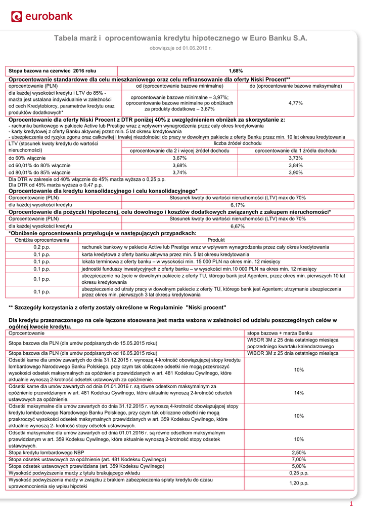 tabela oprocentowania kredytu hipotecznego w Euro Banku S.A.