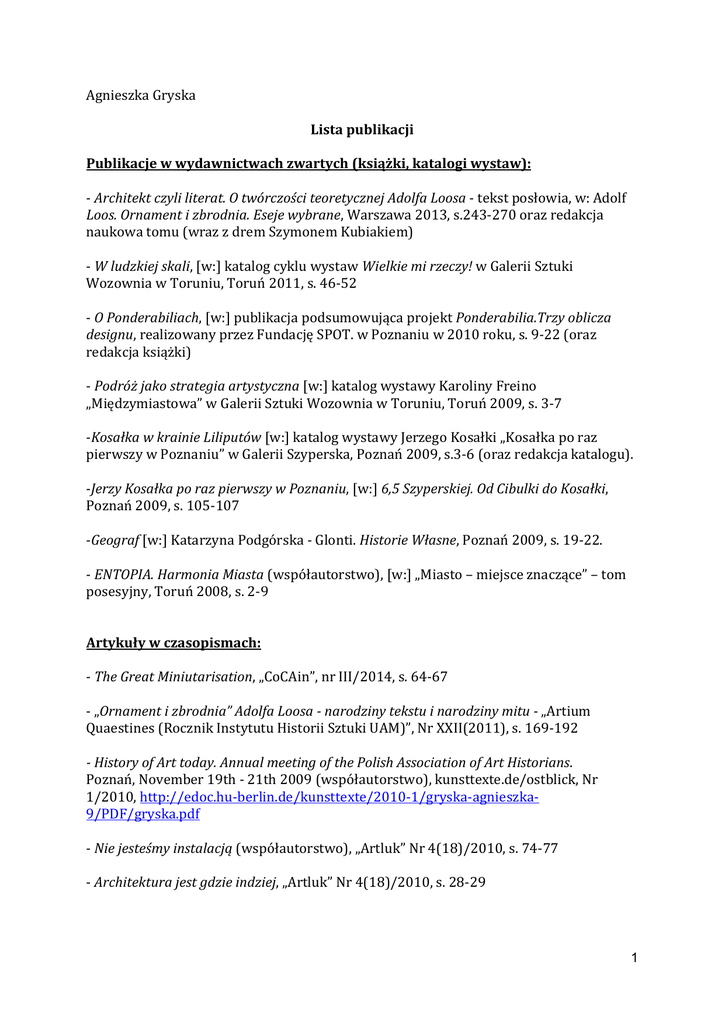 Agnieszka Gryska Lista publikacji Publikacje w wydawnictwach zwartych (książki, katalogi wystaw): - Architekt czyli literat. O twórczości teoretycznej Adolfa Loosa - tekst posłowia, w: Adolf Loos. Ornament i zbrodnia. Eseje wybrane, Warszawa 2013, s.243-270 oraz redakcja naukowa tomu (wraz z drem Szymonem Kubiakiem) - W ludzkiej skali, [w:] katalog cyklu wystaw Wielkie mi rzeczy! w Galerii Sztuki Wozownia w Toruniu, Toruń 2011, s. 46-52 - O Ponderabiliach, [w:] publikacja podsumowująca projekt Ponderabilia.Trzy oblicza designu, realizowany przez Fundację SPOT. w Poznaniu w 2010 roku, s. 9-22 (oraz redakcja książki) - Podróż jako strategia artystyczna [w:] katalog wystawy Karoliny Freino „Międzymiastowa” w Galerii Sztuki Wozownia w Toruniu, Toruń 2009, s. 3-7 -Kosałka w krainie Liliputów [w:] katalog wystawy Jerzego Kosałki „Kosałka po raz pierwszy w Poznaniu” w Galerii Szyperska, Poznań 2009, s.3-6 (oraz redakcja katalogu). -Jerzy Kosałka po raz pierwszy w Poznaniu, [w:] 6,5 Szyperskiej. Od Cibulki do Kosałki, Poznań 2009, s. 105-107 -Geograf [w:] Katarzyna Podgórska - Glonti. Historie Własne, Poznań 2009, s. 19-22. - ENTOPIA. Harmonia Miasta (współautorstwo), [w:] „Miasto – miejsce znaczące” – tom posesyjny, Toruń 2008, s. 2-9 Artykuły w czasopismach: - The Great Miniutarisation, „CoCAin”, nr III/2014, s. 64-67 - „Ornament i zbrodnia” Adolfa Loosa - narodziny tekstu i narodziny mitu - „Artium Quaestines (Rocznik Instytutu Historii Sztuki UAM)”, Nr XXII(2011), s. 169-192 - History of Art today. Annual meeting of the Polish Association of Art Historians. Poznań, November 19th - 21th 2009 (współautorstwo), kunsttexte.de/ostblick, Nr 1/2010, http://edoc.hu-berlin.de/kunsttexte/2010-1/gryska-agnieszka9/PDF/gryska.pdf - Nie jesteśmy instalacją (współautorstwo), „Artluk” Nr 4(18)/2010, s. 74-77 - Architektura jest gdzie indziej, „Artluk” Nr 4(18)/2010, s. 28-29 1 - Komentarz do artykułu „Hiperrealizm” P. Krakowskiego (współautorstwo), „Artluk”, Nr 2(16)/2010, s.93-102 - Komentarz do artykułu „Postawy współczesnej krytyki” U. Czartoryskiej (współautorstwo), „Artluk”, Nr 1(15)/2010, s.88-94 - Komentarz do artykułu „Konceptualizm” J. Świdzińskiego (współautorstwo), „Artluk”, Nr. 4 (14)/2009, s. 94-98 - Zabawy z pamięcią, „Artluk” nr 2(12)/2009, s.46-49 - Komentarz do artykułu „XXXV Biennale w Wenecji” A. Wojciechowskiego (współautorstwo), „Artluk”, Nr 3(13)/2009, s.95-99 - Komentarz do artykułu „Światło Geometrii” K. Jerzmanowskiej (współautorstwo), „Artluk”, Nr 2(12)/2009, s. 91-97 - Komentarz do artykułu „Pożegnanie ze sztuką. Obraz obecnej sytuacji” J.P. Hodina, (współautorstwo), „Artluk”, Nr. 1 (11)/2009, s. 94-98 - Komentarz do artykułu „Postawy ekologiczne w sztuce w świetle badań nad strukturą mitów” A. Kępińskiej (współautorstwo), „Artluk”, Nr. 4(10)/2008, s. 92-99 - Entopia. Harmonia Miasta, „Arterier. Zeszyty Artystyczne Zakładu Plastyki Intermedialnej Uniwersytetu Mikołaja Kopernika”, Nr 3/2008, s 44-45 - Wobec Czasu, „Artluk” Nr 2 (8)/2008, s. 28-29 - Ledigenheim. Mieszkanie dla nowoczesnego nomada, „Przegląd Zachodni [Quartalsschrift des Instituts für Weststudien in Poznań]”, Nr 2/2008. s.143-159 - Widz, który staje się materią. Wywiad z Maciejem Kurakiem (współautorstwo), „Artluk”, Nr. 1 (7)/2008, s. 68-73 2
