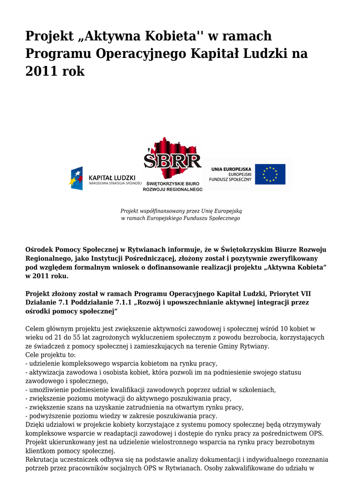 Projekt „Aktywna Kobieta'' w ramach Programu Operacyjnego Kapitał Ludzki na 2011 rok Projekt współfinansowany przez Unię Europejską w ramach Europejskiego Funduszu Społecznego Ośrodek Pomocy Społecznej w Rytwianach informuje, że w Świętokrzyskim Biurze Rozwoju Regionalnego, jako Instytucji Pośredniczącej, złożony został i pozytywnie zweryfikowany pod względem formalnym wniosek o dofinansowanie realizacji projektu „Aktywna Kobieta” w 2011 roku. Projekt złożony został w ramach Programu Operacyjnego Kapitał Ludzki, Priorytet VII Działanie 7.1 Poddziałanie 7.1.1 „Rozwój i upowszechnianie aktywnej integracji przez ośrodki pomocy społecznej” Celem głównym projektu jest zwiększenie aktywności zawodowej i społecznej wśród 10 kobiet w wieku od 21 do 55 lat zagrożonych wykluczeniem społecznym z powodu bezrobocia, korzystających ze świadczeń z pomocy społecznej i zamieszkujących na terenie Gminy Rytwiany. Cele projektu to: - udzielenie kompleksowego wsparcia kobietom na rynku pracy, - aktywizacja zawodowa i osobista kobiet, która pozwoli im na podniesienie swojego statusu zawodowego i społecznego, - umożliwienie podniesienie kwalifikacji zawodowych poprzez udział w szkoleniach, - zwiększenie poziomu motywacji do aktywnego poszukiwania pracy, - zwiększenie szans na uzyskanie zatrudnienia na otwartym rynku pracy, - podwyższenie poziomu wiedzy w zakresie poszukiwania pracy. Dzięki udziałowi w projekcie kobiety korzystające z systemu pomocy społecznej będą otrzymywały kompleksowe wsparcie w readaptacji zawodowej i dostępie do rynku pracy za pośrednictwem OPS. Projekt ukierunkowany jest na udzielenie wielostronnego wsparcia na rynku pracy bezrobotnym klientkom pomocy społecznej. Rekrutacja uczestniczek odbywa się na podstawie analizy dokumentacji i indywidualnego rozeznania potrzeb przez pracowników socjalnych OPS w Rytwianach. Osoby zakwalifikowane do udziału w projekcie spełnić muszą niezbędne wymagania, tj. są bezrobotne oraz korzystają ze świadczeń pomocy społecznej. Projekt realizowany jest w formie zintegrowanych działań w formie kontraktu socjalnego. W ramach kontraktu wszystkie beneficjentki ukończą trening umiejętności autoprezentacji i umiejętności psychospołecznych oraz nabędą umiejętności aktywnego poszukiwania pracy dzięki warsztatom aktywizujący. Zaplanowane jest, że spośród wszystkich uczestniczek 2 osoby ukończą kurs zawodowy dla handlowców z obsługą i kas fiskalnych, 2 osoby ukończą kurs zawodowy dla kucharza małej gastronomii, 1 kobieta ukończy kurs zawodowy z zakresu księgowości małych i średnich przedsiębiorstw, 5 kobiet ukończy kurs prawa jazdy kategorii „B”. Uczestniczki uzyskają zaświadczenia o przebytych szkoleniach i nabyciu w/w umiejętności. Za realizację projektu odpowiadać będzie Kierownik OPS, który koordynuje działania w ramach projektu, prowadzi sprawy organizacyjno-merytoryczne. Nadzorować będzie pracę księgowej projektu odpowiedzialnej za prowadzenie księgowości, rozliczenie projektu oraz koordynatora projektu odpowiedzialnego za nadzór merytoryczny nad metodami i formami pracy, przygotowanie rekrutacji, monitoring, koordynację pracy pracowników socjalnych odpowiedzialnych za realizację kontraktów socjalnych. Biuro projektu: Ośrodek Pomocy Społecznej, ulica Staszowska 15 28-236 Rytwiany, pok. 35, 38, Telefon: 158647959, 158647946, 500239194. Email: [email protected] Autor: OPS w Rytwianach Gmina Rytwiany - www.rytwiany.com.pl