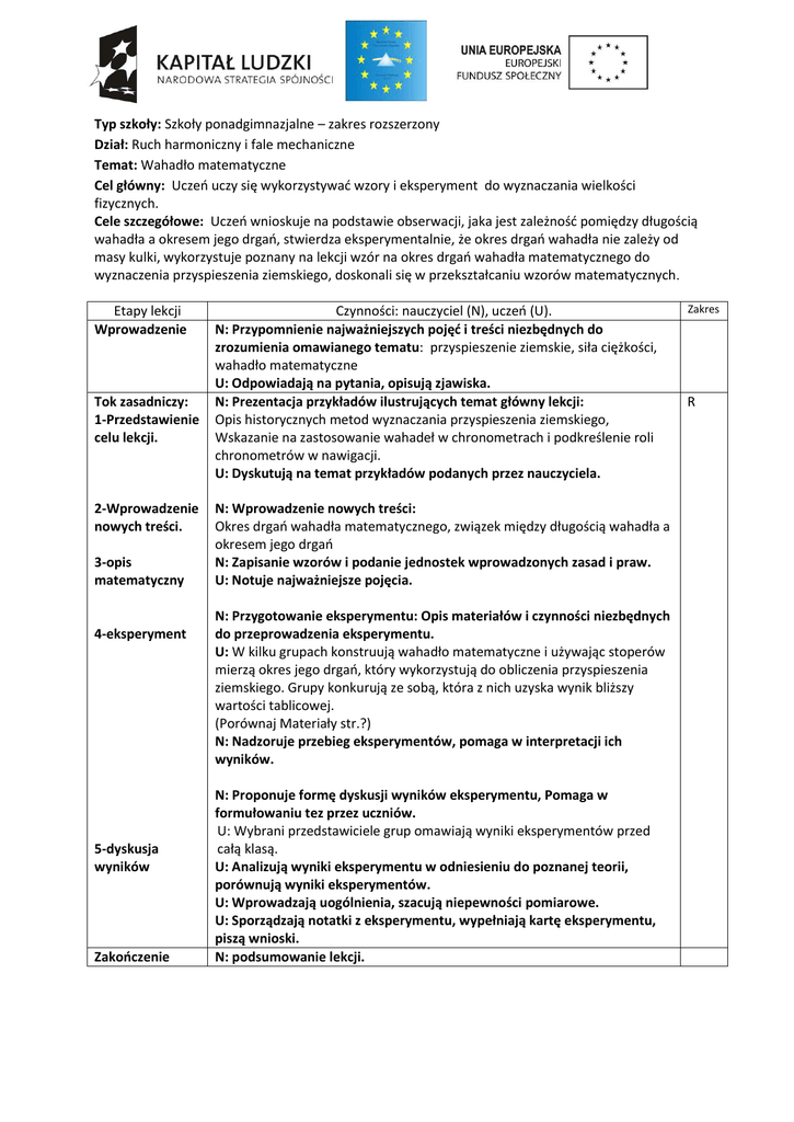 [Wpisz tekst] Typ szkoły: Szkoły ponadgimnazjalne – zakres rozszerzony Dział: Ruch harmoniczny i fale mechaniczne Temat: Wahadło matematyczne Cel główny: Uczeń uczy się wykorzystywać wzory i eksperyment do wyznaczania wielkości fizycznych. Cele szczegółowe: Uczeń wnioskuje na podstawie obserwacji, jaka jest zależność pomiędzy długością wahadła a okresem jego drgań, stwierdza eksperymentalnie, że okres drgań wahadła nie zależy od masy kulki, wykorzystuje poznany na lekcji wzór na okres drgań wahadła matematycznego do wyznaczenia przyspieszenia ziemskiego, doskonali się w przekształcaniu wzorów matematycznych. Etapy lekcji Wprowadzenie Tok zasadniczy: 1-Przedstawienie celu lekcji. 2-Wprowadzenie nowych treści. 3-opis matematyczny 4-eksperyment 5-dyskusja wyników Zakończenie Czynności: nauczyciel (N), uczeń (U). N: Przypomnienie najważniejszych pojęć i treści niezbędnych do zrozumienia omawianego tematu: przyspieszenie ziemskie, siła ciężkości, wahadło matematyczne U: Odpowiadają na pytania, opisują zjawiska. N: Prezentacja przykładów ilustrujących temat główny lekcji: Opis historycznych metod wyznaczania przyspieszenia ziemskiego, Wskazanie na zastosowanie wahadeł w chronometrach i podkreślenie roli chronometrów w nawigacji. U: Dyskutują na temat przykładów podanych przez nauczyciela. N: Wprowadzenie nowych treści: Okres drgań wahadła matematycznego, związek między długością wahadła a okresem jego drgań N: Zapisanie wzorów i podanie jednostek wprowadzonych zasad i praw. U: Notuje najważniejsze pojęcia. N: Przygotowanie eksperymentu: Opis materiałów i czynności niezbędnych do przeprowadzenia eksperymentu. U: W kilku grupach konstruują wahadło matematyczne i używając stoperów mierzą okres jego drgań, który wykorzystują do obliczenia przyspieszenia ziemskiego. Grupy konkurują ze sobą, która z nich uzyska wynik bliższy wartości tablicowej. (Porównaj Materiały str.?) N: Nadzoruje przebieg eksperymentów, pomaga w interpretacji ich wyników. N: Proponuje formę dyskusji wyników eksperymentu, Pomaga w formułowaniu tez przez uczniów. U: Wybrani przedstawiciele grup omawiają wyniki eksperymentów przed całą klasą. U: Analizują wyniki eksperymentu w odniesieniu do poznanej teorii, porównują wyniki eksperymentów. U: Wprowadzają uogólnienia, szacują niepewności pomiarowe. U: Sporządzają notatki z eksperymentu, wypełniają kartę eksperymentu, piszą wnioski. N: podsumowanie lekcji. Zakres R [Wpisz tekst] Karta eksperymentu Temat eksperymentu Instrukcja wykonania Wyznaczanie przyspieszenia ziemskiego za pomocą wahadła matematycznego. - Mierzymy linijką długość wahadła (od punktu zaczepienia do środka kulki). Wychylamy wahadło o mały kąt i mierzymy czas trwania 20 okresów. Pomiary powtarzamy przynajmniej 3 razy. - Wyznaczamy jeden okres drgań wahadła i wyznaczamy przyspieszenie ziemskie posługując się wzorem na okres drgań wahadła matematycznego. - Powtarzamy procedurę dla wahadła z cięższą kulką wychylając ją o taki sam kąt. - Następnie skracamy długość wahadła i powtarzamy pomiar 20 okresów dla lżejszej i cięższej kulki. Podobnie jak poprzednio, na podstawie uzyskanych wyników wyznaczamy przyspieszenie ziemskie. (Porównaj: Materiały str.?) Obserwacje (opisujemy w punktach przebieg eksperymentu: przyczyna skutek) Szacujemy błędy i niepewności pomiaru Wnioski (odniesienie do teorii)