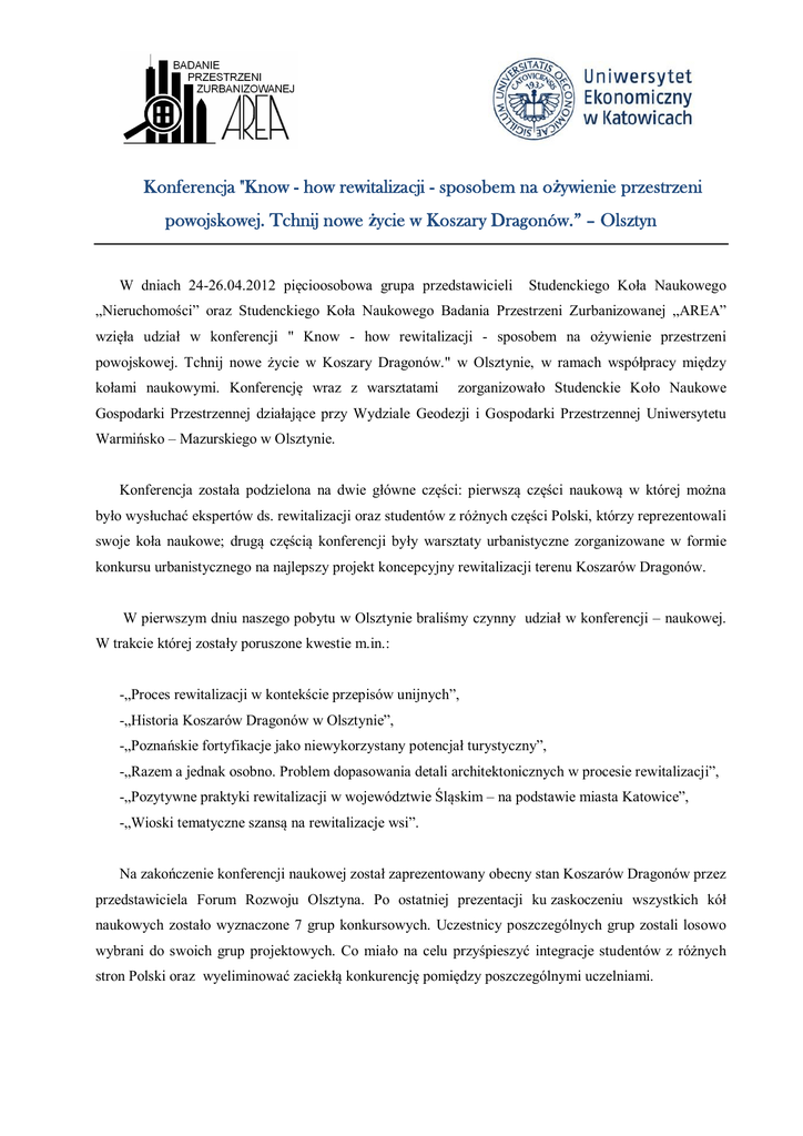 Konferencja "Know - how rewitalizacji - sposobem na ożywienie przestrzeni powojskowej. Tchnij nowe życie w Koszary Dragonów.” – Olsztyn W dniach 24-26.04.2012 pięcioosobowa grupa przedstawicieli Studenckiego Koła Naukowego „Nieruchomości” oraz Studenckiego Koła Naukowego Badania Przestrzeni Zurbanizowanej „AREA” wzięła udział w konferencji " Know - how rewitalizacji - sposobem na ożywienie przestrzeni powojskowej. Tchnij nowe życie w Koszary Dragonów." w Olsztynie, w ramach współpracy między kołami naukowymi. Konferencję wraz z warsztatami zorganizowało Studenckie Koło Naukowe Gospodarki Przestrzennej działające przy Wydziale Geodezji i Gospodarki Przestrzennej Uniwersytetu Warmińsko – Mazurskiego w Olsztynie. Konferencja została podzielona na dwie główne części: pierwszą części naukową w której można było wysłuchać ekspertów ds. rewitalizacji oraz studentów z różnych części Polski, którzy reprezentowali swoje koła naukowe; drugą częścią konferencji były warsztaty urbanistyczne zorganizowane w formie konkursu urbanistycznego na najlepszy projekt koncepcyjny rewitalizacji terenu Koszarów Dragonów. W pierwszym dniu naszego pobytu w Olsztynie braliśmy czynny udział w konferencji – naukowej. W trakcie której zostały poruszone kwestie m.in.: -„Proces rewitalizacji w kontekście przepisów unijnych”, -„Historia Koszarów Dragonów w Olsztynie”, -„Poznańskie fortyfikacje jako niewykorzystany potencjał turystyczny”, -„Razem a jednak osobno. Problem dopasowania detali architektonicznych w procesie rewitalizacji”, -„Pozytywne praktyki rewitalizacji w województwie Śląskim – na podstawie miasta Katowice”, -„Wioski tematyczne szansą na rewitalizacje wsi”. Na zakończenie konferencji naukowej został zaprezentowany obecny stan Koszarów Dragonów przez przedstawiciela Forum Rozwoju Olsztyna. Po ostatniej prezentacji ku zaskoczeniu wszystkich kół naukowych zostało wyznaczone 7 grup konkursowych. Uczestnicy poszczególnych grup zostali losowo wybrani do swoich grup projektowych. Co miało na celu przyśpieszyć integracje studentów z różnych stron Polski oraz wyeliminować zaciekłą konkurencję pomiędzy poszczególnymi uczelniami. Po zakończeniu konferencji pierwszego mieliśmy dnia przyjemność zintegrowania się (na terenie malowniczego kampusu studenckiego ) z przedstawicielami kół naukowych tj.: - Studenckie Koło Naukowe Gospodarki Przestrzennej/ UWM Olsztyn - Studenckie Koło Naukowe Gospodarki Przestrzennej/ SGGW Warszawa - Studenckie Koło Naukowe Gospodarki Przestrzennej/ UE Poznań - Studenckie Koło Naukowe Gospodarki Nieruchomościami/ UWM Olsztyn - Studenckie Koło Naukowe Architektów Krajobrazu „Horyzont”/ UWM Olsztyn W drugim dniu konferencji wraz z całą grupą 28 studentów poszliśmy na inwentaryzacje terenu Koszarów Dragonów. Był to pierwszy dzień warsztatowy. Inwentaryzacja terenu byłych Koszarów Dragonów była bardzo ciekawa i pouczająca (szkoda tylko, że pogoda nie dopisała – jednak dobrze, że nie padało). Przewodnikiem oraz opiekunem inwentaryzacji zdegradowanego terenu znajdującego się ścisłym centrum Olsztyna był Pan Rafał Bętkowski autor wielu publikacji historycznych oraz książki pt.: „ Dragoni z Olsztyna”. Inwentaryzacja Stan istniejący obszaru konkursowego – Koszary Dragonów Po inwentaryzacji siedem grup projektowych w budynku wydziału Geodezji i Gospodarki Przestrzennej rozpoczęło proces myślowo – manualny, tworząc tym samym swoje oryginalne koncepcje urbanistyczne dla wydzielonego obszaru Koszarów Dragonów. Proces ten jednak nie był tak łatwy jak by się mogło wydawać, ponieważ organizatorzy konkursu wysoko postawili poprzeczkę przygotowując szczegółowe wytyczne do projektu, które obejmowały m. in.: zaproponowanie przynajmniej 3-5 lub większej liczby trafnych rozwiązań programowo – projektowych, prowadzących do kierunku włączenia obszaru opracowania w ścisłe centrum miast; zaproponowania rozwiązań komunikacyjnych dla obszaru opracowania, w tym rozwiązań w zakresie połączenia z pozostałą, zawłaszcza centralną częścią miasta (zaproponowanie rozwiązania „przejścia” przez ul. „Nową” Artyleryjską); zaprojektowanie dziedzińców na terenie koszar (precyzyjne rozwiązania) itp.. Oczywiście cały projekt musiał być zgodny z istniejącymi i obowiązującymi dokumentami planistycznymi oraz ochroną konserwatorską, jak również należało uwzględnić głos lokalnej społeczności. Jak widać zadanie postawione przed studentami nie było proste. Potwierdzeniem na to są słowa Pani architekt miasta - Magdaleny Rafalskiej, która zasiadała w jury - przed ogłoszeniem werdyktu przyznała, że jest zaskoczona tak wysokim poziomem zaangażowania w projekty jak i ich wynikiem. Pomysłów było wiele. Przewijającym się motywem w kilku koncepcjach było stworzenie centrum kulturalno-rozrywkowego. Prawie wszystkie grupy zaproponowały, aby na terenie koszar powstała coś w rodzaju muzeum, które miałoby przedstawiać jak koszary wyglądały kiedyś i jakie było ich pierwotne przeznaczenie. Ważnym aspektem było również zrekonstruowanie historycznego wyglądu budynków. Ciekawym pomysłem było także umieszczenie na terenie koszar pracowni artystycznych, czy kina samochodowego. Jednym słowem wszelkie obiekty, które mogłyby przyciągnąć mieszkańców Olsztyna i nie tylko, niezależnie od grupy wiekowej. Jednym z zadań było również zagospodarowanie dziedzińców. Ciekawy pomysł, który został doceniony przez jury, zakładał nadanie indywidualnego charakteru każdemu z czterech dziedzińców poprzez kolor. Do każdego placu przypisana była jedna barwa, która miała być wyrażana odpowiednio dobranymi kwiatami czy oświetleniem. W celu usprawnienia komunikacji zaproponowano kładkę pieszorowerową nad torami kolejowymi oraz wprowadzenie kilku przystanków autob