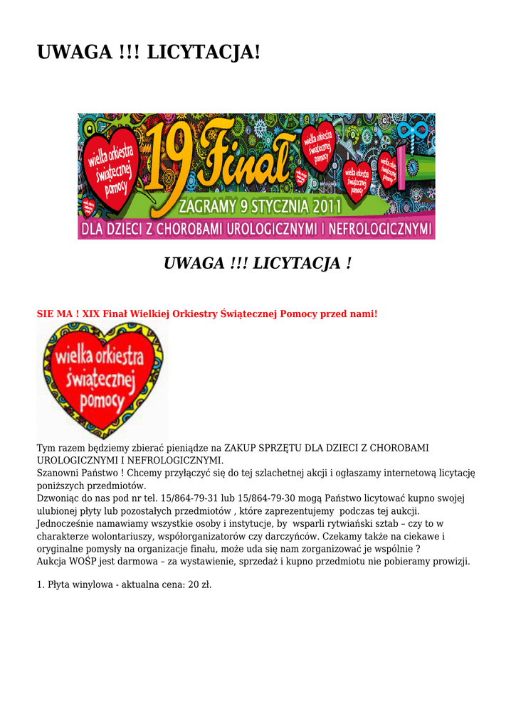 UWAGA !!! LICYTACJA! UWAGA !!! LICYTACJA ! SIE MA ! XIX Finał Wielkiej Orkiestry Świątecznej Pomocy przed nami! Tym razem będziemy zbierać pieniądze na ZAKUP SPRZĘTU DLA DZIECI Z CHOROBAMI UROLOGICZNYMI I NEFROLOGICZNYMI. Szanowni Państwo ! Chcemy przyłączyć się do tej szlachetnej akcji i ogłaszamy internetową licytację poniższych przedmiotów. Dzwoniąc do nas pod nr tel. 15/864-79-31 lub 15/864-79-30 mogą Państwo licytować kupno swojej ulubionej płyty lub pozostałych przedmiotów , które zaprezentujemy podczas tej aukcji. Jednocześnie namawiamy wszystkie osoby i instytucje, by wsparli rytwiański sztab – czy to w charakterze wolontariuszy, współorganizatorów czy darczyńców. Czekamy także na ciekawe i oryginalne pomysły na organizacje finału, może uda się nam zorganizować je wspólnie ? Aukcja WOŚP jest darmowa – za wystawienie, sprzedaż i kupno przedmiotu nie pobieramy prowizji. 1. Płyta winylowa - aktualna cena: 20 zł. 2. Płyta winylowa - aktualna cena: 20 zł. 3. Płyta winylowa - aktualna cena: 20 zł. 4. Płyta winylowa - aktualna cena: 20 zł. 5. Płyta winylowa - aktualna cena: 20 zł. 6. Płyta winylowa - aktualna cena: 20 zł. 7. Płyta winylowa - aktualna cena: 20 zł. 8. Płyta winylowa - aktualna cena: 20 zł. 9. Płyta winylowa - aktualna cena: 20 zł. Gmina Rytwiany - www.rytwiany.com.pl