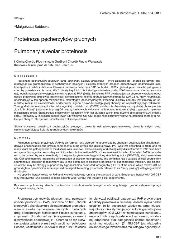 Postępy Nauk Medycznych, t. XXIV, nr 4, 2011 ©Borgis *Małgorzata Sobiecka Proteinoza pęcherzyków płucnych Pulmonary alveolar proteinosis I Klinika Chorób Płuc Instytutu Gruźlicy i Chorób Płuc w Warszawie Kierownik Kliniki: prof. dr hab. med. Jan Kuś Streszczenie Proteinoza pęcherzyków płucnych (ang. pulmonary alveolar proteinosis – PAP) zaliczana do „chorób sierocych” charakteryzuje się gromadzeniem w pęcherzykach płucnych i niekiedy drobnych drogach oddechowych nadmiernych ilości fosfolipidów i białek surfaktantu. Pierwsza publikacja dotycząca PAP pochodzi z 1958 r., jednak przez wiele lat patogeneza choroby pozostawała nieznana. Wyróżnia się trzy klinicznie i etiologicznie różne postaci PAP (wrodzona, wtórna i samoistna), jednak najczęściej występuje samoistna postać PAP (90%). Samoistna PAP uważana jest za chorobę wywołaną obecnością przeciwciał przeciwko czynnikowi stymulującemu kolonie granulocytów/makrofagów (GM-CSF), który neutralizują, upośledzając w ten sposób różnicowanie makrofagów pęcherzykowych. Przebieg kliniczny choroby jest zmienny od samoistnej remisji do niewydolności oddechowej i zgonu z powodu postępującej choroby lub współistniejącego zakażenia. Tomografia komputerowa płuc techniką wysokiej rozdzielczości (TKWR) uwidacznia charakterystyczny dla tej choroby obraz „kostki brukowej” (pogrubienie przegród międzyzrazikowych widoczne na tle obrazu matowej szyby) o geograficznym rozmieszczeniu zmian. Standardowo stosowanym leczeniem PAP jest płukanie całych płuc dużymi objętościami 0,9% chlorku sodu. Podawany w iniekcjach podskórnych lub wziewnie GM-CSF może mieć korzystny wpływ na przebieg choroby u niektórych chorych, ale stanowi nadal leczenie eksperymentalne. Słowa kluczowe: proteinoza pęcherzyków płucnych, płukanie oskrzelowo-pęcherzykowe, płukanie całych płuc, czynnik stymulujący kolonie granulocytów/makrofagów Summary Pulmonary alveolar proteinosis (PAP) is an “orphan lung disorder” characterized by abundant accumulation of surfactantderived phospholipids and protein components in the alveoli and distal airways. PAP was first described in 1958, and for many years the pathogenesis of the disease was unknown. Three clinically and etiologically distinct forms of PAP have been recognized (congenital, secondary and idiopathic), but more then 90% of the cases are idiopathic. Idiopathic PAP is considered to be caused by an autoantibody to the granulocyte-macrophage colony stimulating factor (GM-CSF), which neutralizes GM-CSF and therefore impairs the differentiation of alveolar macrophages. The condition has a variable clinical course from spontaneous resolution to respiratory failure and death due to disease progression or superimposed infection. The diagnosis of PAP may be strongly supported by high-resolution computed tomography (HRCT) of the chest, which reveals diffuse ground-glass opacification superimposed on septal thickening (commonly referred to as “crazy paving”) with geographical distribution. No specific therapy exists for PAP and whole lung lavage remains the standard of care. Exogenous therapy with GM-CSF may improve the lung disease in some patients with PAP but this therapy is still experimental. Key words: pulmonary alveolar proteinosis, bronchoalveolar lavage, whole lung lavage, granulocyte/macrophage colony-stimulating factor Proteinoza pęcherzyków płucnych (ang. pulmonary alveolar proteinosis – PAP), zaliczana do tzw. „chorób sierocych”, charakteryzuje się nadmiernym gromadzeniem w świetle pęcherzyków płucnych i dystalnych dróg oddechowych fosfolipidów i białek surfaktantu, co prowadzi do zaburzeń wymiany gazowej, a czasami niewydolności oddechowej (1). Choroba po raz pierwszy została opisana przez trzech wybitnych patologów Rosena, Castelmana i Liebowa w 1958 r. (2). Od czasu tej pierwszej publikacji patogeneza PAP prawie przez 4 dekady pozostawała nieznana. Jednak wyniki badań ostatnich 10 lat dostarczyły wiedzy na temat kluczowej roli czynnika stymulującego kolonie granulocytów/ /makrofagów (GM-CSF) w homeostazie surfaktantu, reakcjach obronnych układu oddechowego, wrodzonej odporności oraz patogenezie chorób zapalnych i autoimmunologicznych (3). GM-CSF jest niezbędny do końcowego różnicowania makrofagów pęcherzyko311 Małgorzata Sobiecka wych w płucach oraz do regulowania podstawowych funkcji krążących granulocytów obojętnochłonnych (4, 5). PAP obejmuje niejednorodną grupę schorzeń, różniących się etiologią, patogenezą, przebiegiem klinicznym, rokowaniem i możliwościami leczenia, w których dochodzi do zaburzeń produkcji surfaktantu lub jego usuwania. Obecnie wyróżniamy trzy różne pos t a c i P A P. N a j c z ę ś c i e j o b s e r w u j e m y schorzenia związane z zaburzeniem u s u w a n i a s u r f a k t a n t u: p o s t a ć n a b y t ą l u b t y p u d o r o s ł y c h, z w a n ą t a k ż e i d i o p a t y c z n ą (90% p r z y p a d k ó w), spowodowaną zakłóceniami przekaźnictwa sygnałowego GM-CSF lub p o s t a ć w t ó r n ą, również zazwyczaj występującą u osób dorosłych, a rozwijającą się w przebiegu innych chorób lub ekspozycji wpływających na zmniejszenie liczby lub zaburzenia czynności makrofagów pęcherzykowych (mniej niż 10% przypadków) (1, 6, 7). Znacznie rzadziej mamy do czynienia z zaburzeniami produkcji surfaktantu, jak w postaciach wrodzonych PAP, spowodowanych mutacjami w genach kodujących białka surfaktantu SP-B, SP-C lub białko transportujące lipidy ABCA3, a rozwijających się w okresie noworodkowym i prowadzących do poważnych zaburzeń oddychania (ok. 2% przypadków) (6, 7). W dalszej części artykułu omówiona zostanie przede wszystkim postać idiopatyczna PAP, związana z zaburzeniem przekaźnictwa sygnałowego GM-CSF. PATOGENEZA Surfaktant, będący mieszaniną fosfolipidów (90%) i towarzyszących białek surfaktantowych (hy
