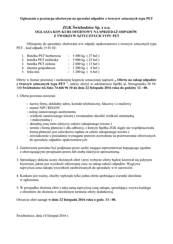 Ogłoszenie o przetargu ofertowym na sprzedaż odpadów z tworzyw sztucznych typu PET ZGK Świebodzice Sp. z o.o. OGŁASZA KON KURS OFERTOWY NA SPRZEDAŻ ODPADÓW Z TWORZYW SZTUCZNYCH TYPU PET Oferujemy do sprzedaży zbelowane n/w odpady opakowaniowe z tworzyw sztucznych typu PET – kod odpadu 15 01 02: 1. 2. 3. 4. 5. Butelka PET bezbarwna butelka PET niebieska butelka PET zielona chemia gospodarcza folia mix - 5 400 kg 5 000 kg 2 600 kg 1 200 kg 1 200 kg ( 27 bel ) ( 25 bel ) ( 13 bel ) ( 6 bel ) ( 6 bel ) Oferty w formie pisemnej i zamkniętej kopercie oznaczonej napisem „ Oferta na zakup odpadów z tworzyw sztucznych typu PET ”, należy złożyć w sekretariacie Spółki ul. Strzegomska 30 58160 Świebodzice tel./faks 74 666 96 10 do dnia 22 listopada 2016 roku do godziny 12 : 00. 1. Oferta powinna zawierać: - nazwę firmy, dokładny adres, kontakt telefoniczny, faksowy i e-mailowy - numer NIP i REGON - rodzaj zamawianego asortymentu - wielkość zamówionego towaru ( ewentualnie określić wielkość minimalną i maksymalną ) - aktualną cenę netto (dotyczy całości zakupionego towaru ) - termin i formę płatności ( dla odbiorcy, z którym Spółka ZGK nigdy nie współpracowała formą płatności jest zaliczkowa zapłata za całość zakupionego towaru ) - oświadczenie o posiadaniu wymagane prawem zezwolenia na przetwarzanie oferowanych do sprzedaży odpadów opakowaniowych. 2. Zamówienie powinno być podpisane przez osoby mogące reprezentować kupującego zgodnie z obowiązującymi przepisami prawa lub osobę należycie upoważnioną. 3. Sprzedający dokona oceny złożonych ofert i przy wyborze oferty będzie kierował się jedynym kryterium, jakim jest wysokość oferowanej ceny za zakup całości odpadów. Wygrywa najwyższa cena zakupu wszystkich zaoferowanych do sprzedaży w/w surowców. 4. Konkurs jest ważny, choćby wpłynęła tylko jedna oferta spełniająca warunki określone w ogłoszeniu. 5. W przypadku złożenia ofert z taką samą najwyższą ceną zakupu, sprzedający wzywa każdego z oferentów do złożenia w określonym terminie oferty dodatkowej. Otwarcie ofert nastąpi w dniu 22 listopada 2016 roku o godz. 13 : 00. Świebodzice, dnia 14 listopad 2016 r.