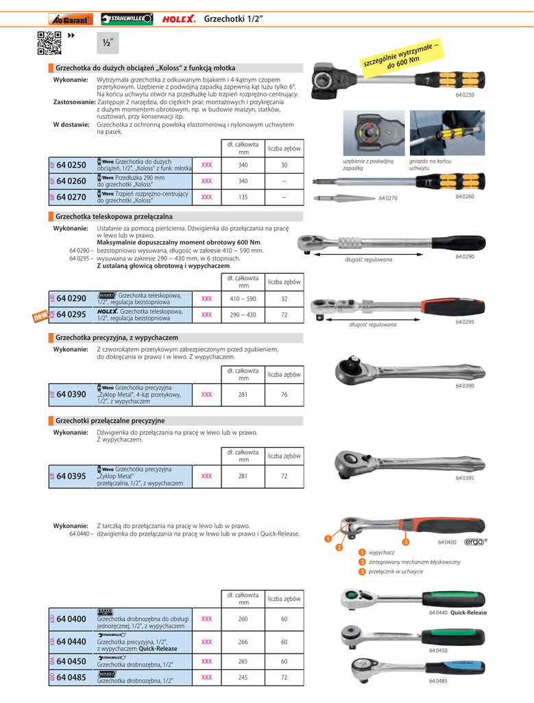 Grzechotki 1/2″ ▶▶ ▶▶ ymałe wytrz e i n l m gó szcze do 600 N Grzechotka do dużych obciążeń „Koloss“ z funkcją młotka − Wykonanie: 63F 64 0250 63F 64 0260 63F Wytrzymała grzechotka z odkuwanym bijakiem i 4-kątnym czopem przetykowym. Uzębienie z podwójną zapadką zapewnia kąt luzu tylko 6°. Na końcu uchwytu otwór na przedłużkę lub trzpień rozprężno-centrujący. Zastosowanie: Zastępuje 2 narzędzia, do ciężkich prac montażowych i przykręcania z dużym momentem obrotowym, np. w budowie maszyn, statków, rusztowań, przy konserwacji itp. W dostawie: Grzechotka z ochronną powłoką elastomerową i nylonowym uchwytem na pasek. 64 0270 Grzechotka do dużych obciążeń, 1/2″, „Koloss“ z funk. młotka Przedłużka 290 mm do grzechotki „Koloss“ Trzpień rozprężno-centrujący do grzechotki „Koloss“ dł. całkowita mm liczba zębów XXX 340 30 XXX 340 − XXX 135 − 64 0250 uzębienie z podwójną zapadką gniazdo na końcu uchwytu 64 0260 64 0270 Grzechotka teleskopowa przełączalna Wykonanie: 63O 64 0290 62A Ustalanie za pomocą pierścienia. Dźwigienka do przełączania na pracę w lewo lub w prawo. Maksymalnie dopuszczalny moment obrotowy 600 Nm. 64 0290 – bezstopniowo wysuwana, długość w zakresie 410 − 590 mm. 64 0295 – wysuwana w zakresie 290 − 430 mm, w 6 stopniach. Z ustalaną głowicą obrotową i wypychaczem. 64 0295 Grzechotka teleskopowa, 1/2″, regulacja bezstopniowa Grzechotka teleskopowa, 1/2", regulacja bezstopniowa dł. całkowita mm liczba zębów XXX 410 − 590 32 XXX 290 − 430 72 64 0290 długość regulowana 64 0295 długość regulowana Grzechotka precyzyjna, z wypychaczem 63F Wykonanie: 64 0390 Z czworokątem przetykowym zabezpieczonym przed zgubieniem, do dokręcania w prawo i w lewo. Z wypychaczem. Grzechotka precyzyjna „Zyklop Metal“, 4-kąt przetykowy, 1/2″, z wypychaczem dł. całkowita mm liczba zębów 281 76 64 0390 XXX Grzechotki przełączalne precyzyjne 63F Wykonanie: 64 0395 Dźwigienka do przełączania na pracę w lewo lub w prawo. Z wypychaczem. Grzechotka precyzyjna „Zyklop Metal“ przełączalna, 1/2″, z wypychaczem XXX dł. całkowita mm liczba zębów 281 72 Wykonanie: Z tarczką do przełączania na pracę w lewo lub w prawo. 64 0440 – dźwigienka do przełączania na pracę w lewo lub w prawo i Quick-Release. 64 0395 •• 1 2 •• • 1 wypychacz • 3 64 0400 2 zintegrowany mechanizm błyskawiczny 3 przełącznik w uchwycie dł. całkowita mm liczba zębów 64 0440 Quick-Release Grzechotka precyzyjna, 1/2″, z wypychaczem Quick-Release XXX 266 60 265 60 245 72 63U 60 63A 260 64 0440 63A XXX 64 0450 Grzechotka drobnozębna, 1/2″ XXX 63O Grzechotka drobnozębna do obsługi jednoręcznej, 1/2″, z wypychaczem 64 0400 64 0485 Grzechotka drobnozębna, 1/2″ XXX 64 0450 64 0485 Grzechotki / złączki 1/2″ ▶▶ Grzechotka przełączalna, precyzyjna, z obrotową głowicą 63F Wykonanie: 64 0490 Obrotowa głowica grzechotki z ustalonymi położeniami 0° (zastosowanie jak wkrętak) oraz 75° i 90° z obu stron. Kąt roboczy 5°, z wypychaczem i tarczką do przełączania na pracę w prawo lub w lewo. Grzechotka precyzyjna „Zyklop“, przełączalna, 1/2″, z głowicą obrotową i wypychaczem XXX dł. całkowita mm liczba zębów 277 72 64 0490 głowica obrot. Grzechotka przełączalna precyzyjna, z pokrętłem 63V Wykonanie: 64 0495 Przy stosowaniu tradycyjnym − kąt roboczy 6°, przy stosowaniu pokrętła − kąt roboczy 0°. Z wypychaczem i tarczką przełączającą tryb pracy w prawo lub w lewo. Grzechotka przełączalna, precyzyjna, 1/2″, z pokrętłem i wypychaczem dł. całkowita mm liczba zębów 300 60 uchwyt XXX Grzechotka przekładana 66A Wykonanie: 64 0520 64 0495 Z przetykanym czworokątem do zmiany kierunku pracy w prawo lub w lewo. dł. całkowita liczba mm zębów XXX Grzechotka przekładana, 1/2″ 270 30 64 0520 Grzechotka przekładana z krótką rączką, bez luzów 62A Zastosowanie: Szczególnie do pracy w trudno dostępnych miejscach, luz 0°. Z 4-kątem przetykowym zabezpieczonym przed zgubieniem, do dokręcania w prawo i w lewo. dł. całkowita mm Grzechotka przekładana XXX 115 64 0720 z krótkim chwytem, 1/2″ 64 0720 Przeguby obrotowe Wykonanie: Czop obracany o 180°. Uchwyt z 2 rodzajów materiału. 64 1200 63A dł. całkowita 64 1200 mm Przeguby obrotowe, 1/2″ 396 468 610 XXX XXX XXX Klucz do nakrętek do kół, rozsuwany 63O Wykonanie: 64 1220 64 1220 Bardzo stabilny model, kuty matrycowo. Wysuwany w zakresie 303 − 535 mm. Klucz do nakrętek do kół, rozsuwany, 1/2″ 303 − 535 mm XXX Korba 63A Norma: Wykonanie: 64 1800 DIN 3122-B 12,5. Promień roboczy 105 mm. dł. całkowita mm XXX Korba, 1/2″ 64 1800 456 Przetyczki Norma: DIN 3122-A 12,5. Wykonanie: Przetyczki z przesuwanym czopem. 64 1350 – dzięki blokadzie Quick-Release uzyskuje się zabezpieczenie przeciw niepożądanemu poluzowaniu i zagubieniu nasadki lub końcówki. 64 1330 64 1300 62A 63A 61A 64 1330 64 1300 64 1320 63A dł. całkowita mm 64 1350 Przetyczka, 1/2″ Przetyczka, 1/2″ Przetyczka, 1/2″ Przetyczka, 1/2″, Quick-Release XXX 300 XXX 300 XXX 300 XXX 300 64 1320 64 1350 Quick-Release Trzpienie i gniazda 1/2″ Norma: Pasuje do: Wykonanie: 4-kątne czopy wg DIN 3120-A 12,5 z zatrzaskiem kulkowym. Nasadek ręcznych. Odpowiedni dobór materiałów i specjalny proces kucia gwarantują optymalne funkcjonowanie i trwałość. GARANT: Stopowa stal chromowa, powierzchnia chromowana (niełuszcząco). STAHLWILLE: Stopowa stal chromowa, powierzchnia chromowana niełuszcząco na podłożu niklowym. WERA: Stal chromowo-molibdenowa, powierzchnia chromowana na matowo. KOKEN / HOLEX: Stal chromowo-wanadowa, powierzchnia chromowana. 64 0030 Grzechotki 2-kierunkowe D10 DIN 3122-D 12,5. Z dźwigienką do przełączania na działanie lewo- i prawoskrętne. 64 0025 XXX 263 40 XXX 266 36 380 36 61A 36 61A 265 Grzechotka przełączalna, 1/2″ 64 0025 Grzechotk