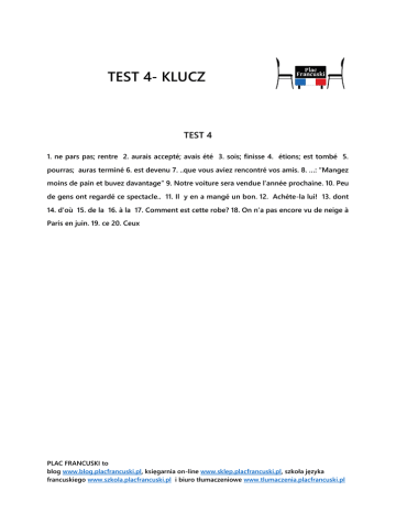 TEST 4- KLUCZ TEST 4 1. ne pars pas; rentre 2. aurais accepté; avais été 3. sois; finisse 4. étions; est tombé 5. pourras; auras terminé 6. est devenu 7. ..que vous aviez rencontré vos amis. 8. …: “Mangez moins de pain et buvez davantage” 9. Notre voiture sera vendue l’année prochaine. 10. Peu de gens ont regardé ce spectacle.. 11. Il y en a mangé un bon. 12. Achète-la lui! 13. dont 14. d’où 15. de la 16. à la 17. Comment est cette robe? 18. On n’a pas encore vu de neige à Paris en juin. 19. ce 20. Ceux PLAC FRANCUSKI to blog www.blog.placfrancuski.pl, księgarnia on-line www.sklep.placfrancuski.pl, szkoła języka francuskiego www.szkola.placfrancuski.pl i biuro tłumaczeniowe www.tlumaczenia.placfrancuski.pl