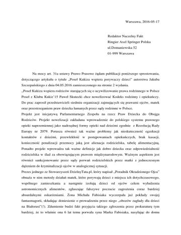 Warszawa, 2016-05-17 Redaktor Naczelny Fakt Ringier Axel Springer Polska ul.Domaniewska 52 01-999 Warszawa Na mocy art. 31a ustawy Prawo Prasowe żądam publikacji poniższego sprostowania, dotyczącego artykułu o tytule „Poseł Kukiza wspiera porywaczy dzieci” autorstwa Jakuba Szczepańskiego z dnia 04.05.2016 zamieszczonego na stronie 2 wydania. „Poseł Kukiza wspiera rodziców starających się o ucywilizowanie prawa rodzinnego w Polsce Poseł z Klubu Kukiz’15 Paweł Skutecki chce nowelizować Kodeks rodzinny i opiekuńczy. Do prac zaprosił przedstawicieli siedmiu organizacji zajmujących się prawami ojców, matek oraz przestrzeganiem praw dziecka łamanych przez sądy rodzinne w Polsce. Projekt jest inicjatywą Parlamentarnego Zespołu na rzecz Praw Dziecka do Obojga Rodziców. Projekt nowelizacji zakładana wprowadzenie do polskiego systemu prawnego opieki naprzemiennej jako nadrzędnej formy opieki nad dziećmi zgodnie z Rezolucją Rady Europy nr 2079. Porusza również tak ważne problemy jak nieskuteczność egzekucji kontaktów z dziećmi, przewlekłość w postępowaniach opiekuńczych, brak kasacji, konieczność penalizacji przemocy jaką jest alienacja rodzicielska, tabelę alimentacyjną. Ponadto projekt wprowadza tak ważne definicje jak dobro dziecka oraz odpowiedzialność rodzicielska w ślad za obowiązującym prawem międzynarodowym. Ważnym aspektem jest również sankcjonowanie przez sądy porwań rodzicielskich przez matki z jednoczesnym dążeniem do kryminalizacji ojców w analogicznej sytuacji. Prezes jednego ze Stowarzyszeń DzielnyTata.pl, który napisał „Poradnik Okradzionego Ojca” obnaża w nim metody działań matek, które porywają dzieci z miejsca ich dotychczasowego, wspólnego zamieszkania a następnie izolują dzieci od ojców celem wyłudzenia astronomicznych alimentów, zgłaszając fałszywe poczucie zagrożenia coraz bardziej absurdalnymi oskarżeniami. Żona Michała Fabisiaka wyczerpała już pokłady swojej fantasmagorii, składając doniesienie o prowadzeniu przez niego „obozów zagłady dla dzieci na Białorusi”(!). Zdumienie budzi fakt przyjęcia takiego zgłoszenia przez prokuraturę tym bardziej, że to właśnie ona 6 lat temu porwała syna Marka Fabisiaka, nasyłając do domu trzech uzbrojonych policjantów, którzy wycięli zamki, pobili ojca i babcię ojczystą i siłą wyciągnęli dwuletnie dziecko z domu rodzinnego. Pani Magdalena Fabisiak, która prywatnie korzysta z ochrony CBŚ jest zupełnie bezkarna wobec prawa. W jeszcze bardziej drastycznych okolicznościach policja porwała trzyletniego Fabiana Nadolskiego, który został zabrany ojcu przez oddział antyterrorystów na autostradzie A4 w okolicznościach podobnych do działań wojennych. Ojciec Fabiana Sebastian Nadolski został bezprawnie oskarżony o porwanie swojego syna, którego ratował z rąk matki, znęcającej się fizycznie nad dzieckiem za pozwoleniem radomskiego sądu ze względu na swoje powiązania z byłą premier Ewą Kopacz. Sebastian Nadolski nie uczestniczył w pracach zespołu, ponieważ w tym czasie przebywał w areszcie śledczym w Radomiu. Podobnie w pracach zespołu nie uczestniczył Sławomir Dul, prezes Konfederacji Rodziców, która to organizacja jak sama nazwa wskazuje reprezentuje interesy ojców i matek i za cel główny stawia sobie walkę z przemocą instytucjonalną państwa wobec rodziny. Joanna Niciejewska reprezentuje matki - ofiary przemocy domowej, które padły ofiarą sądów rodzinnych i podobnie jak ojcowie są izolowane od swoich dzieci. Jak kilka innych osób aktywnie działających społecznie padła ofiarą prowokacji, stworzonej na potrzeby napisania artykułu przez naszego dziennikarza, który kradnąc tożsamość i zdjęcie innej osoby, założył fałszywy profil na facebooku i namawiał ją do przestępstwa z art. 211 kk i 189 kk. W rozmowie tej wspomniała ona o innej organizacji, która zajmuje się świadczeniem płatnych usług i była zamieszana w porwanie Nel Pająk, o którym to pisał fakt w artykule z dnia 27.01.2016 pt. „Szokujące sceny w szkole. Dzieci zamarły z przerażenia”. Jednocześnie podkreśla, że Stowarzyszenie DzielnyTata i DzielnaMama działa społecznie w kierunku zmian w prawie rodzinnym i nie zajmuje się działalnością zarobkową. Lider ugrupowania Paweł Kukiz (53 l.), odmówił poparcia projektu, bo jak powiedział jego ten problem nie dotyczy, ponieważ od 35 lat jest szczęśliwym małżonkiem. Tym samym zawiódł on swoich wyborców, którym obiecywał obronę ich interesów w ramach państwa obywatelskiego.” Proszę o opublikowanie sprostowania zgodnie z art. 32 Ustawy Prawo prasowe. Z poważaniem Joanna Niciejewska