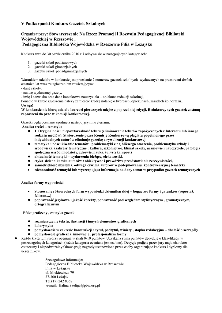 V Podkarpacki Konkurs Gazetek Szkolnych Organizatorzy: Stowarzyszenie Na Rzecz Promocji i Rozwoju Pedagogicznej Biblioteki Wojewódzkiej w Rzeszowie , Pedagogiczna Biblioteka Wojewódzka w Rzeszowie Filia w Leżajsku Konkurs trwa do 30 października 2010 r. i odbywa się w następujących kategoriach: 1. 2. 3. gazetki szkół podstawowych gazetki szkół gimnazjalnych gazetki szkół ponadgimnazjalnych Warunkiem udziału w konkursie jest przesłanie 2 numerów gazetek szkolnych wydawanych na przestrzeni dwóch ostatnich lat wraz ze zgłoszeniem zawierającym: - dane szkoły, - nazwę wydawanej gazety, - imię i nazwisko oraz dane kontaktowe nauczyciela – opiekuna redakcji szkolnej, Ponadto w karcie zgłoszenia należy zamieścić krótką notatkę o twórcach, opiekunach, zasadach kolportażu… Uwaga! W konkursie nie biorą udziału laureaci pierwszych miejsc z poprzedniej edycji. Redaktorzy tych gazetek zostaną zaproszeni do prac w komisji konkursowej. Gazetki będą oceniane zgodnie z następującymi kryteriami: Analiza treści – tematyka 1. Oryginalność i niepowtarzalność tekstu (eliminowanie tekstów zapożyczonych z Internetu lub innego rodzaju mediów). Stwierdzenie przez Komisję Konkursową plagiatu popełnionego przez indywidualnych autorów eliminuje gazetkę z rywalizacji konkursowej tematyka : poszukiwanie tematów i problematyki z najbliższego otoczenia, problematyka szkoły i środowiska, (zakresy tematyczne : kultura, szkolnictwo, klimat szkoły, uczniowie i nauczyciele, patologia społeczna wśród młodzieży, zdrowie, nauka, turystyka, sport) aktualność tematyki – wydarzenia bieżące, ciekawostki, etyka dziennikarska autorów : obiektywne i prawdziwe przedstawianie rzeczywistości, samodzielność myślenia, odwaga cywilna autorów w podejmowaniu kontrowersyjnej tematyki różnorodność tematyki lub wyczerpująca informacja na dany temat w przypadku gazetek tematycznych Analiza formy wypowiedzi Stosowanie różnorodnych form wypowiedzi dziennikarskiej – bogactwo formy i gatunków (reportaż, felieton....) poprawność językowa i jakość korekty, poprawność pod względem stylistycznym , gramatycznym, ortograficznym Efekt graficzny , estetyka gazetki rozmieszczenie tekstu, ilustracji i innych elementów graficznych kolorystyka pomysłowość w zakresie konstrukcji : tytuł, podtytuł, winiety , stopka redakcyjna – dbałość o szczegóły pomysłowość graficzna, innowacje , profesjonalizm formy Każde kryterium jurorzy oceniają w skali 0-10 punktów. Uzyskana suma punktów decyduje o klasyfikacji w poszczególnych kategoriach (każda kategoria oceniana jest osobno). Decyzje podjęte przez jury maja charakter ostateczny i niepodważalny Obowiązują nagrody ustanowione przez osoby organizujące konkurs i dyplomy dla uczestników. Szczegółowe informacje: Pedagogiczna Biblioteka Wojewódzka w Rzeszowie Filia w Leżajsku ul. Mickiewicza 79 37-300 Leżajsk Tel.(17) 242 8352 e-mail: Halina [email protected]